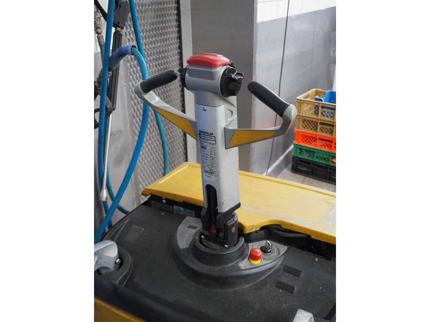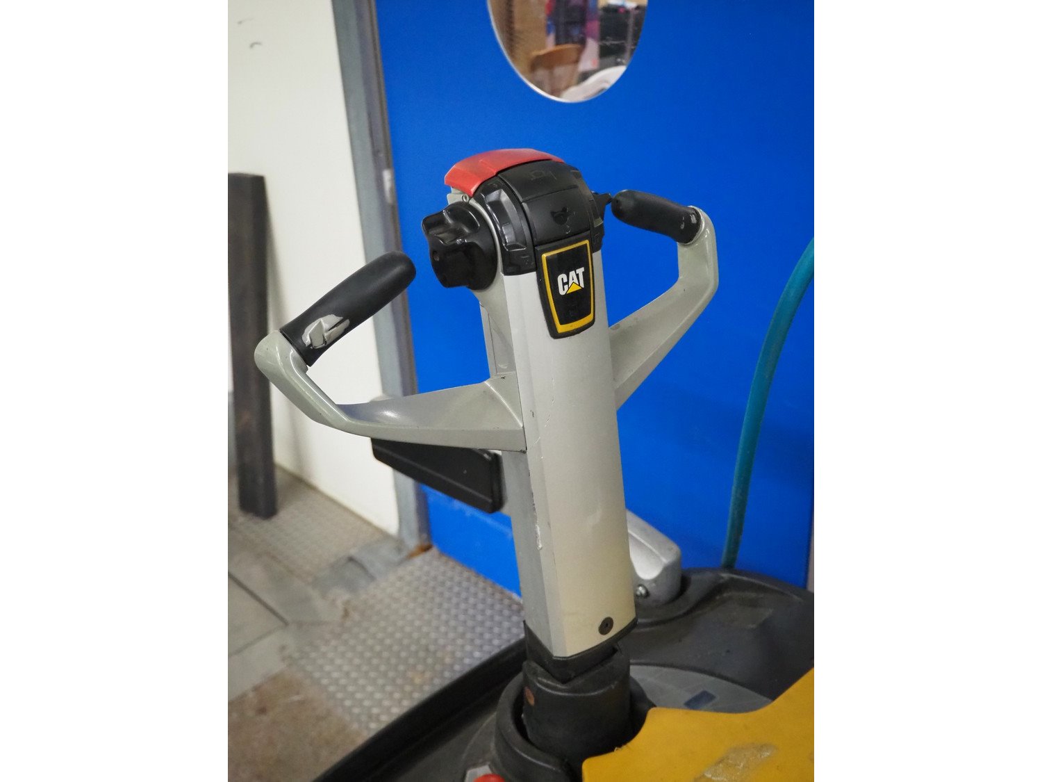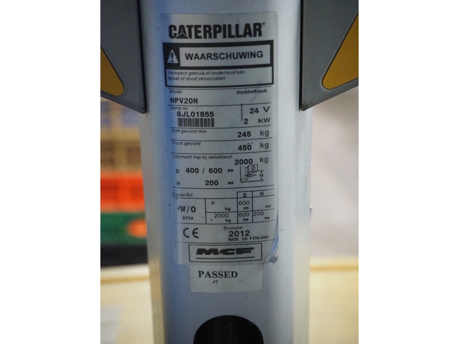 Caterpillar electric forklift, fork length: 1150 mm, total dimensions: 2400 mm x 800 mm x 1500 mm. Including IEB battery charger, type: E 230 G 24/40 B1-FML Puls, dimensions: 360 mm x 240 mm x 240 mm. Kavel locatie: Kaldenkerkerweg 5, 5932 CS Tegelen, Nederland