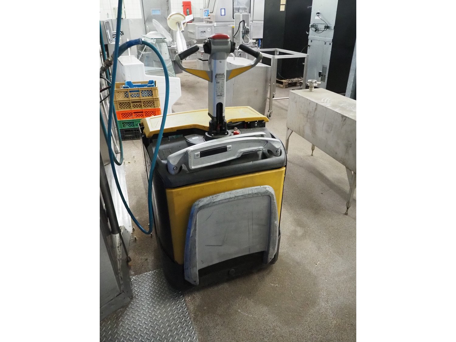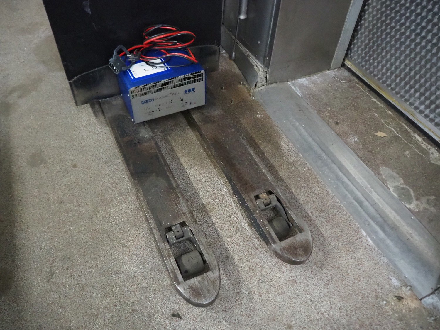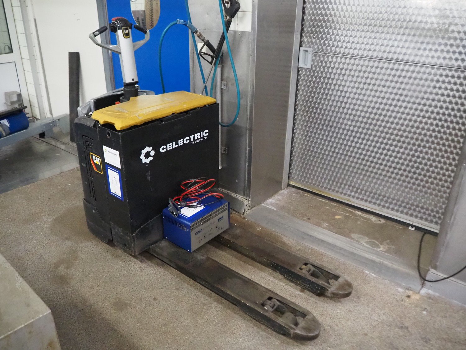Caterpillar electric forklift, fork length: 1150 mm, total dimensions: 2400 mm x 800 mm x 1500 mm. Including IEB battery charger, type: E 230 G 24/40 B1-FML Puls, dimensions: 360 mm x 240 mm x 240 mm. Kavel locatie: Kaldenkerkerweg 5, 5932 CS Tegelen, Nederland