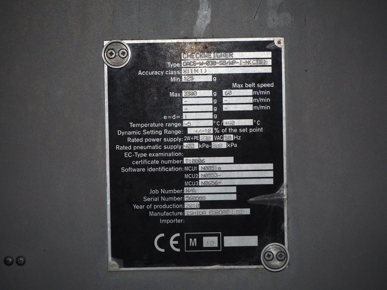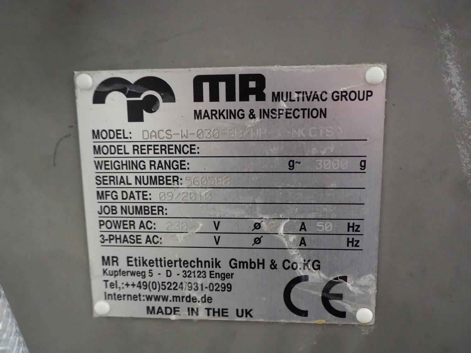 MR checkweigher with rejector, model: DACS-W-030-SB/WP-I-N(CTS), serial number: 560588, year of construction: 09/2010, 230 V, 1 Ph, 50 Hz, 2 A, maximum weight: 3000 g, plastic belt, belt width: 300 mm, total dimensions: 1700 mm x 1000 mm x 1500 mm. Kavel locatie: Kaldenkerkerweg 5, 5932 CS Tegelen, Nederland