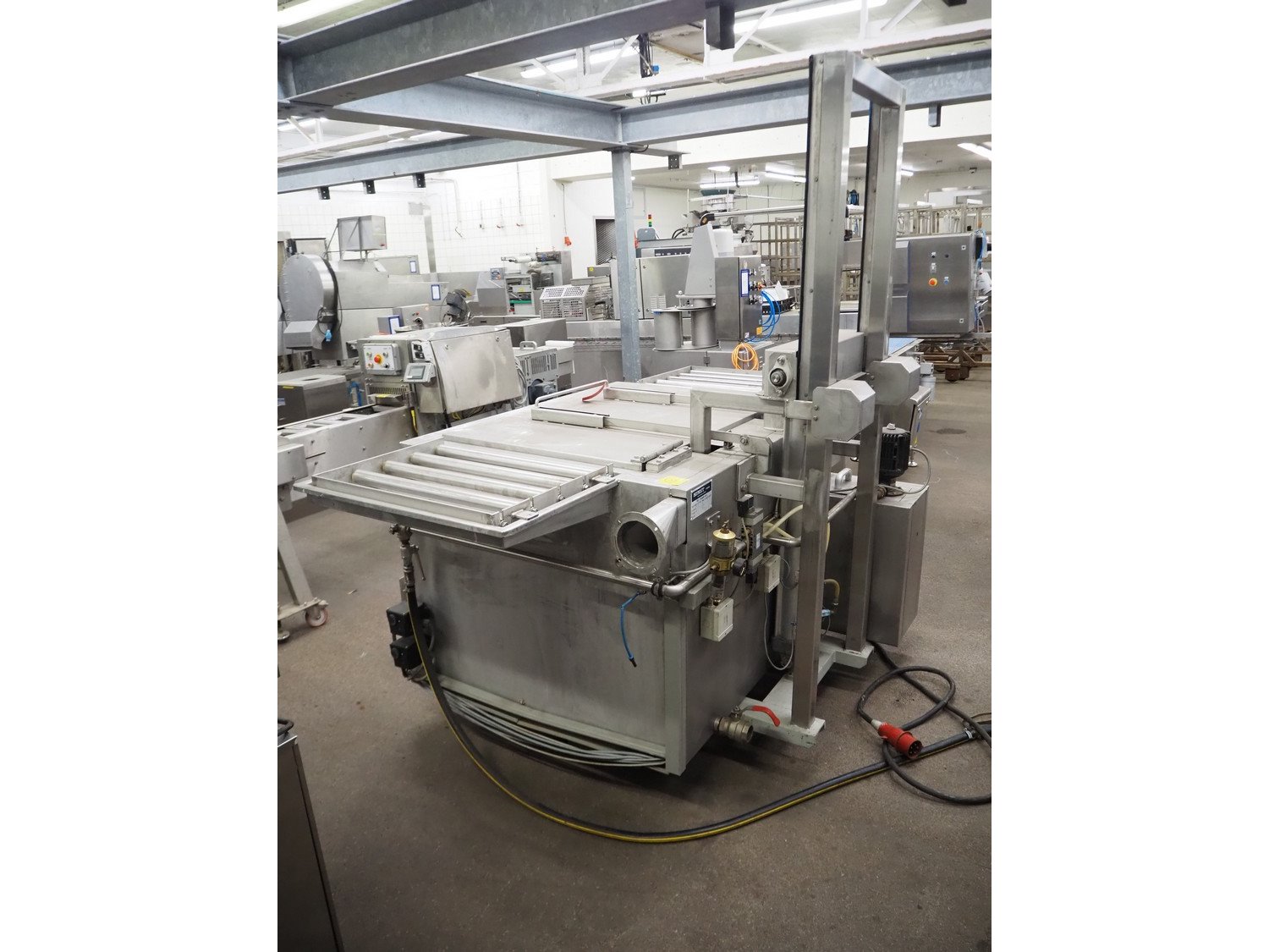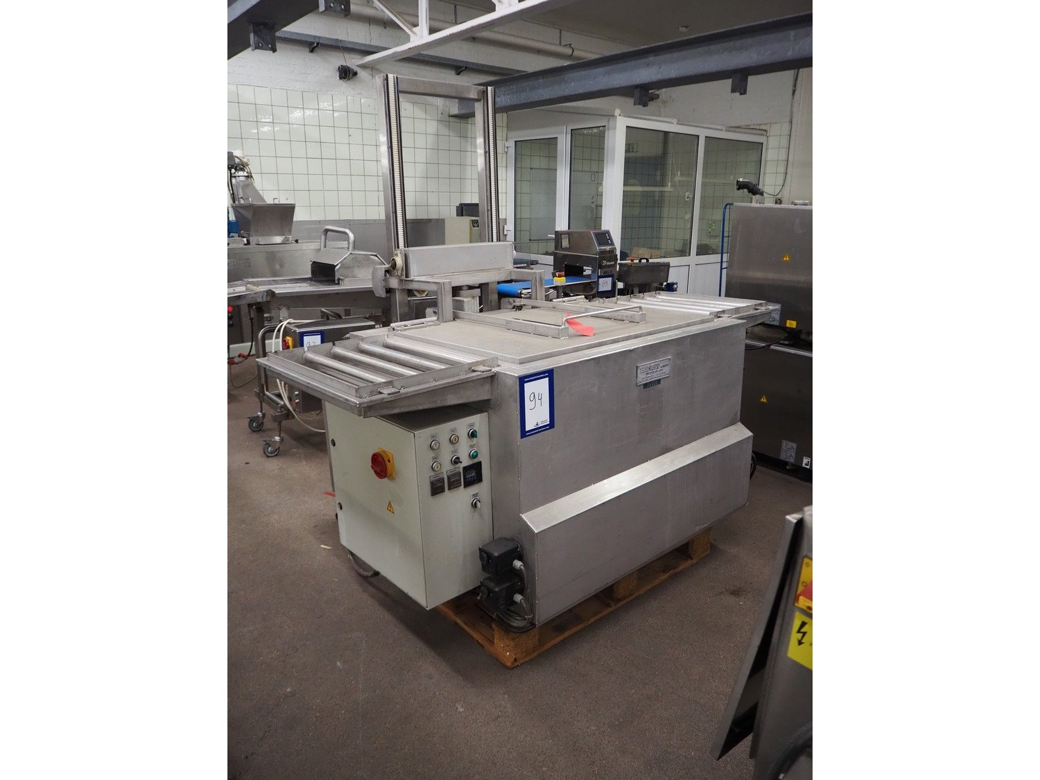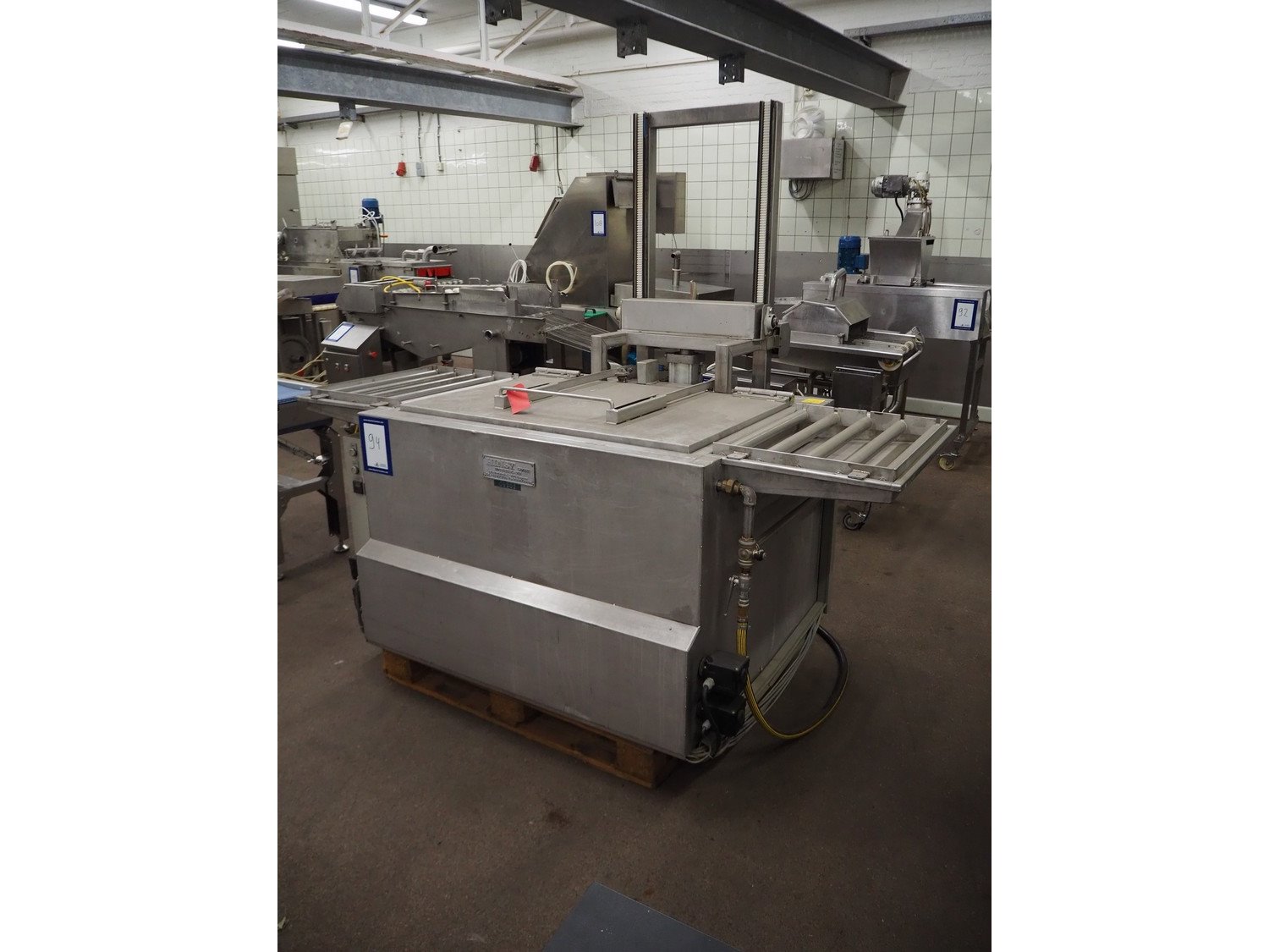 Hinst complete stainless steel, electric heated, washing machine for machine parts. Consisting of 3 steps. Wash, after rinse and drying. Section 1: wash in hot water by dip and flushing, electric heated. Section 2: after rinse by dipping in hot water, electric heated. Circulation pump 0,25 kW. With automatic tank filling and level monitoring. Section 3: drying above the bath, by heat of the parts. Including hose for hand washing. Bath size: 60 x 40 x 25 cm. Complete with lifting device, roller conveyor, automatic mode. Total dimensions: 1600 x 2400 x 2300 mm. Kavel locatie: Kaldenkerkerweg 5, 5932 CS Tegelen, Nederland