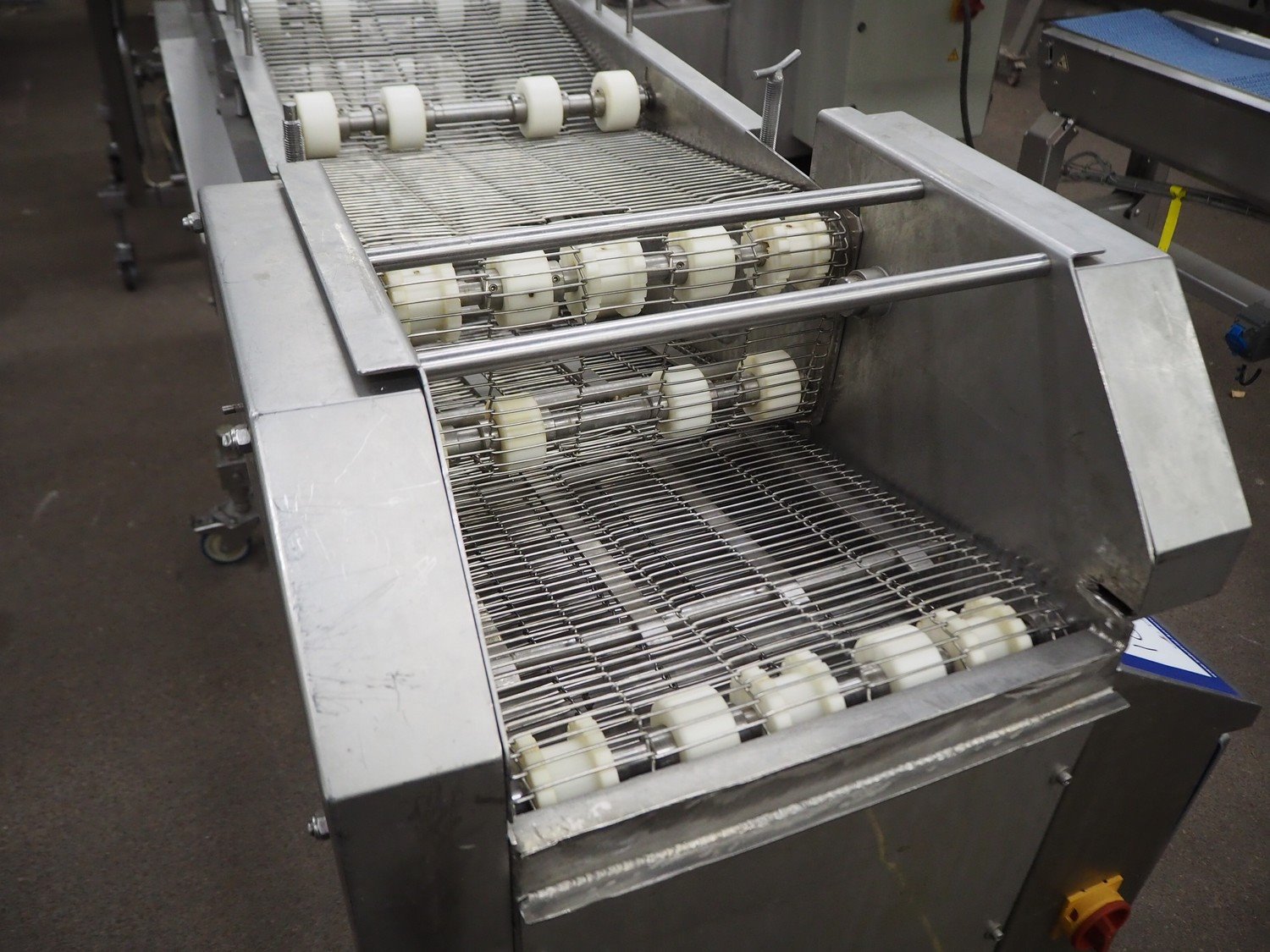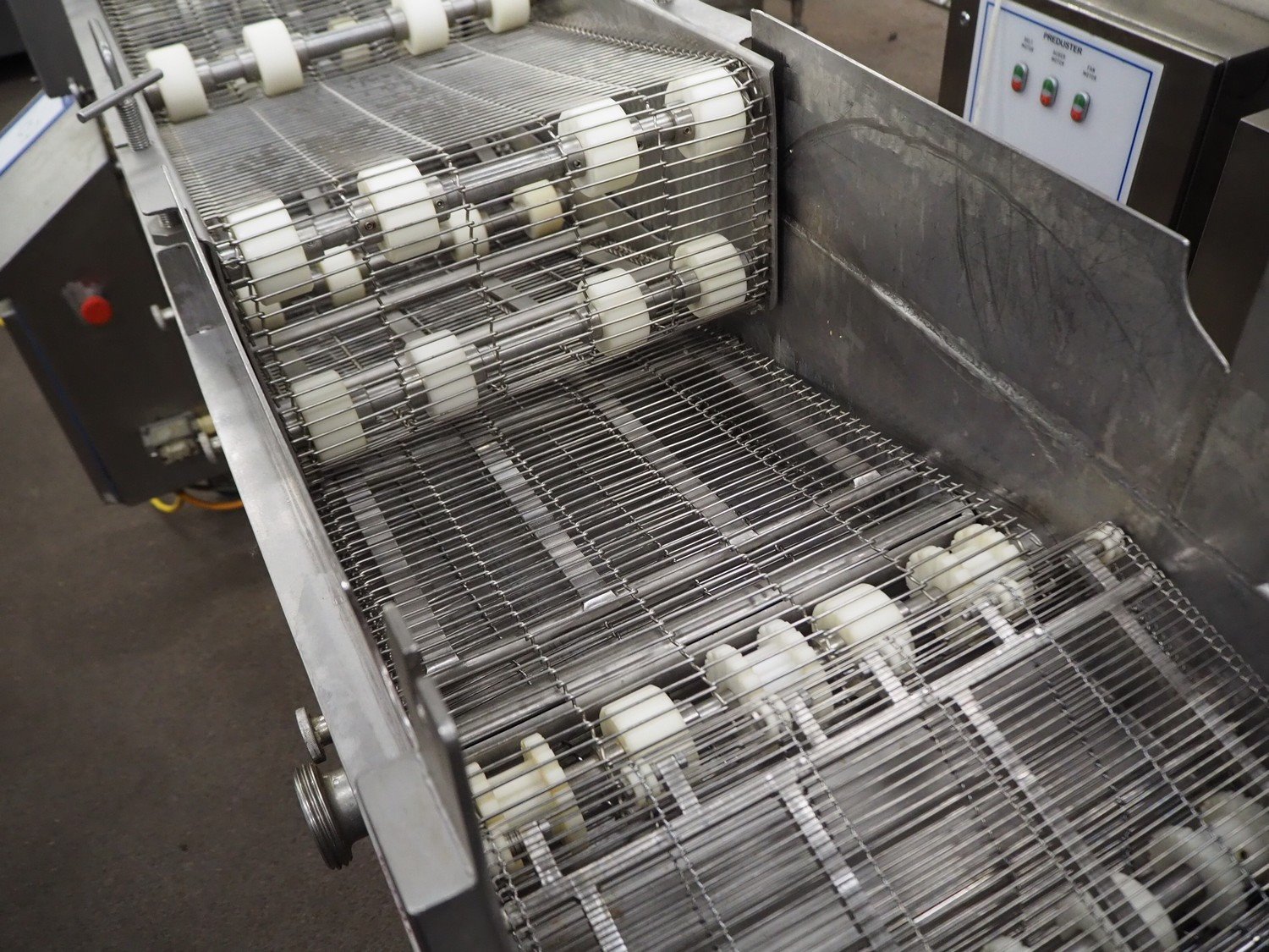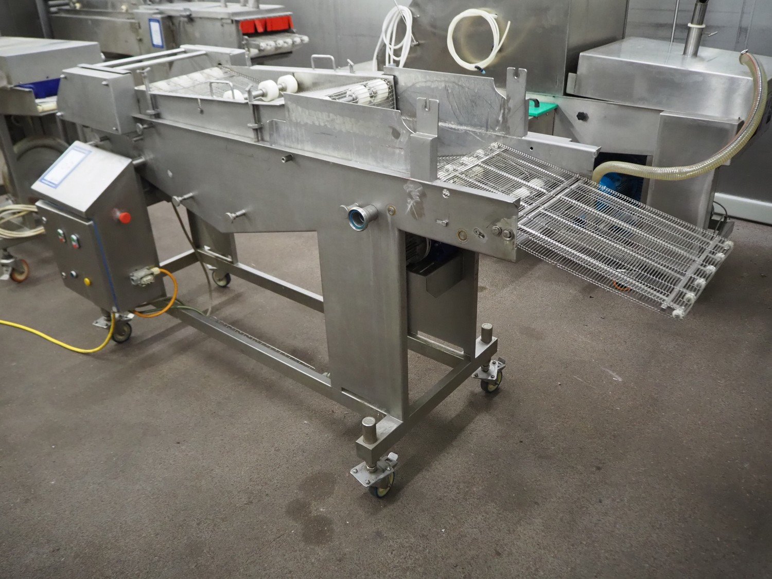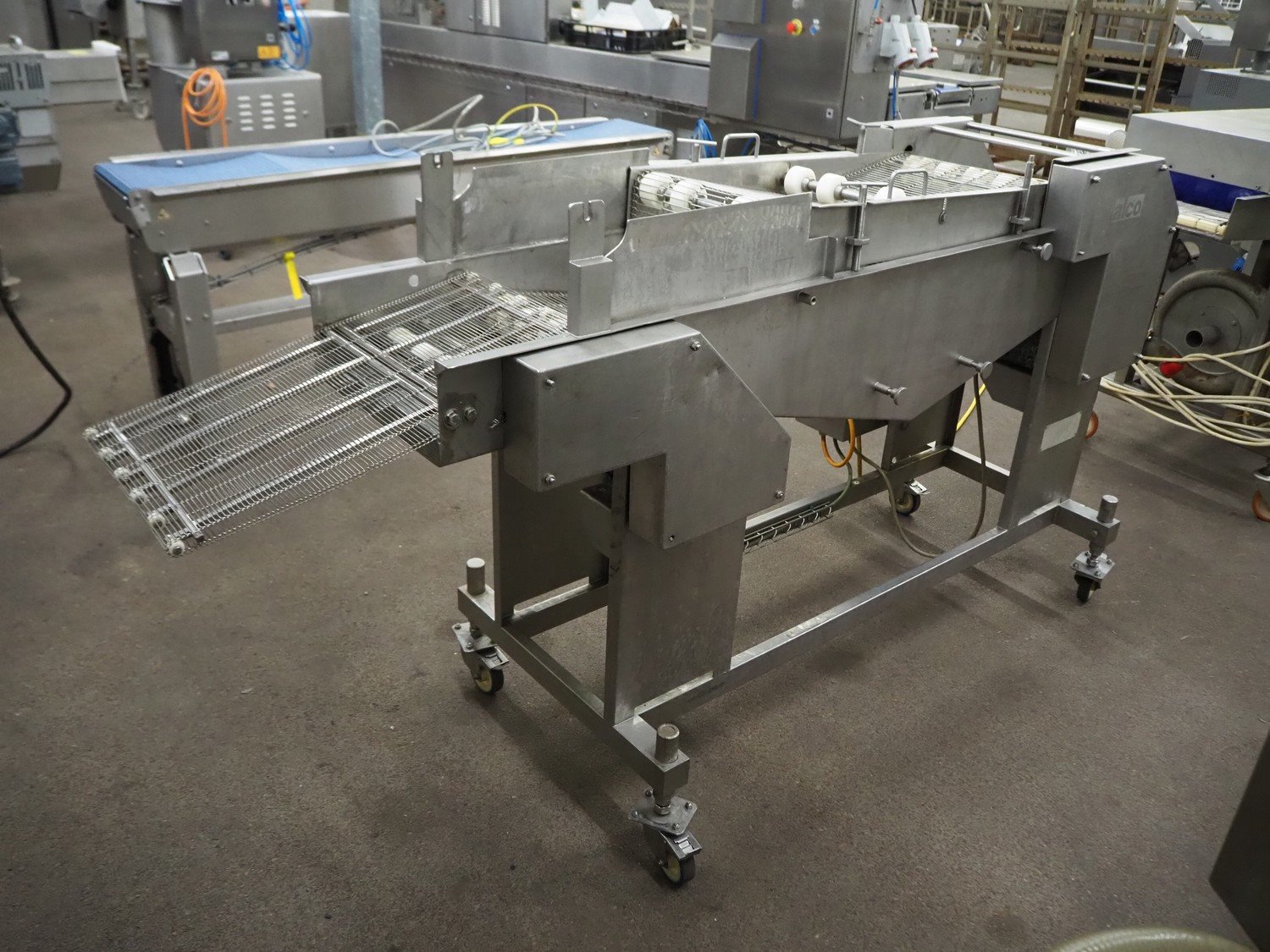 Alco Food Machines GmbH mobile battering machine, type: ADT 400, serial number: 00707209, year of construction: 1998, 400 V, s/s mesh belt, belt width: 400 mm, total dimensions: 2300 mm x 1000 mm x 1200 mm. Kavel locatie: Kaldenkerkerweg 5, 5932 CS Tegelen, Nederland