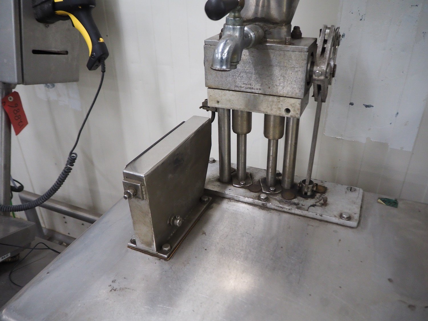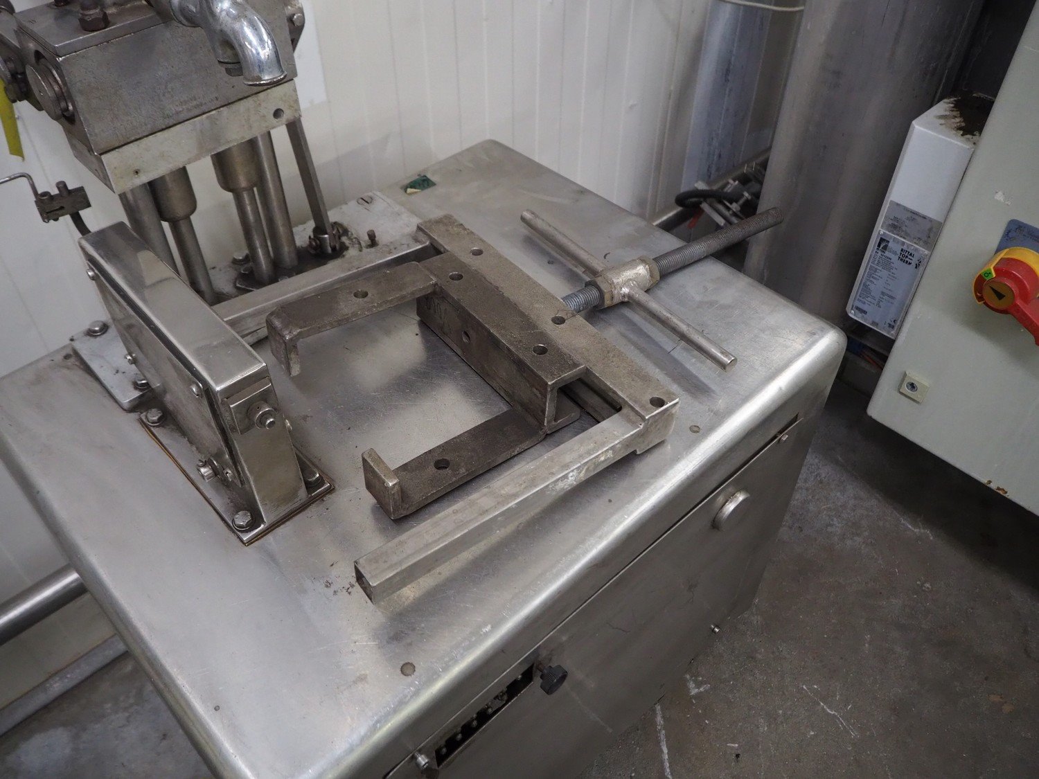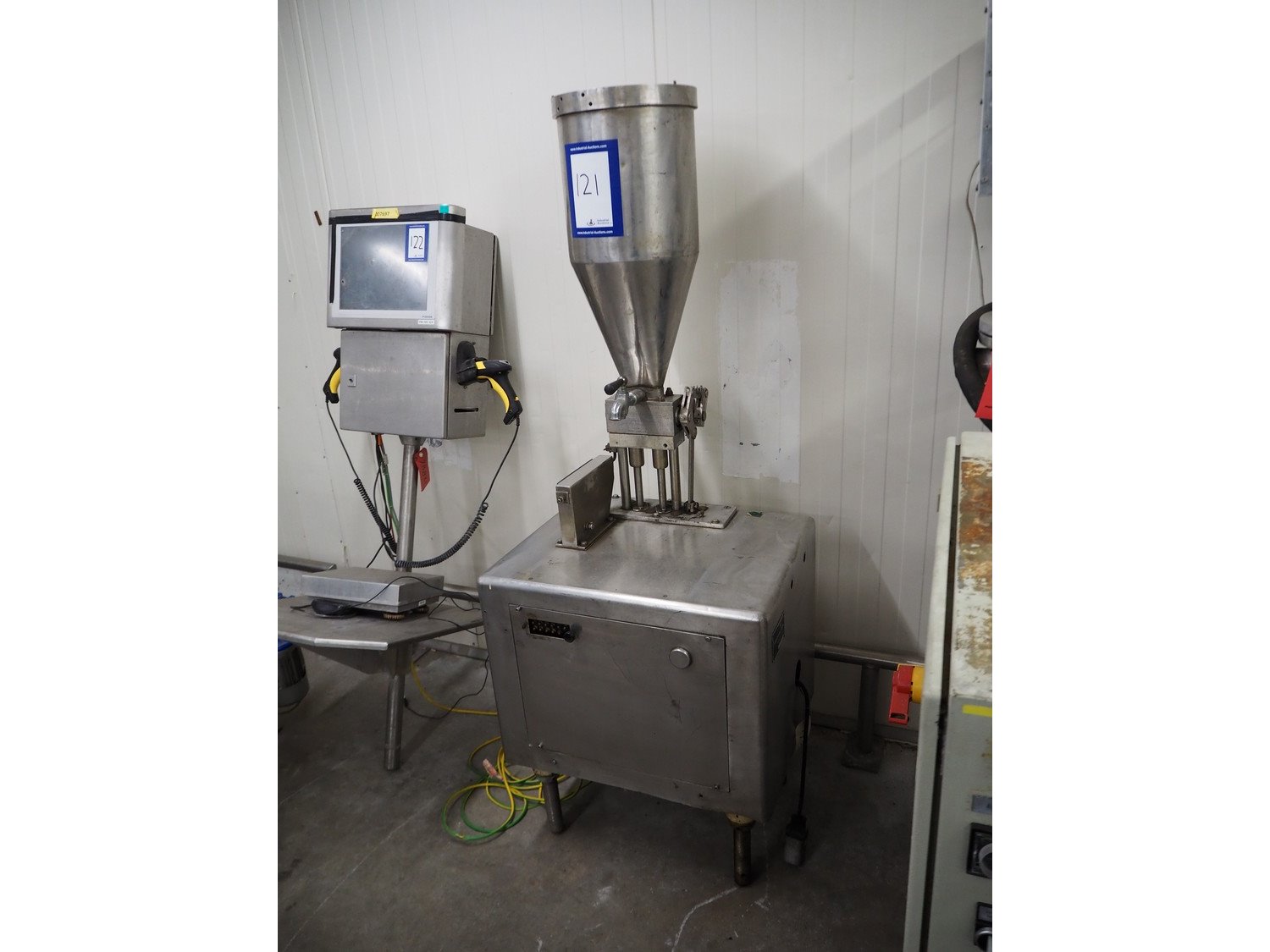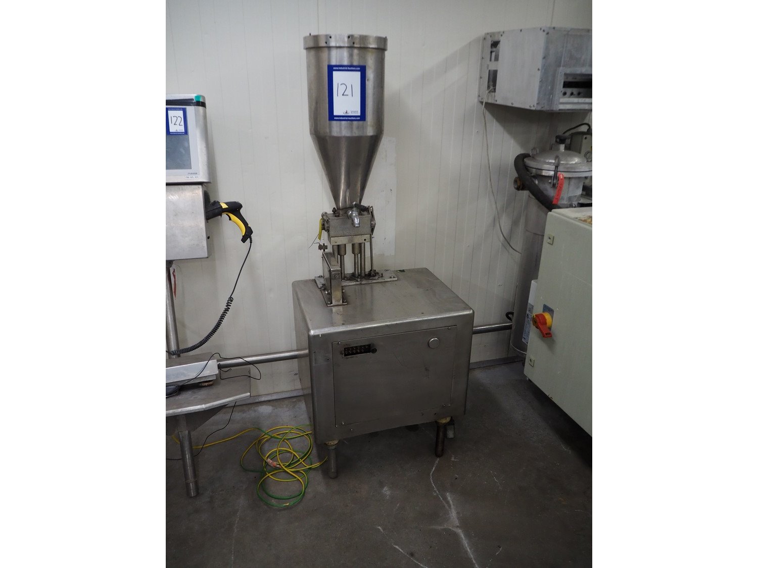 Ganzhorn + Stirn filling machine, number: 452.67, output: Ø 20, dimensions funnel: Ø 320 mm x 670 mm, total dimensions: 700 mm x 600 mm x 1800 mm. Kavel locatie: Kaldenkerkerweg 5, 5932 CS Tegelen, Nederland