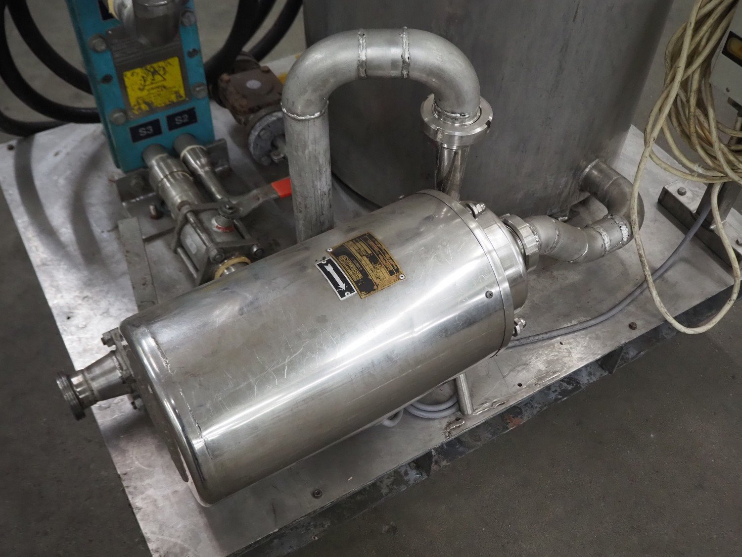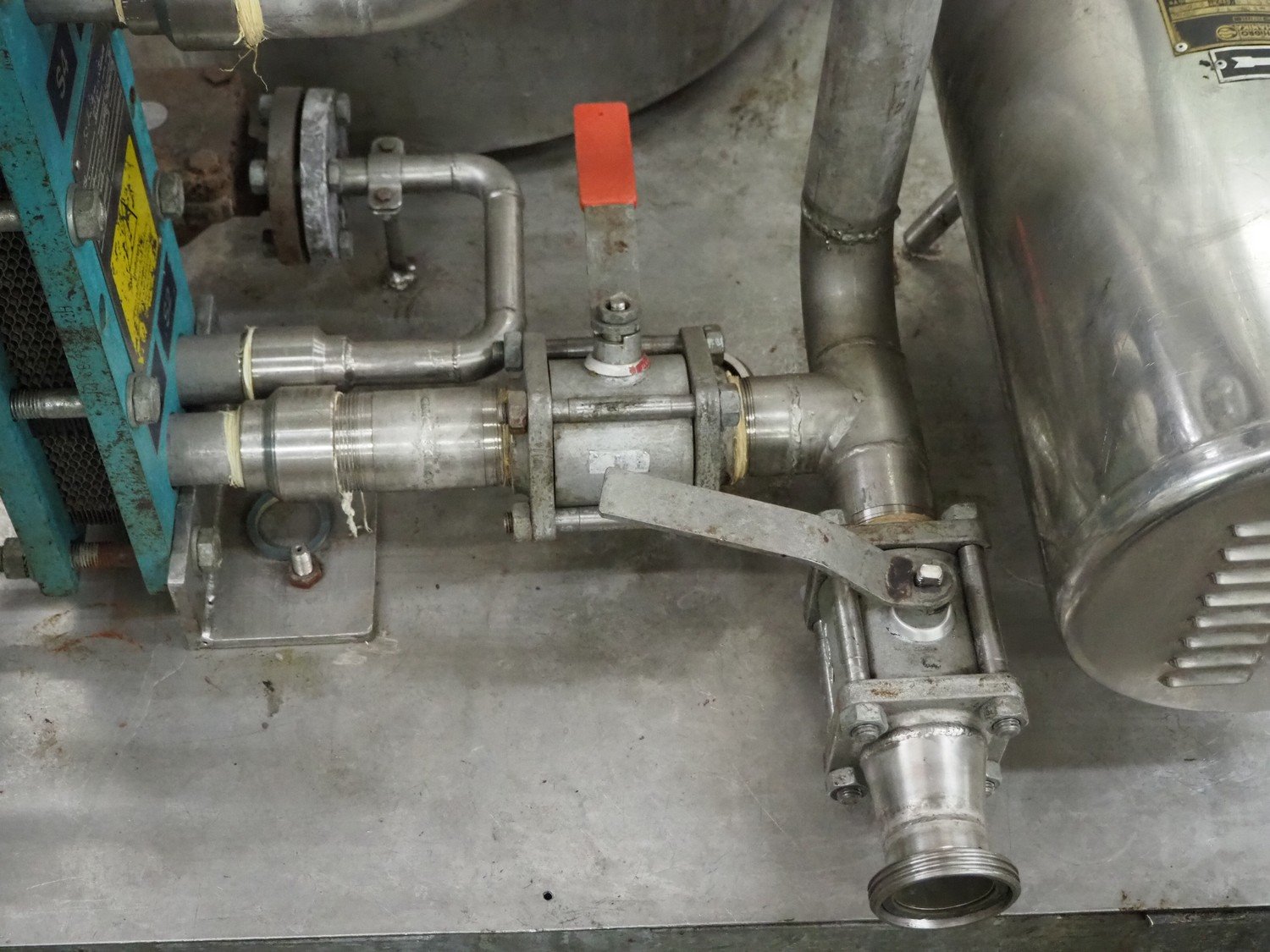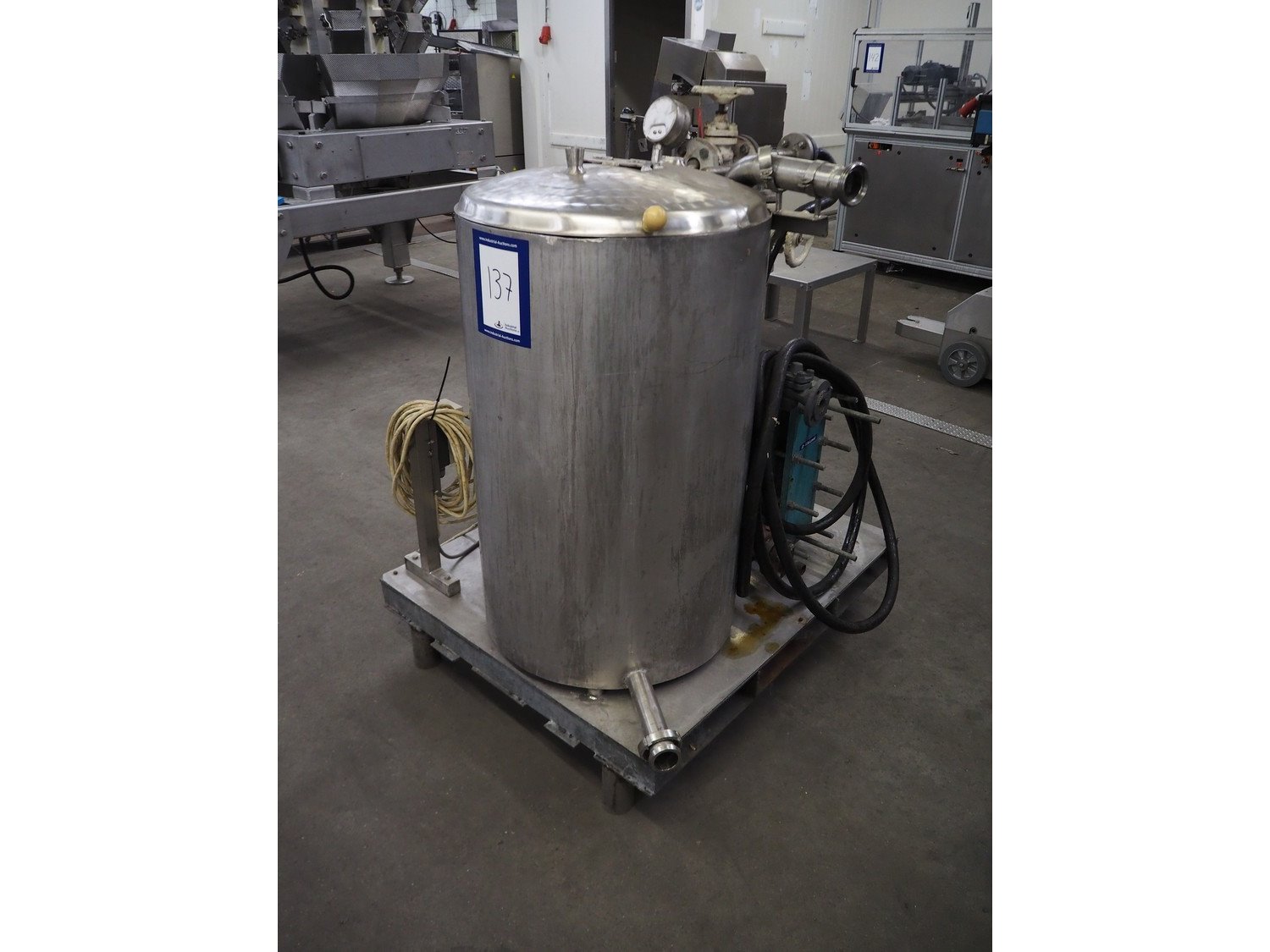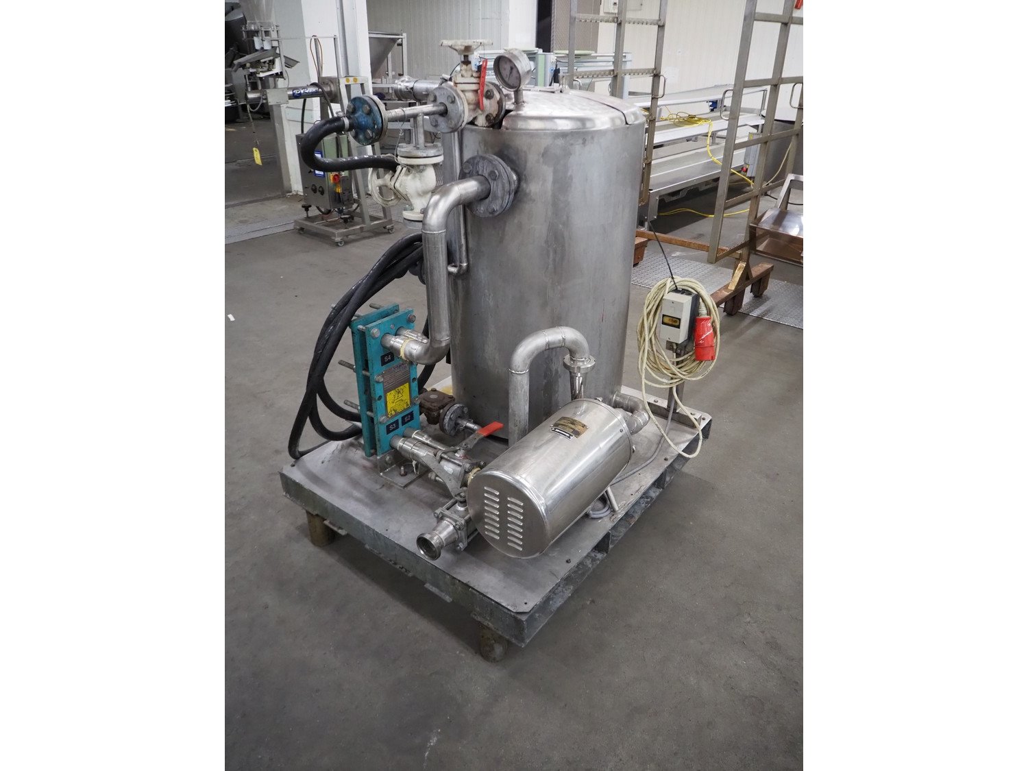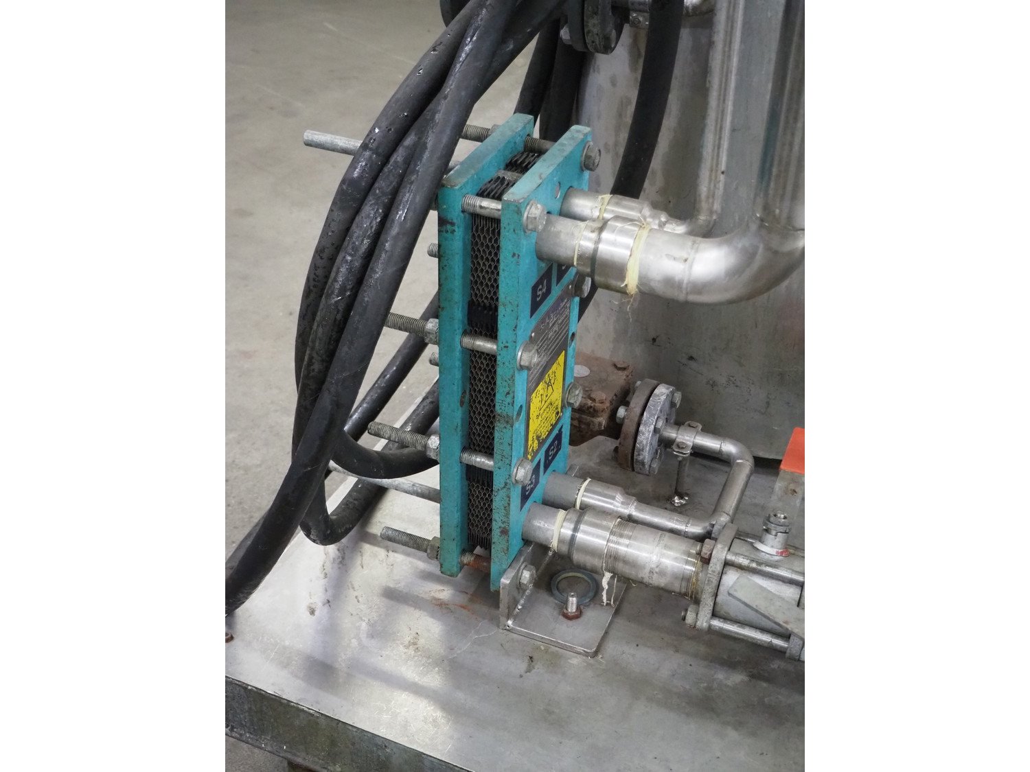 Hidro Mechanika heating tank on steel frame with Alfa Laval plate heat exchanger, type heating tank: HCLK-50-16, year of construction 1999, 4 kW, type heat exchanger: M3-FG, number: 30104-54430, year of construction: 1997, volume: 1liter, dimensions tank: Ø 700 mm x 1100 mm, total dimensions: 1300 mm x 1100 mm x 1600 mm. Kavel locatie: Kaldenkerkerweg 5, 5932 CS Tegelen, Nederland