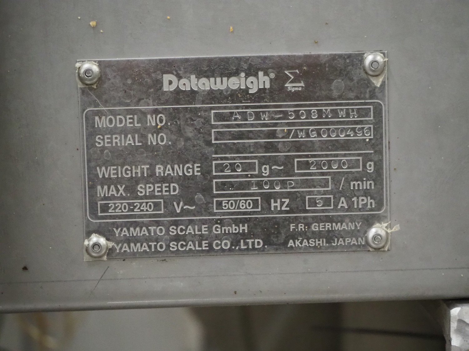 Yamato Scale GmbH 8 heads multihead weigher, model: ADW-508MWH, serial number: WG000496, 220-240 V, 1 Ph, 50/60 Hz, 5 A, weighing range: 20-2000 g, maximum speed: 100 pieces per minute, dimensions: 1950 mm x 1500 mm x 2400 mm. Kavel locatie: Kaldenkerkerweg 5, 5932 CS Tegelen, Nederland