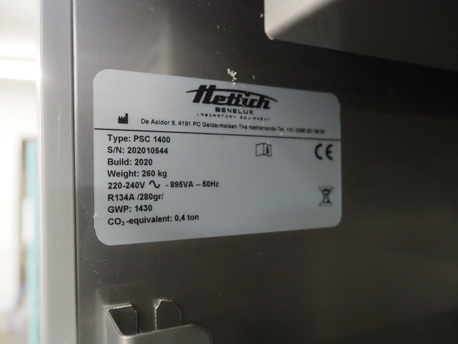 Hettich laboratory cabinet, type: PSC 1400, serial number: 202010544, year of construction: 2020, 220/240 V, 50 Hz, weight: 260 kg, 20-40 degrees, refrigerant: R134A, 6 floors, dimensions each floor: 600 mm x 520 mm, total dimensions: 1420 mm x 950 mm x 2000 mm. Kavel locatie: Kaldenkerkerweg 5, 5932 CS Tegelen, Nederland