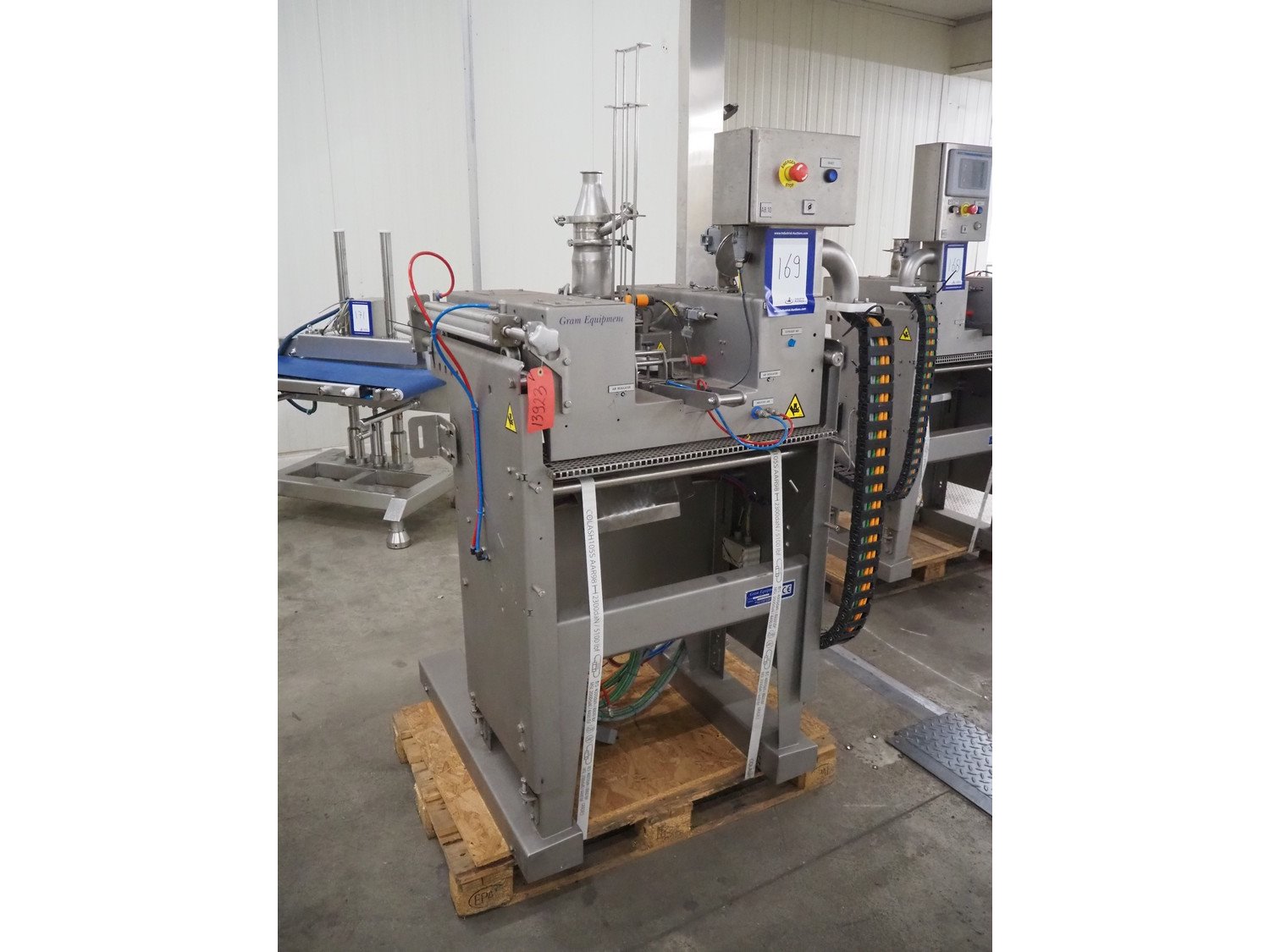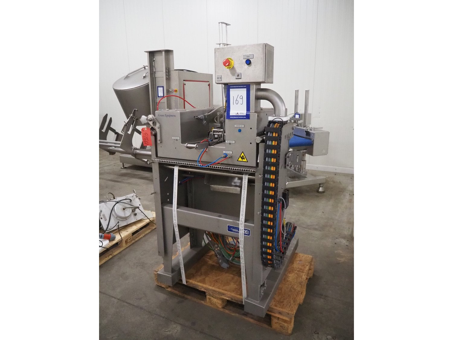Gram Equipment ice cream extruder/forming, cutting with stick inserter, type: CUTTER, clearance input: 650 mm x 100 mm, dimensions pipe: 100 mm x 40 mm, total dimensions: 1400 mm x 1000 mm x 1850 mm. Kavel locatie: Kaldenkerkerweg 5, 5932 CS Tegelen, Nederland