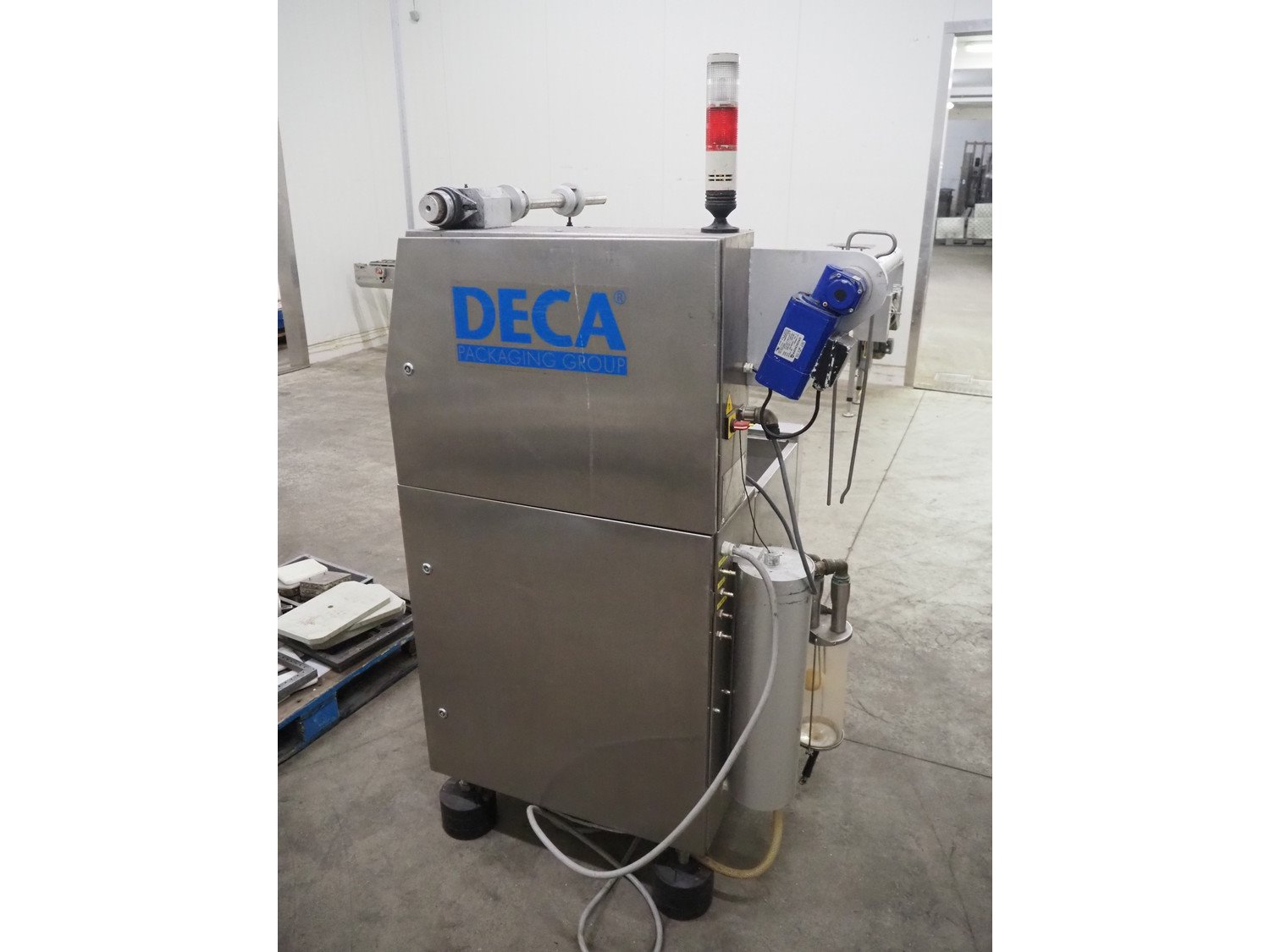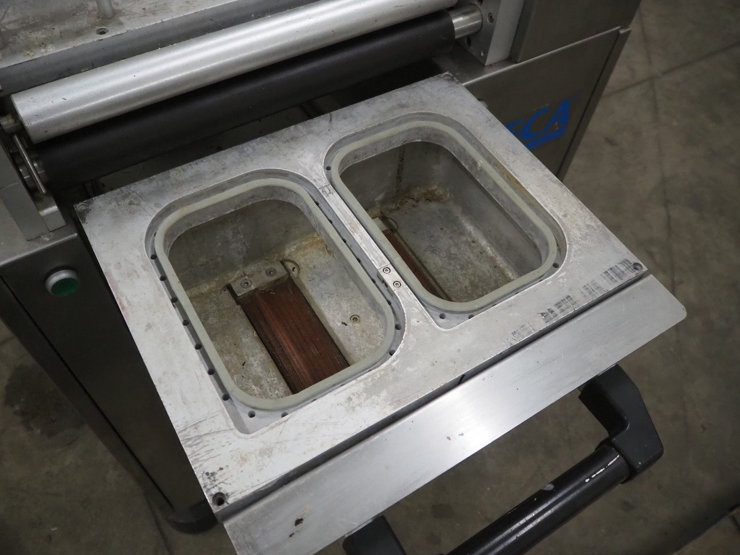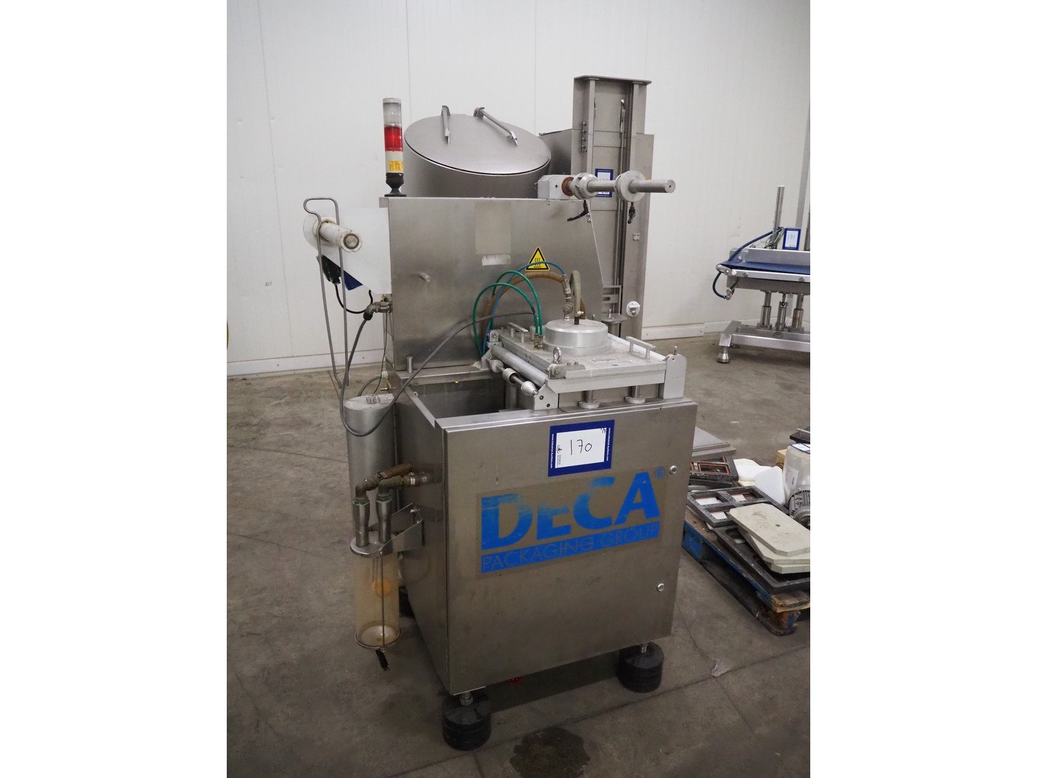 Deca traysealer, type: MECA 900, serial number: S.M. 1201, year of construction: 2001, film width: 270 mm, dimensions dye: (2x) 200 mm x 140 mm, total dimensions: 1400 mm x 800 mm x 1800 mm. Including 2 pallets with parts, dimensions dyes: 220 mm x 150 mm, 280 mm x 180 mm, 320 mm x 270 mm. Kavel locatie: Kaldenkerkerweg 5, 5932 CS Tegelen, Nederland