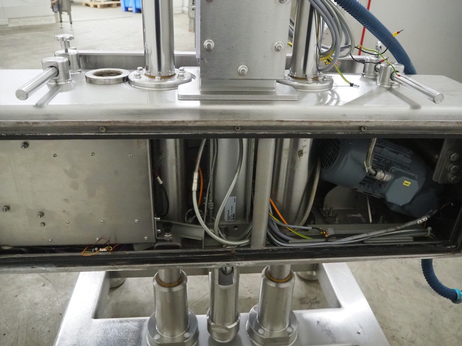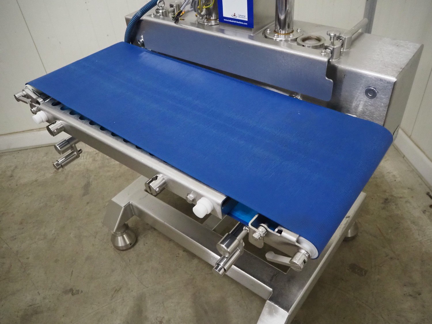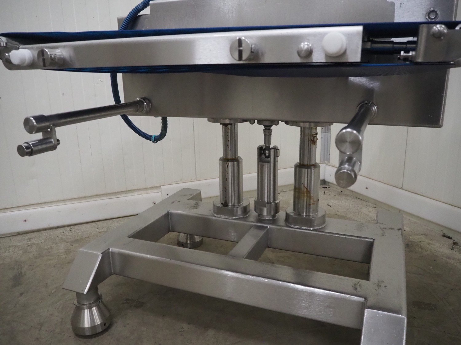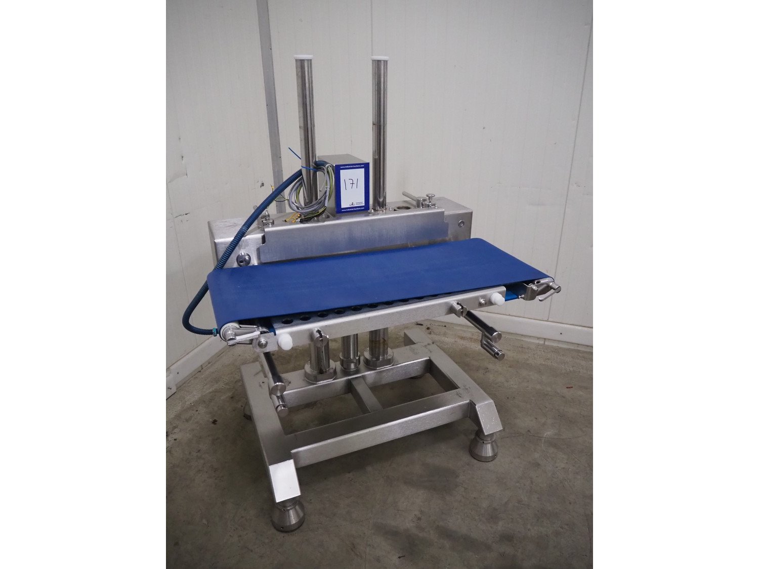 Weber infeed belt lift, type: CHB, number: 181, year of construction: 08-2009, s/s frame, plastic belt, belt width: 450 mm, total dimensions: 1200 mm x 840 mm x 1650 mm. Kavel locatie: Kaldenkerkerweg 5, 5932 CS Tegelen, Nederland