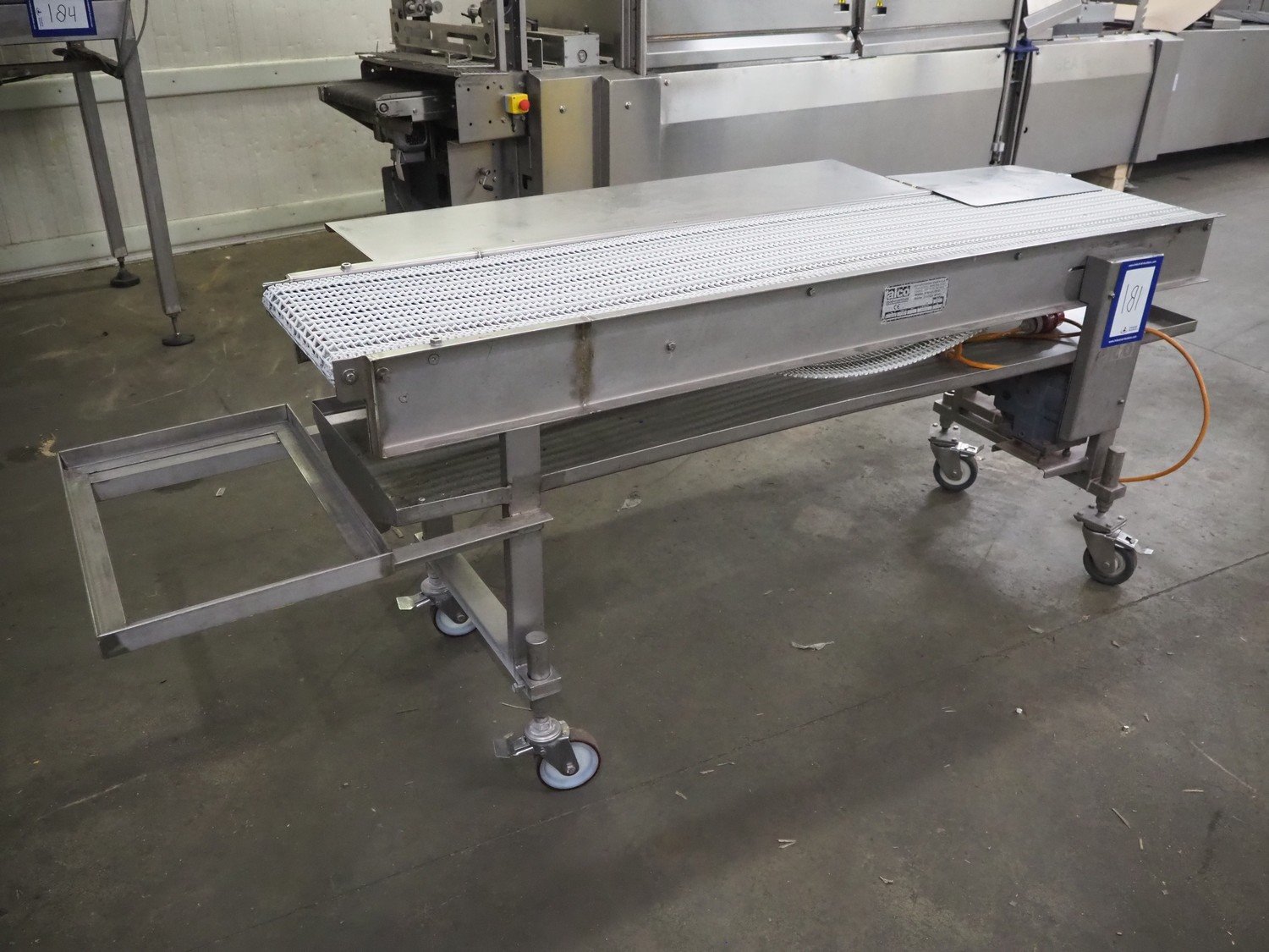 Alco food-machines mobile transport belt, serial number: 0903210, year of construction: 1999, 380 V, 60 Hz, plastic mesh belt, belt width: 410 mm, total dimensions: 2440 mm x 835 mm x 900 mm. Kavel locatie: Kaldenkerkerweg 5, 5932 CS Tegelen, Nederland