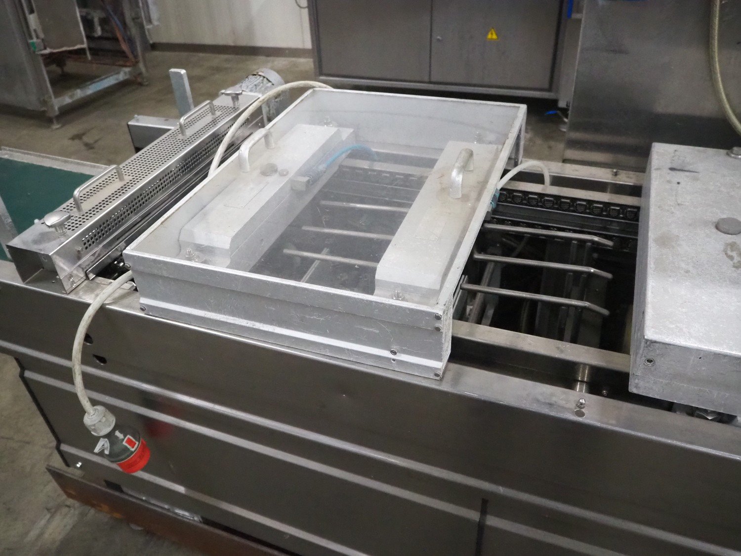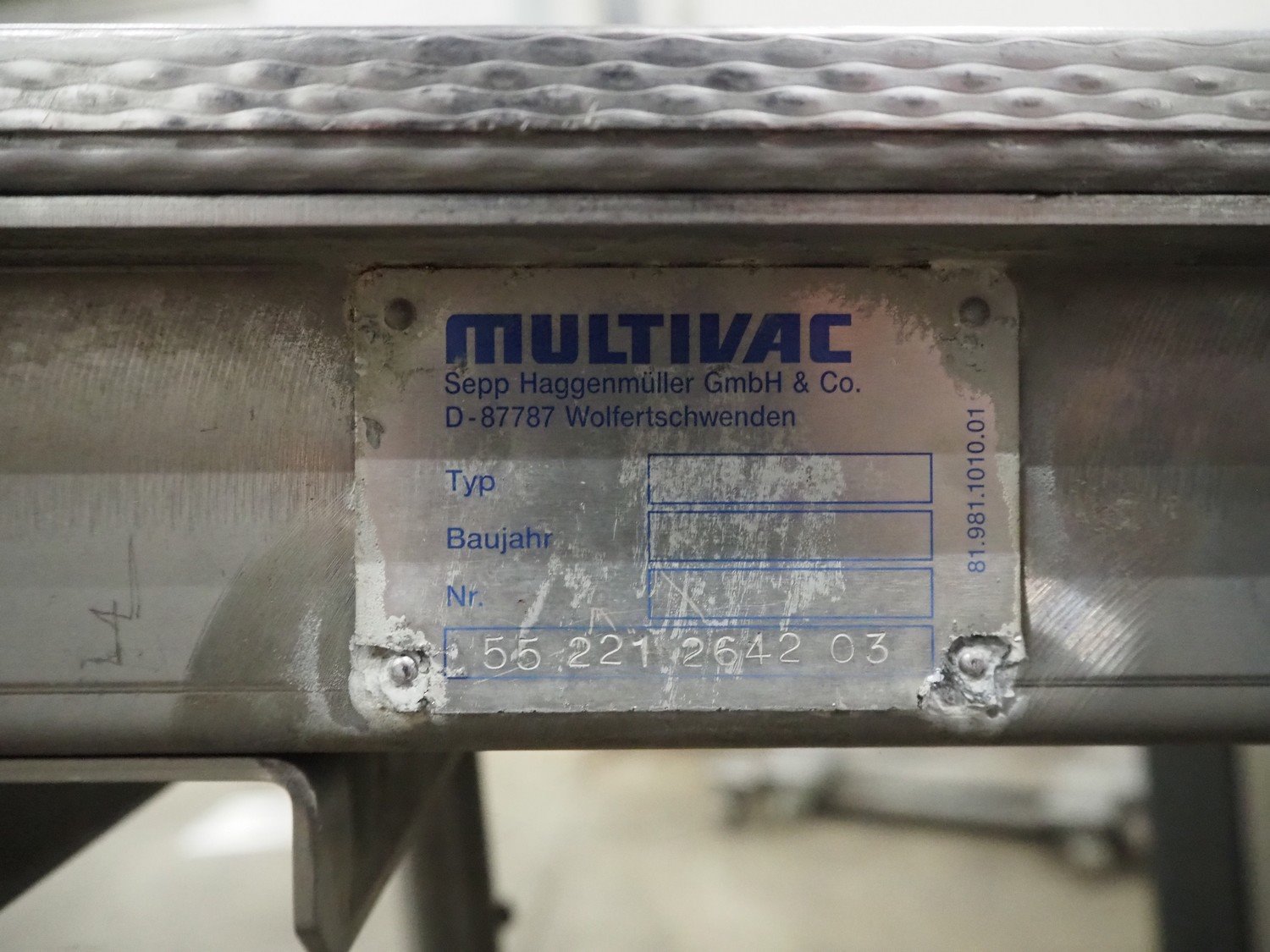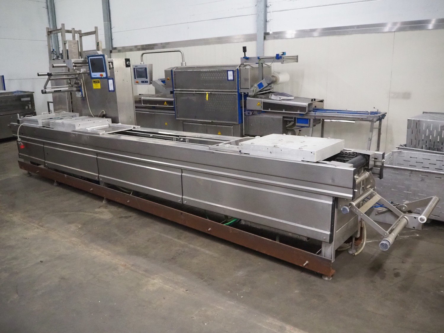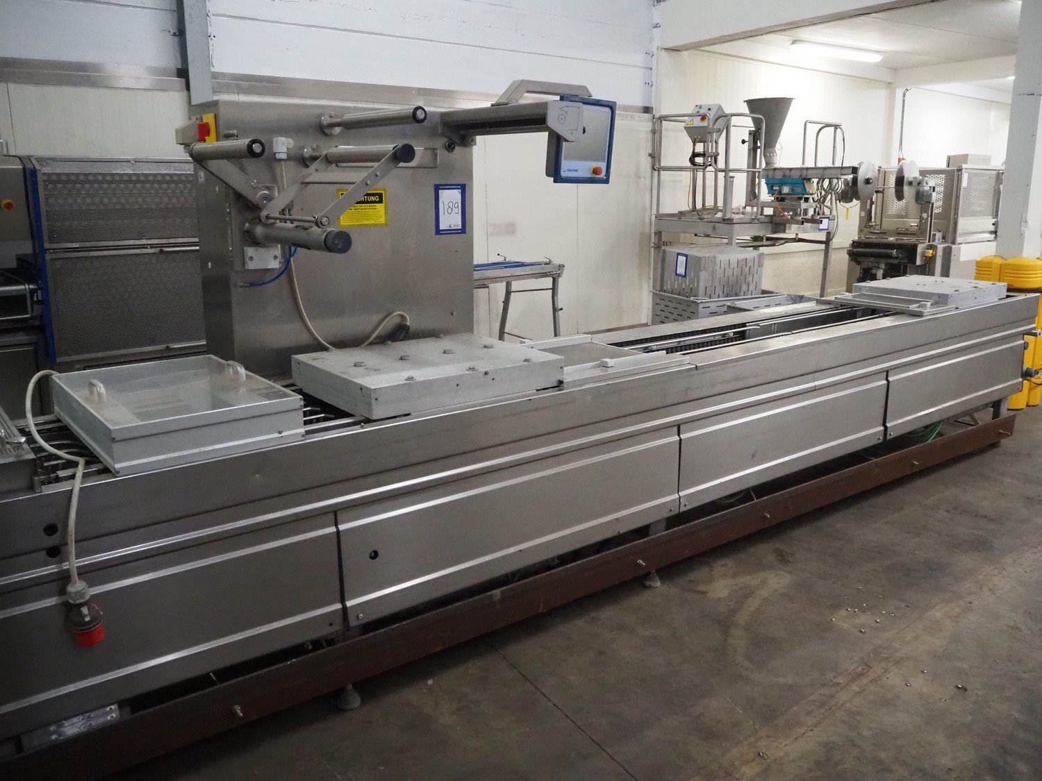 Multivac thermoformer, type: R530, dimensions dye: (8x) 78 mm x 325 mm, plastic belt, belt width: 378 mm, total dimensions: 7660 mm x 1040 mm x 1870 mm. Including Busch vacuum pump, dimensions pump: 1100 mm x 370 mm x 7200 mm. Kavel locatie: Kaldenkerkerweg 5, 5932 CS Tegelen, Nederland