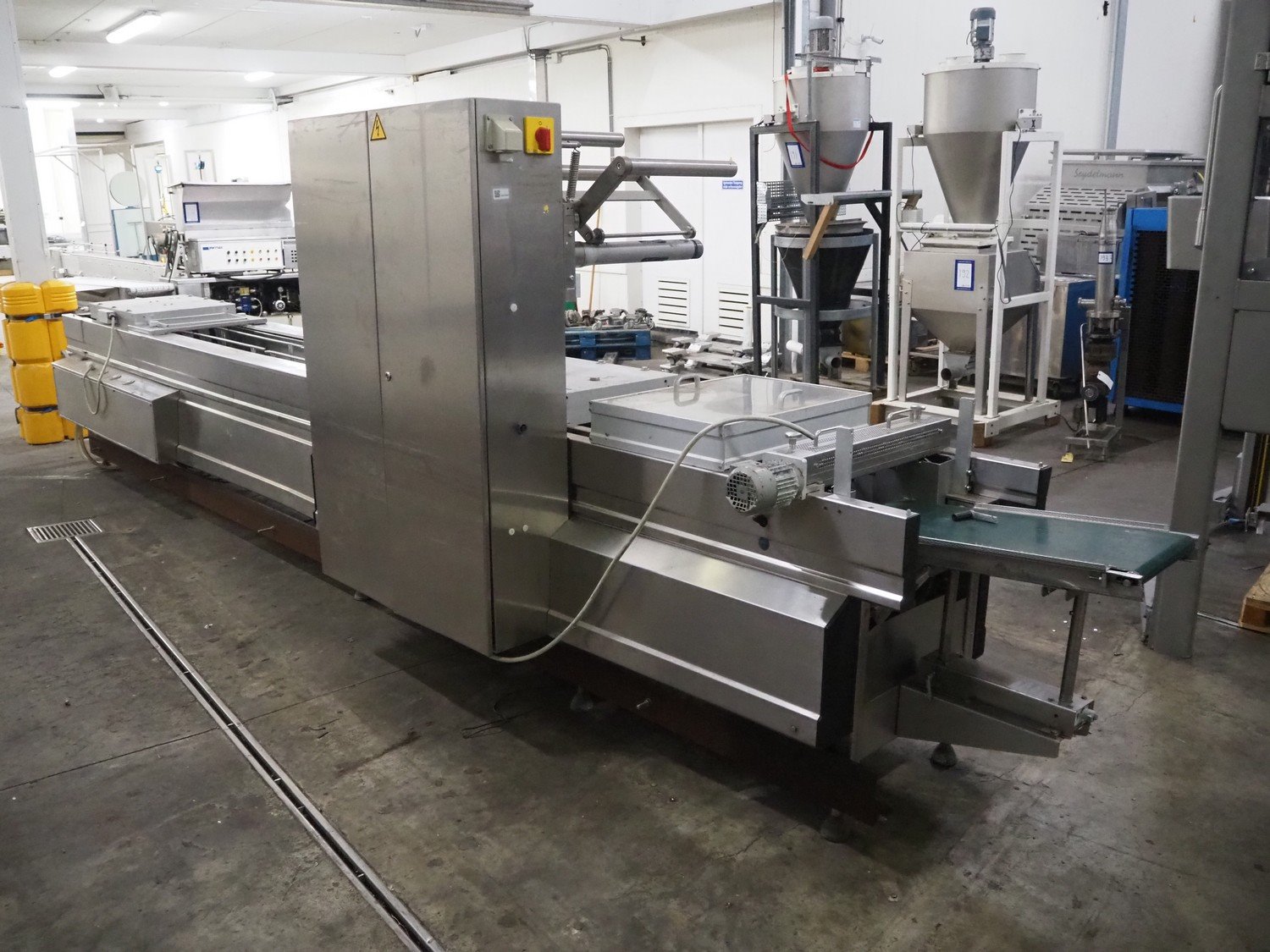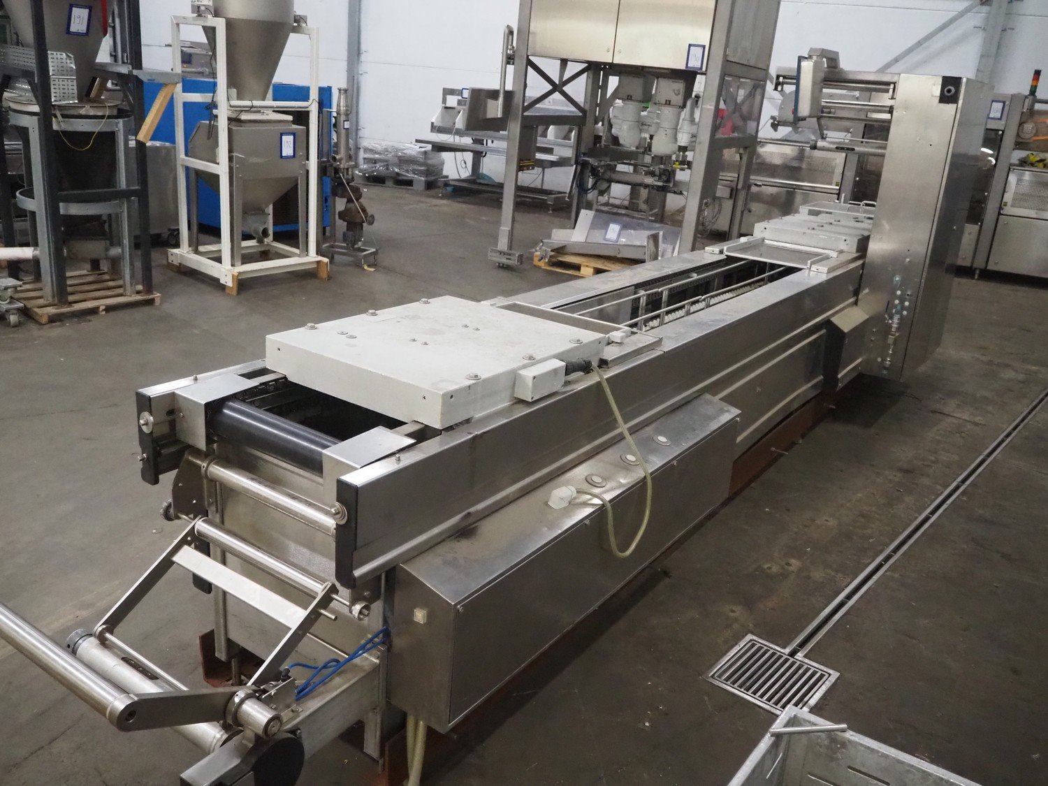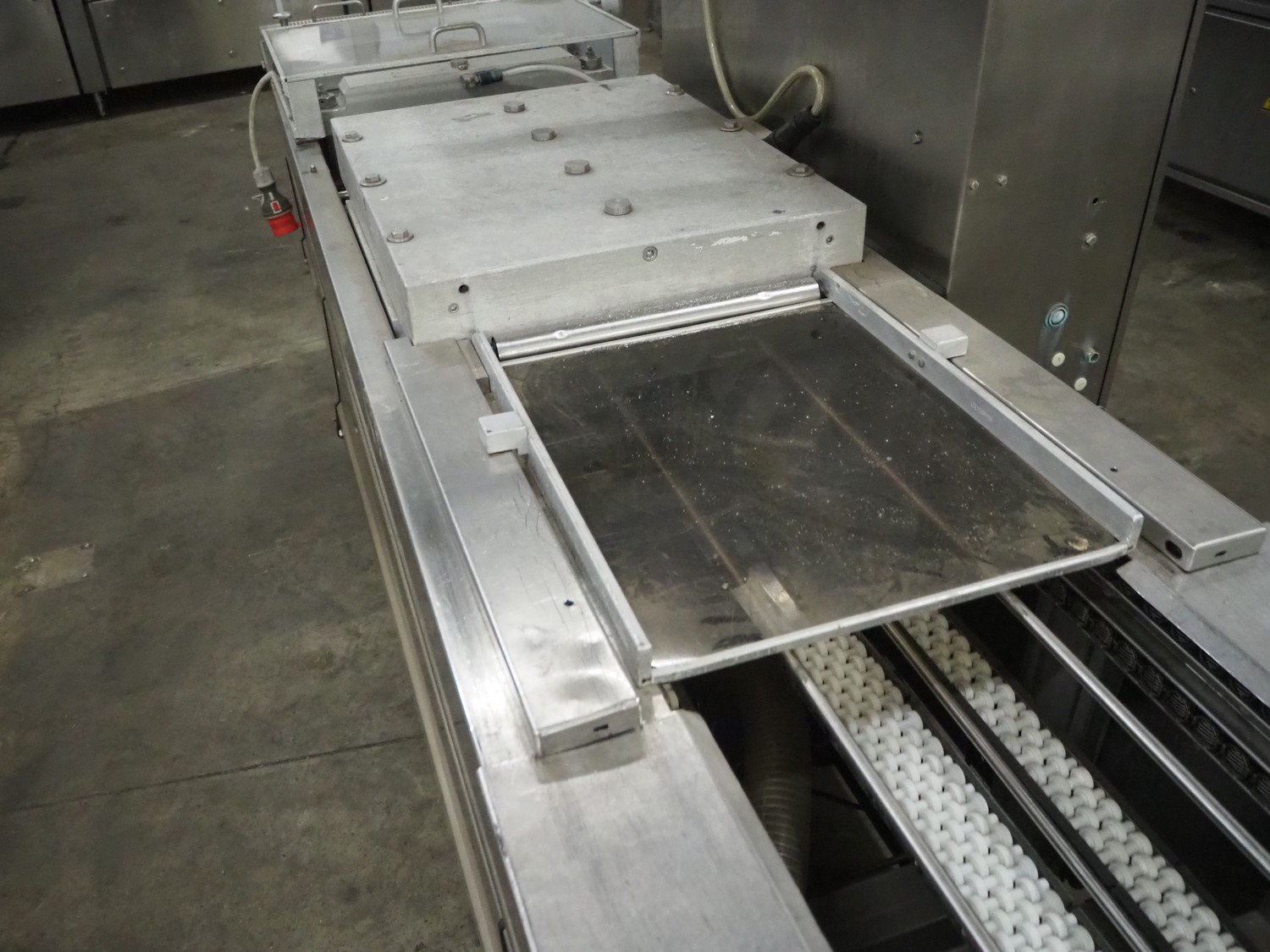 Multivac thermoformer, type: R530, dimensions dye: (8x) 78 mm x 325 mm, plastic belt, belt width: 378 mm, total dimensions: 7660 mm x 1040 mm x 1870 mm. Including Busch vacuum pump, dimensions pump: 1100 mm x 370 mm x 7200 mm. Kavel locatie: Kaldenkerkerweg 5, 5932 CS Tegelen, Nederland