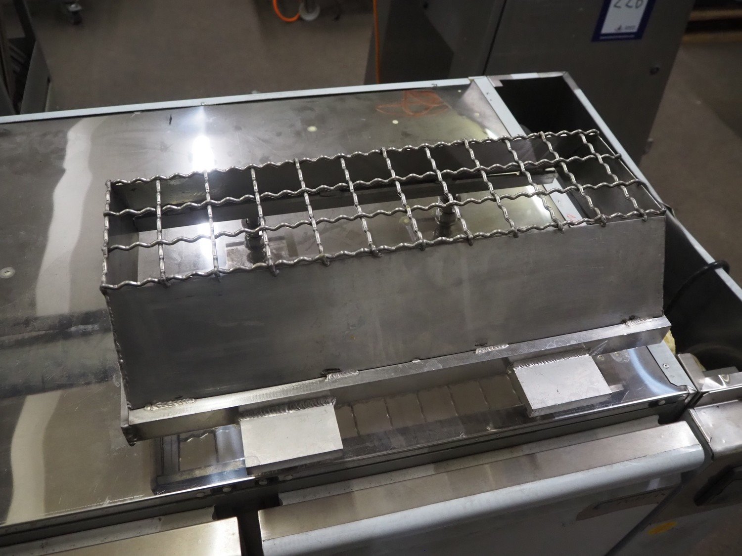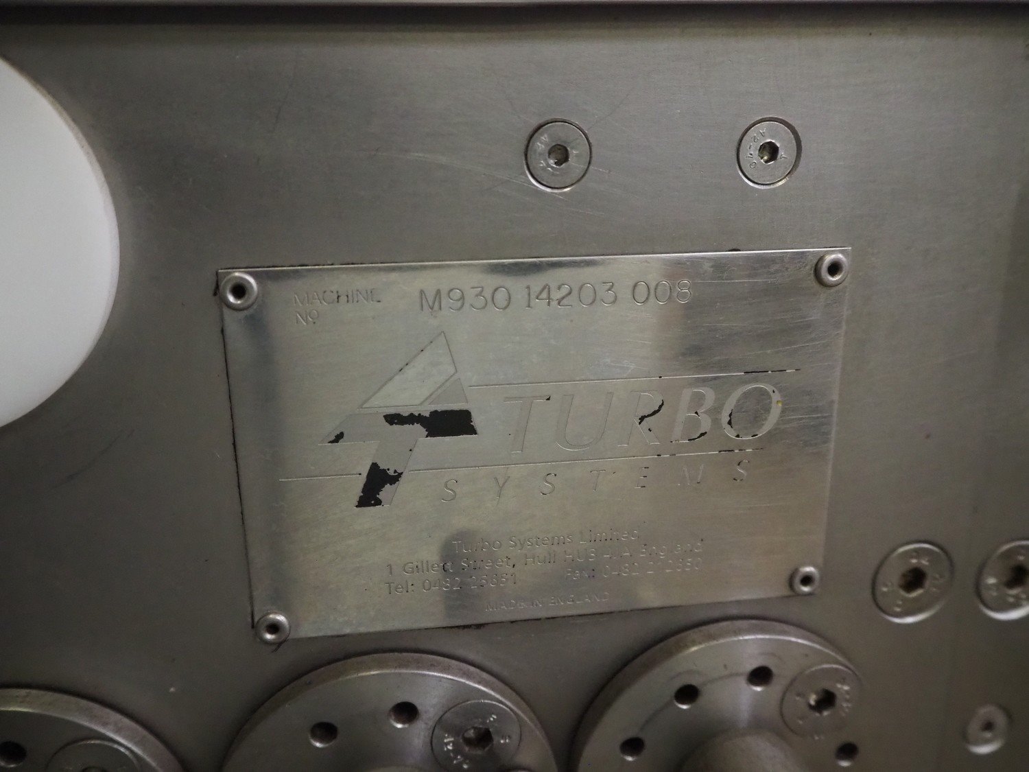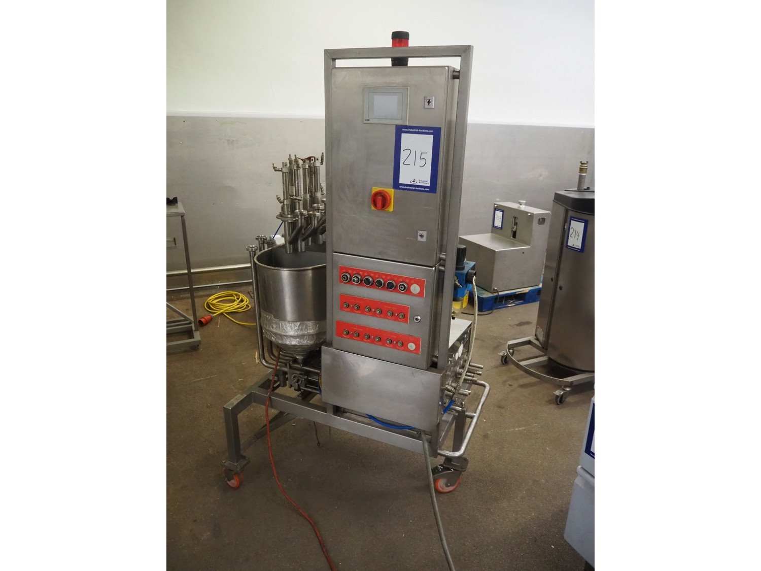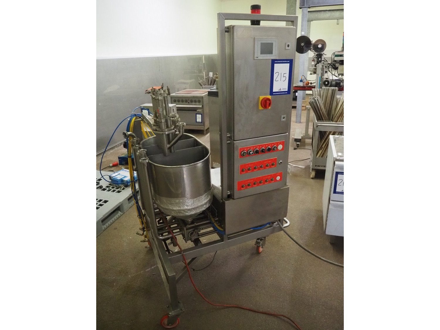 Turbo Systems mobile dosing and filling machine, number: M93014203008, dimensions funnel: 700 mm x 400 mm x 500 mm, diameter output pipe: (6x) 20 mm, total dimensions: 1000 mm x 950 mm x 1900 mm. Kavel locatie: Kaldenkerkerweg 5, 5932 CS Tegelen, Nederland
