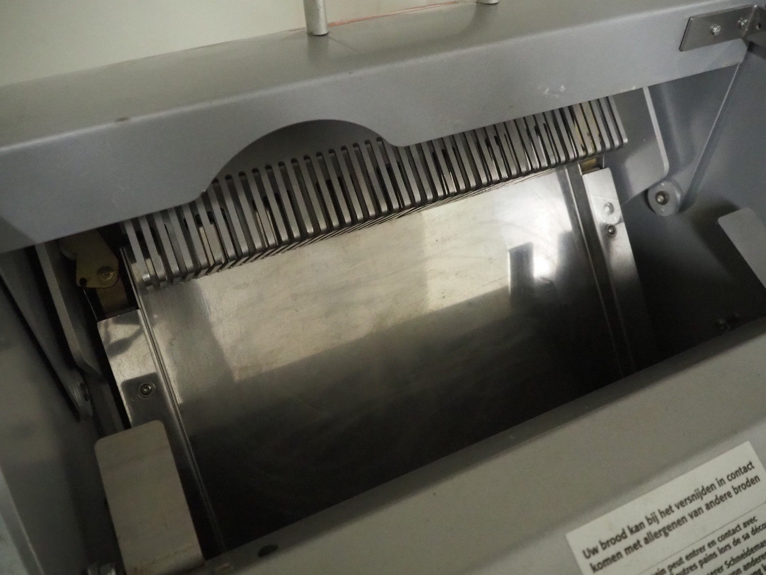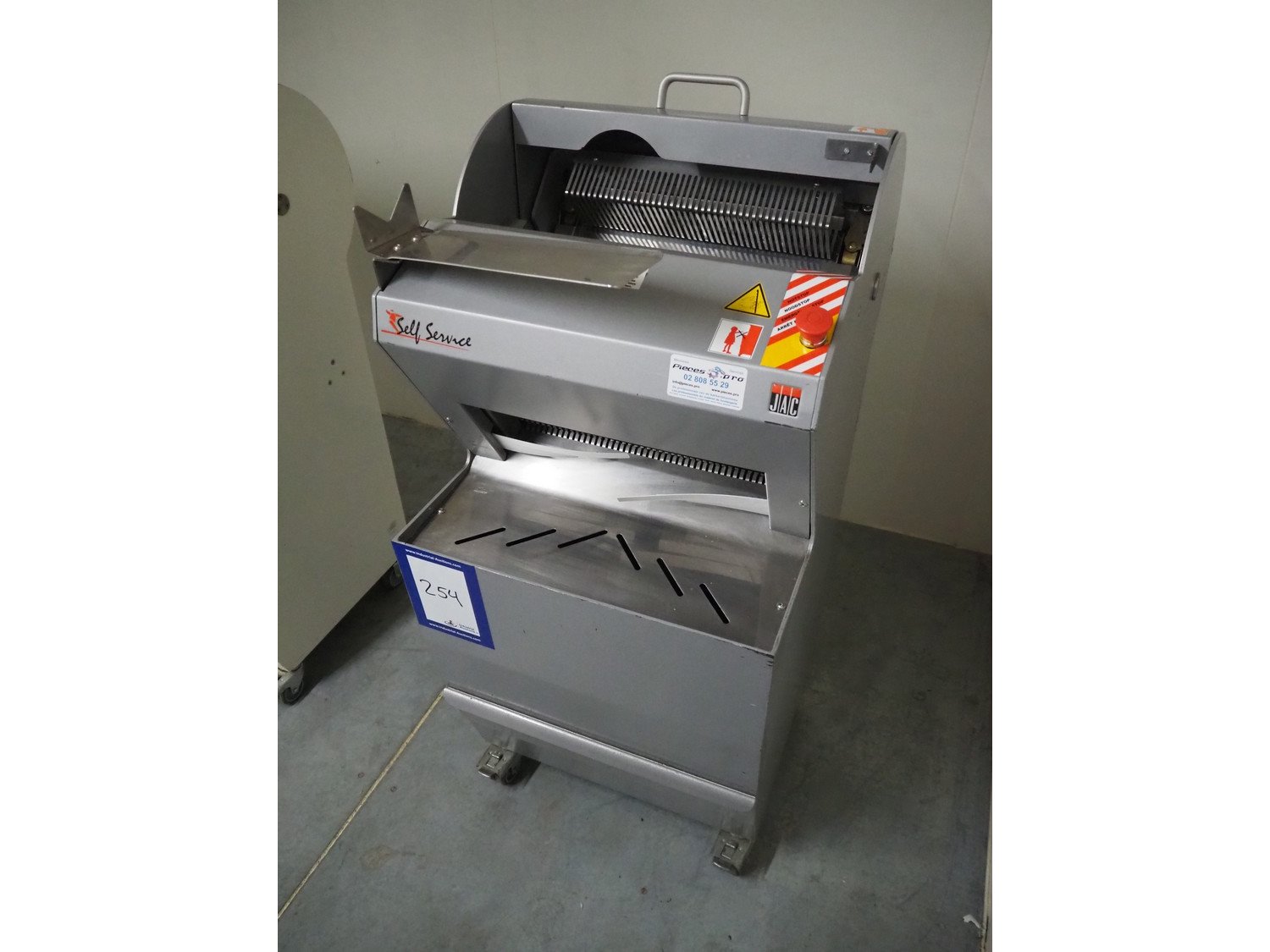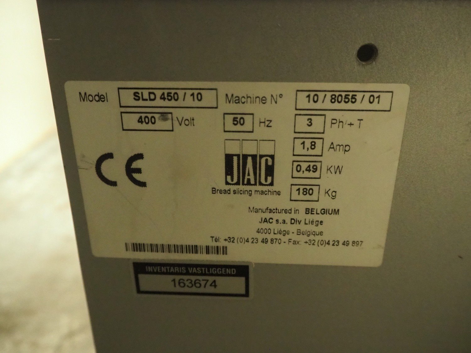 Jac mobile bread slicer, model: SLD 450/10, machine number: 10/8055/01, 400 V, 3 Ph, 50 Hz, 1.8 A, 0.49 kW, weight: 180 kg, working width: 440 mm, 41 knifes, distance between knifes: 10 mm, total dimensions: 700 mm x 600 mm x 1300 mm. Kavel locatie: Kaldenkerkerweg 5, 5932 CS Tegelen, Nederland
