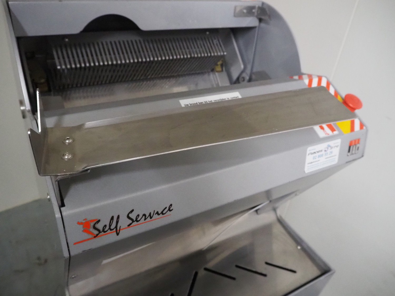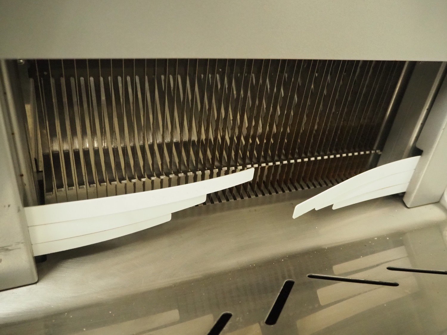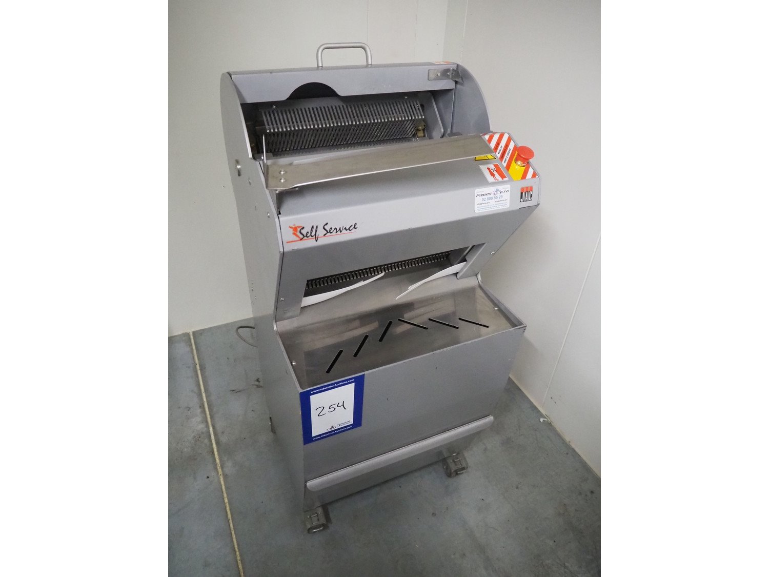 Jac mobile bread slicer, model: SLD 450/10, machine number: 10/8055/01, 400 V, 3 Ph, 50 Hz, 1.8 A, 0.49 kW, weight: 180 kg, working width: 440 mm, 41 knifes, distance between knifes: 10 mm, total dimensions: 700 mm x 600 mm x 1300 mm. Kavel locatie: Kaldenkerkerweg 5, 5932 CS Tegelen, Nederland
