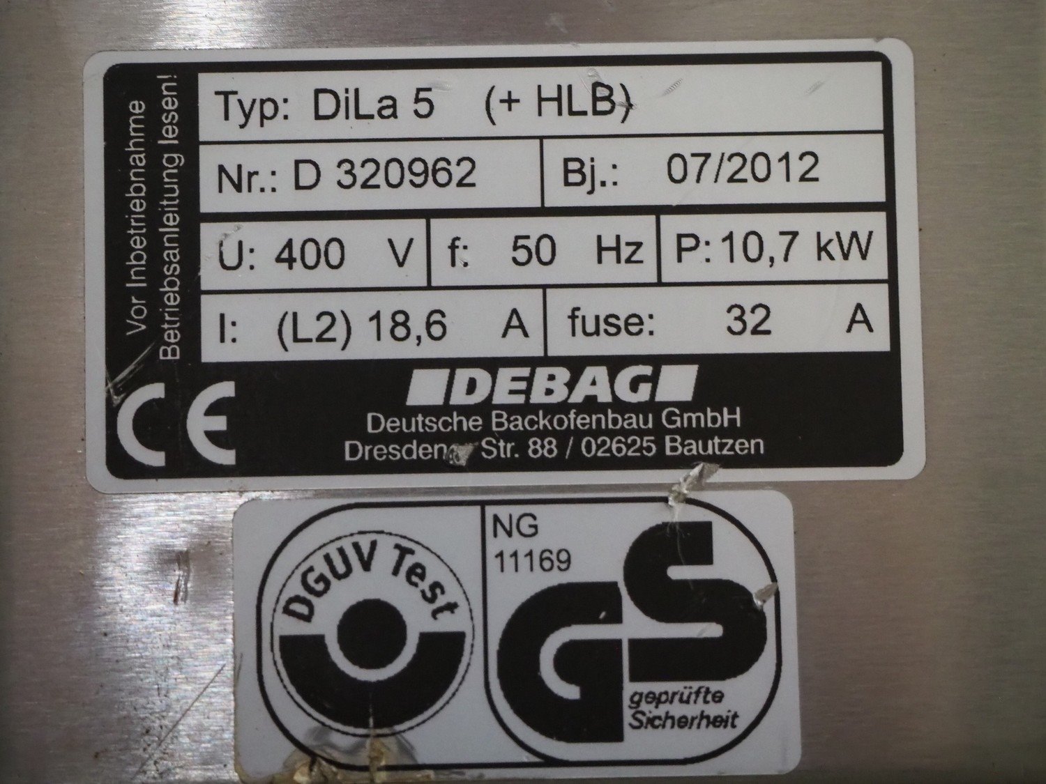 DEBAG double stacked oven, type: DiLa 5 and DiLa 10, number: D 320962 and D 320963, year of construction: 07/2012, 400 V, 50 Hz, 31.5/32 A, 20.5 kW, dimensions inside: 695 mm x 415 mm, total dimensions: 1100 mm x 920 mm x 2120 mm. Kavel locatie: Kaldenkerkerweg 5, 5932 CS Tegelen, Nederland