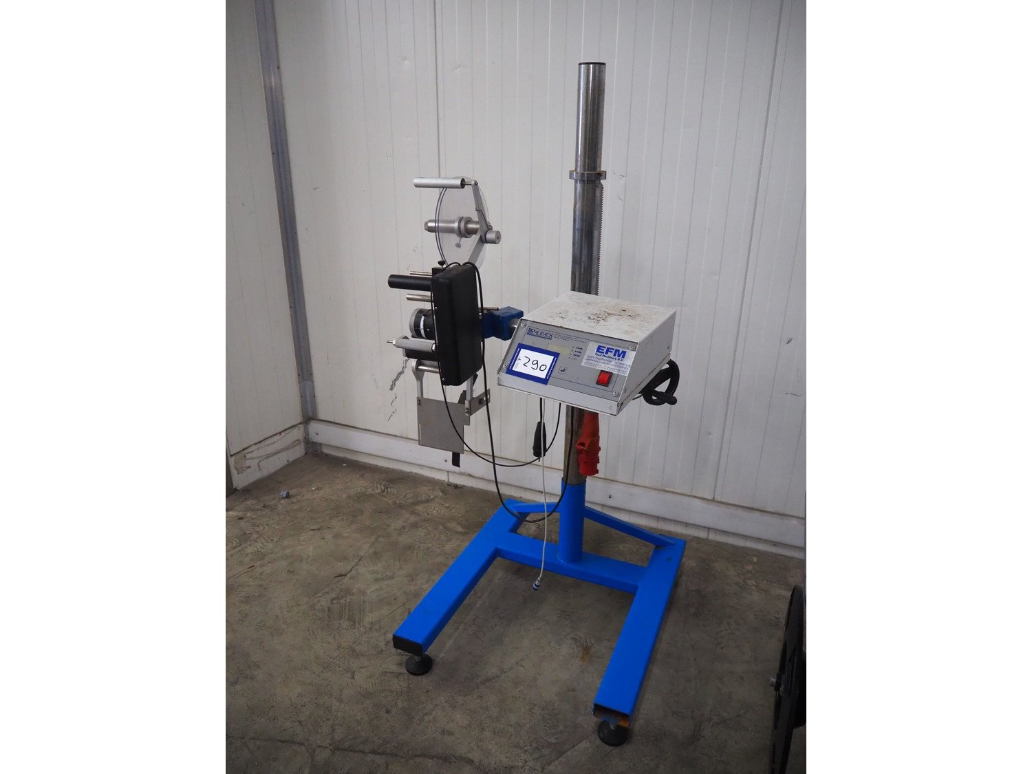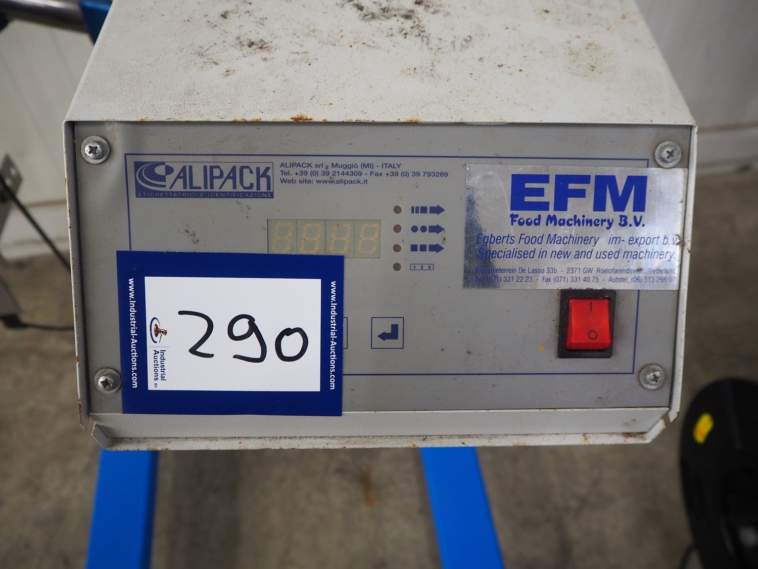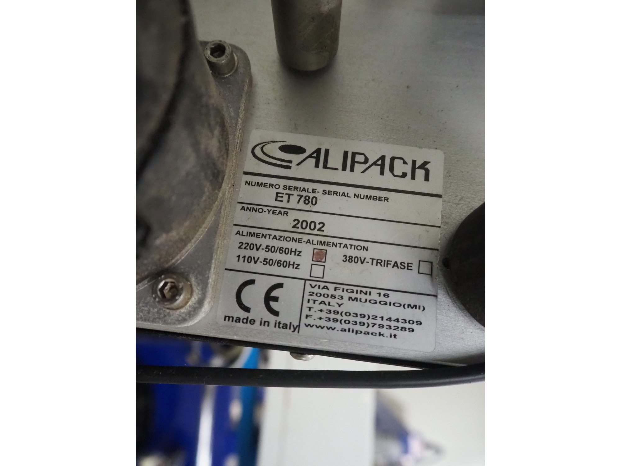 Alipack labelling machine, serial number: ET 780, year of construction: 2002, 220 V, 50/60 Hz, dimensions: 900 mm x 850 mm x 1660 mm. Kavel locatie: Kaldenkerkerweg 5, 5932 CS Tegelen, Nederland