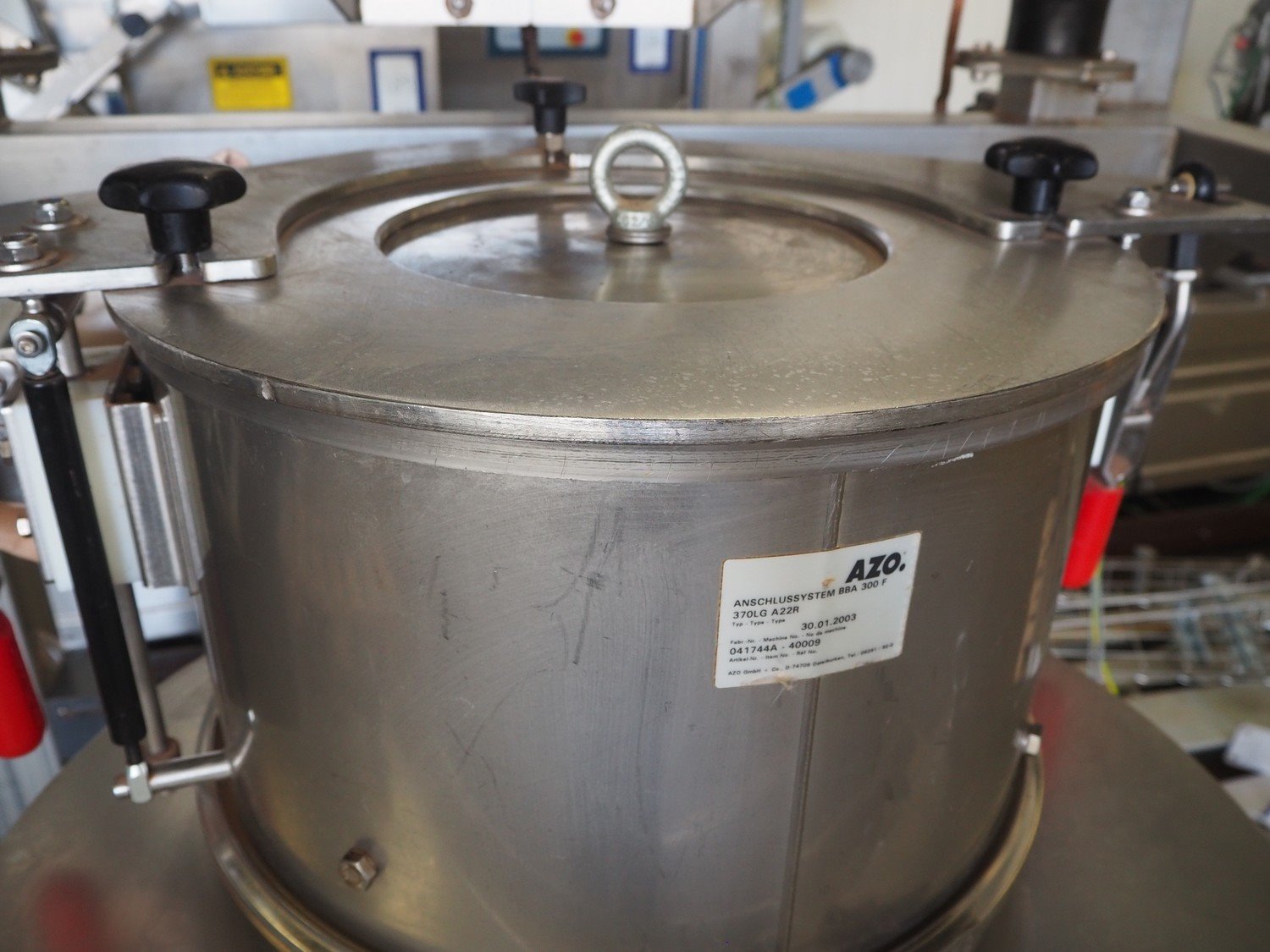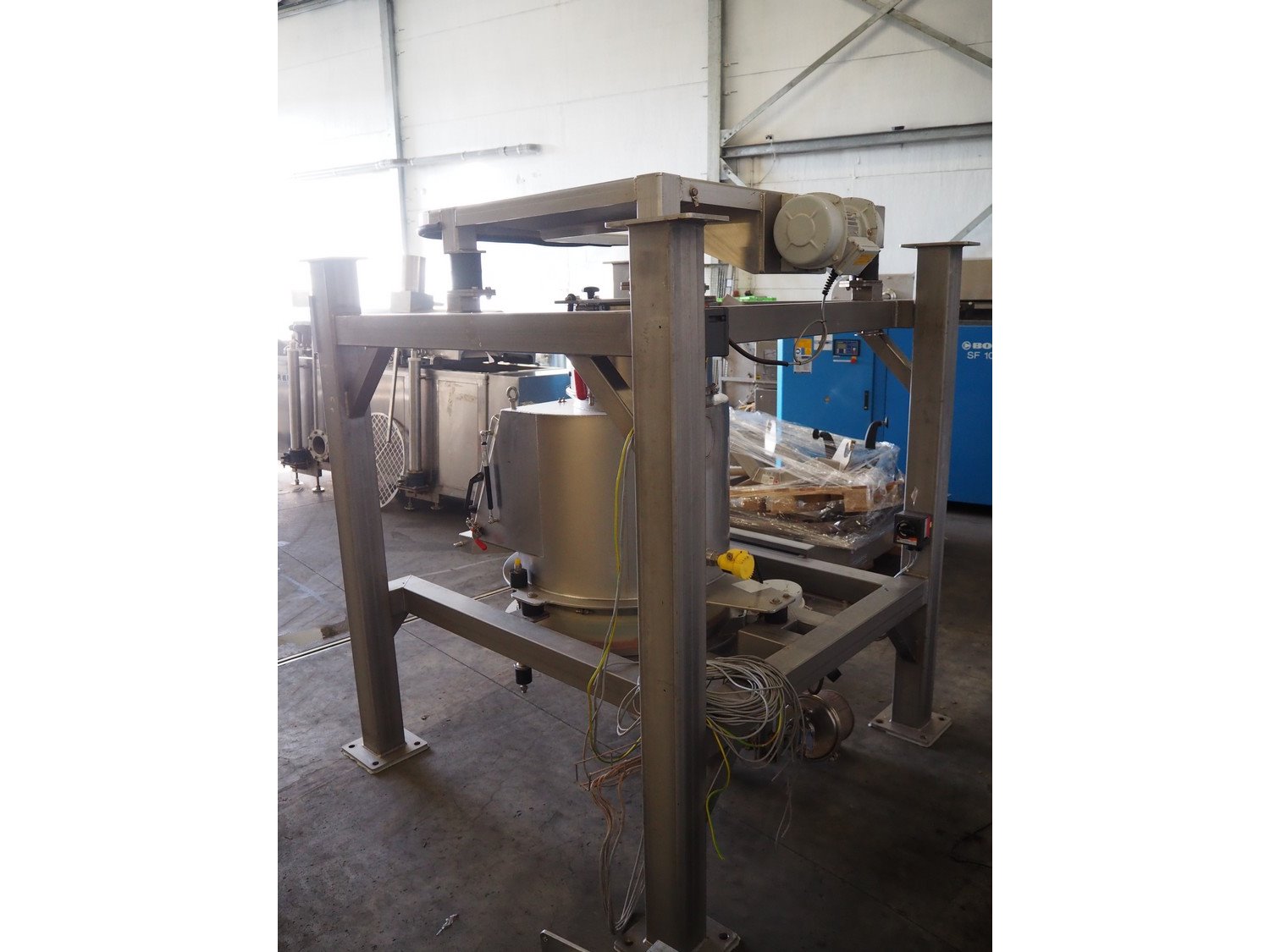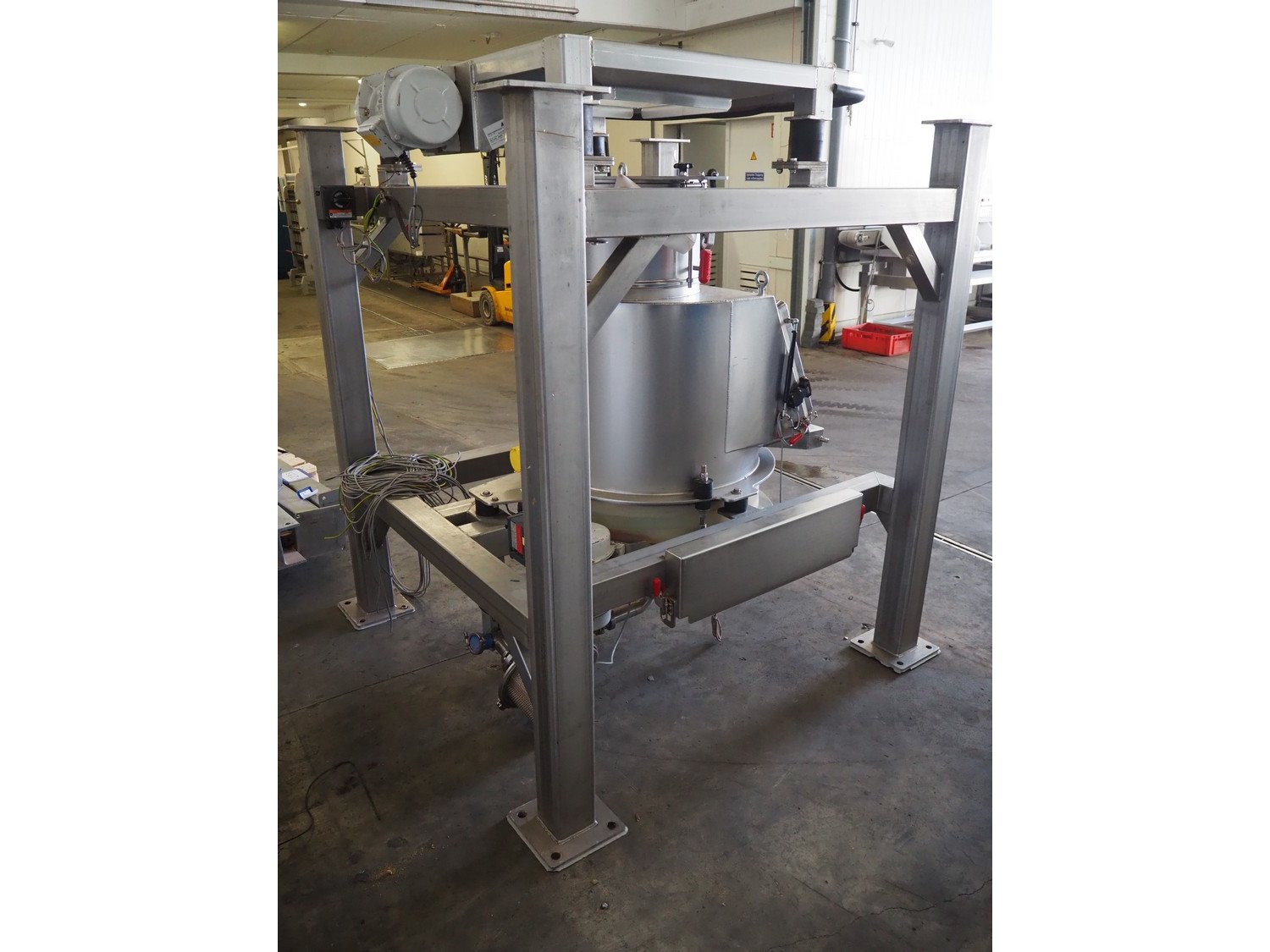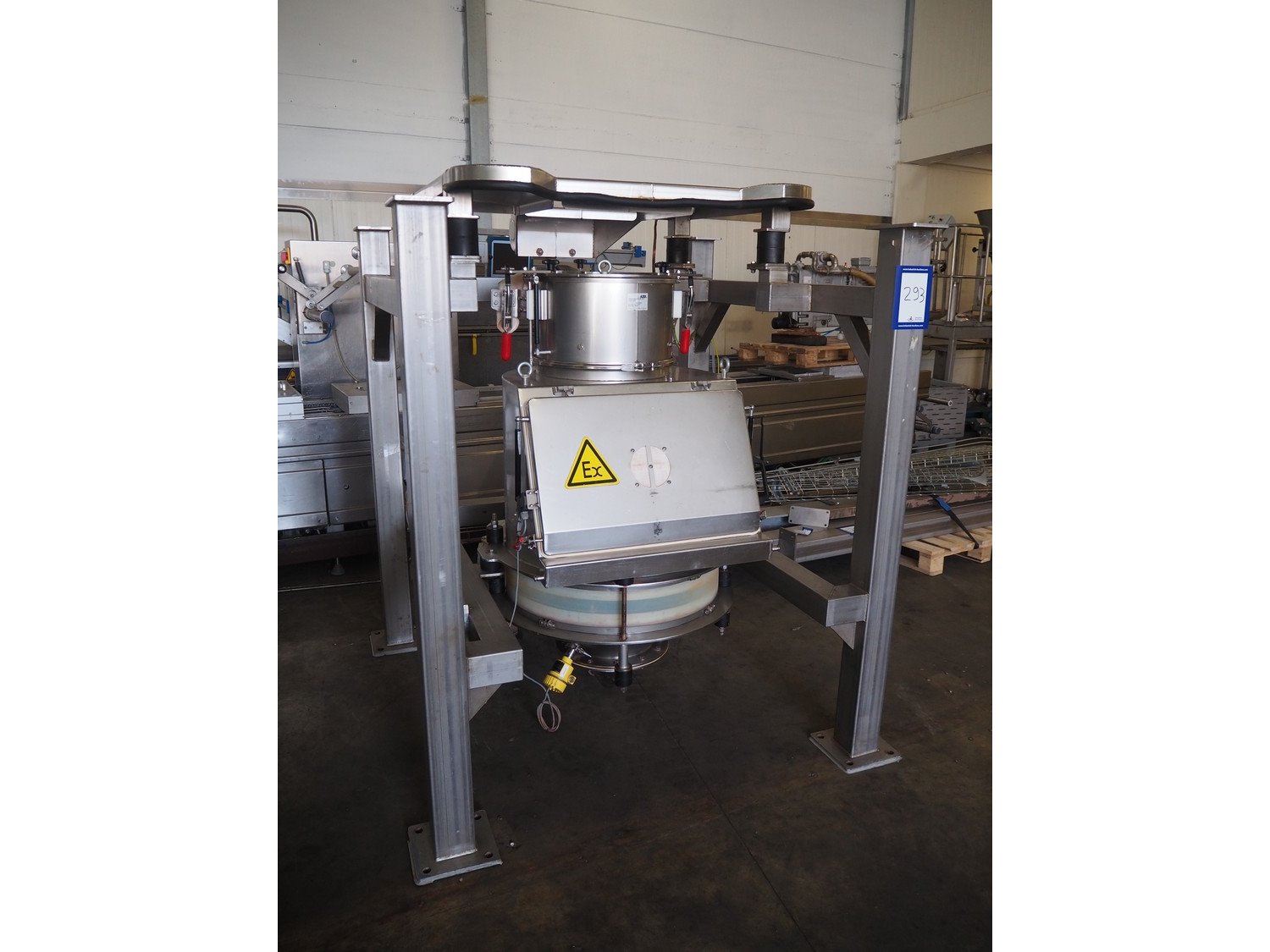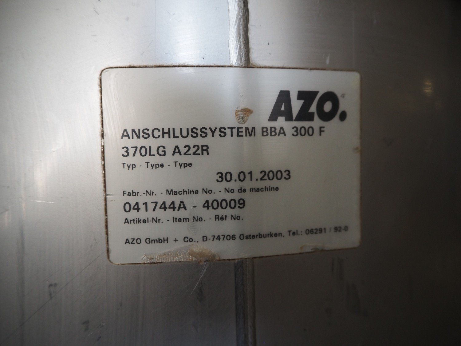 AZO big bag installation, type: BBA 300 F 370LG A22R, machine number: 041744A-40009, year of construction: 30-01-2003, ø inside: 310 mm and 780 mm, perforations: 8 mm and 40 mm, total dimensions: 1720 mm x 1680 mm x 2000 mm. Including 3 pallet with parts, Demag hoist, pole length: 3000 mm, dimensions pallet: 2100 mm x 100 mm x 400 mm, 1600 mm x 1600 mm x 900 mm, 3000 mm x 1200 mm x 500 mm and 1200 mm x 1000 mm x 400 mm. Kavel locatie: Kaldenkerkerweg 5, 5932 CS Tegelen, Nederland