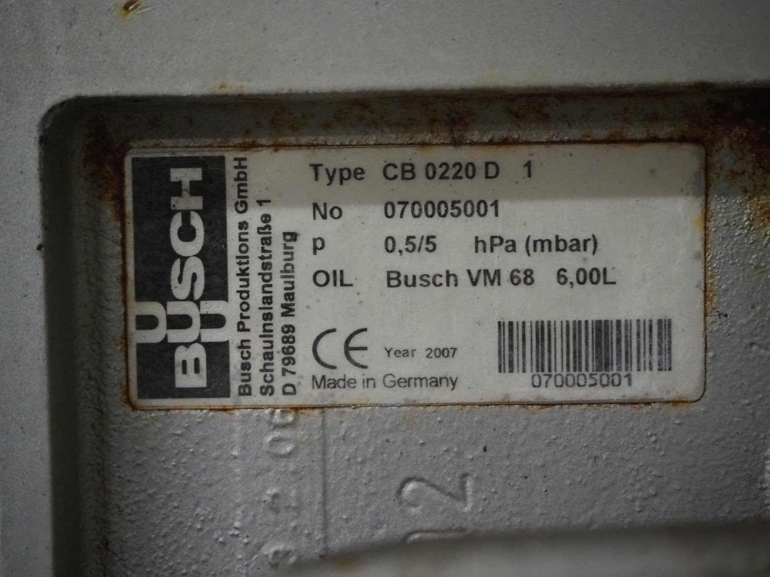 Busch vacuum pump, CB 0220 D 1, number: 070005001, capacity: 220 m³ per hour, dimensions: 1100 mm x 300 mm x 600 mm. Kavel locatie: Kaldenkerkerweg 5, 5932 CS Tegelen, Nederland
