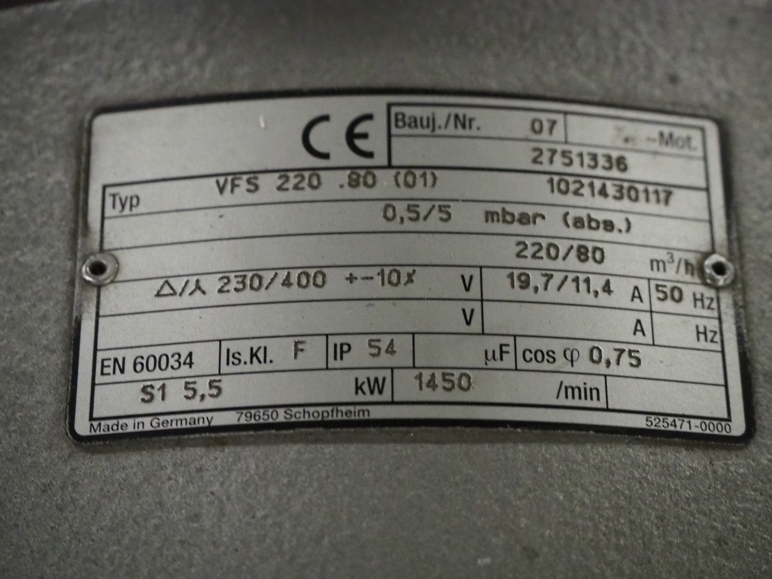 Rietschle vacuum pump, type: VFS 220.80 (01), number: 2751336, year of construction: 2007, capacity: 220/80 m³ per hour, dimensions: 1030 mm x 600 mm x 700 mm. Kavel locatie: Kaldenkerkerweg 5, 5932 CS Tegelen, Nederland