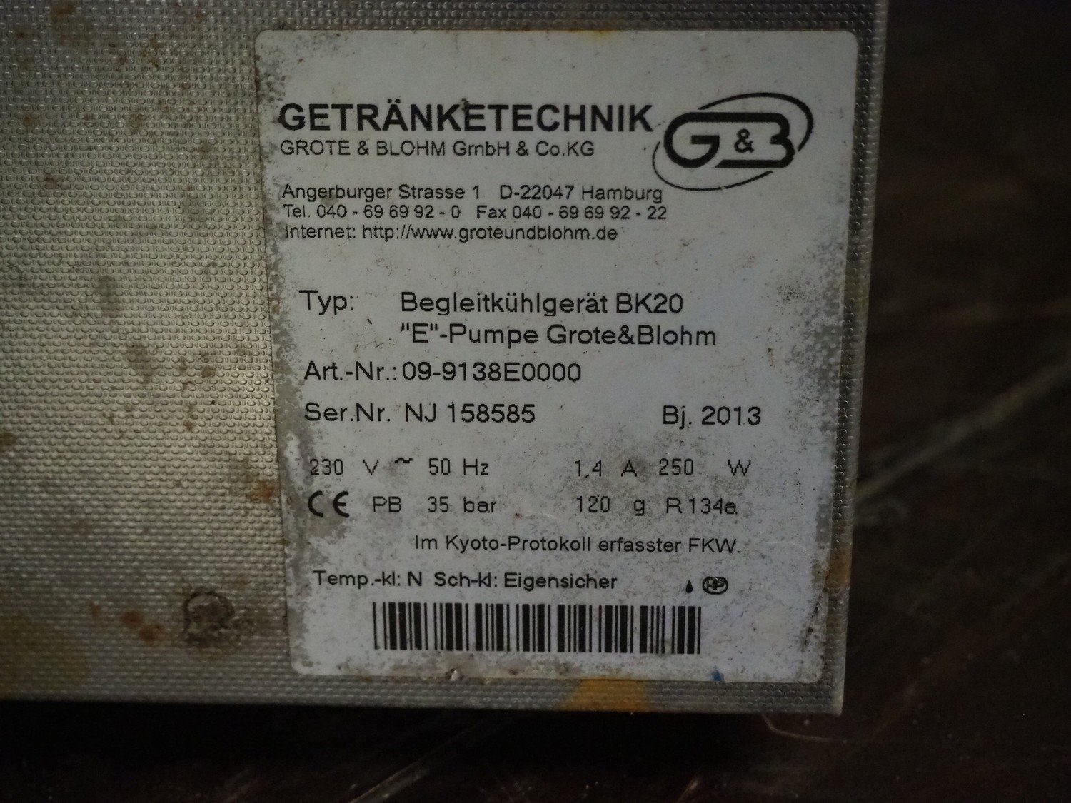 Getränketechinik Grote & Blohm GmbH & Co. KG cooling unit, type: begleitkühlgerät BK20, serial number: NJ 158585, year of construction: 2013, 230 V, 50 Hz, 1.4 A, 250 W, refrigerant: R134a/120 g, dimensions: 380 mm x 300 mm x 340 mm. Kavel locatie: Kaldenkerkerweg 5, 5932 CS Tegelen, Nederland