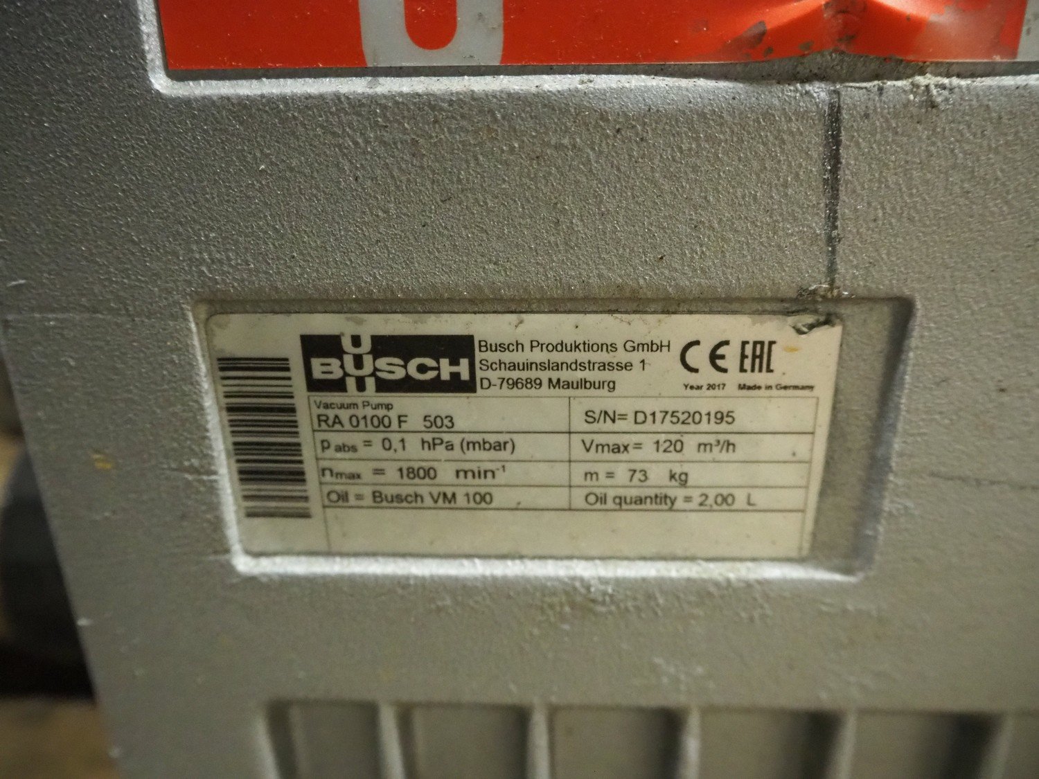 Busch vacuum pump, type: RA 0100 F 503, serial number: D17520195, capacity: 120 m³ per hour, dimensions: 700 mm x 400 mm x 300 mm. Kavel locatie: Kaldenkerkerweg 5, 5932 CS Tegelen, Nederland
