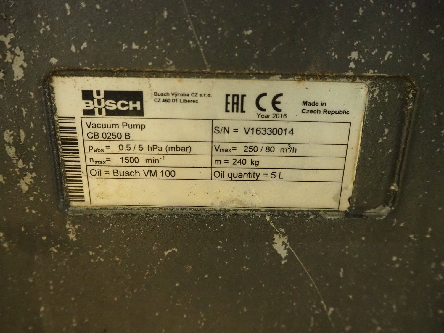 Busch vacuum pump, type: CB 0250 B, serial number: V16330014, capacity: 250/80 m³ per hour, dimensions: 1050 mm x 550 mm x 420 mm. Kavel locatie: Kaldenkerkerweg 5, 5932 CS Tegelen, Nederland