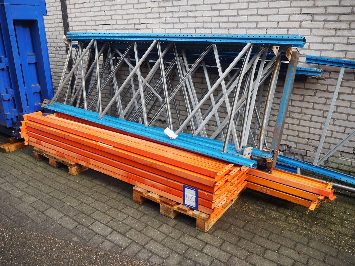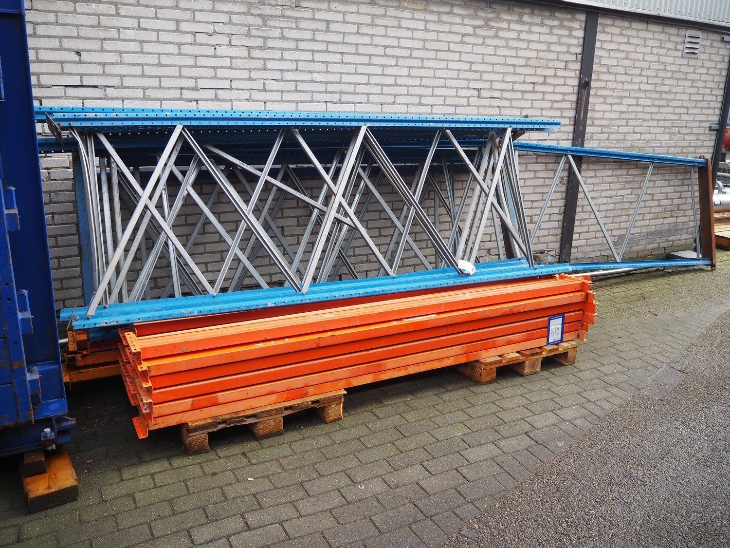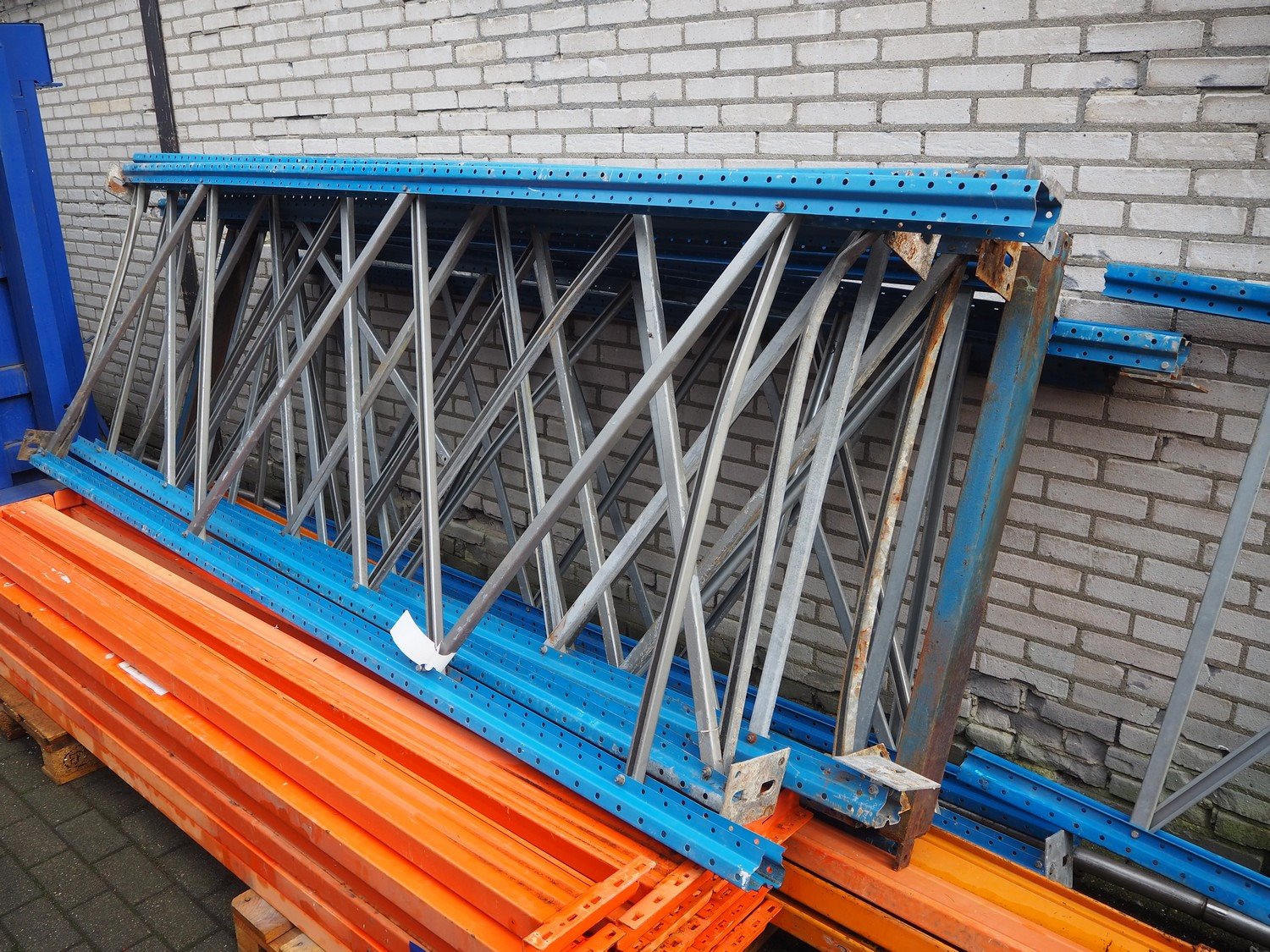 Pallet rack with 9 uprights and 21 beams, dimensions uprights: (9x) 1100 mm x 100 mm x 3000 mm, length beams: (16x) 2780 mm and (5x) 3400 mm. Kavel locatie: Kaldenkerkerweg 5, 5932 CS Tegelen, Nederland