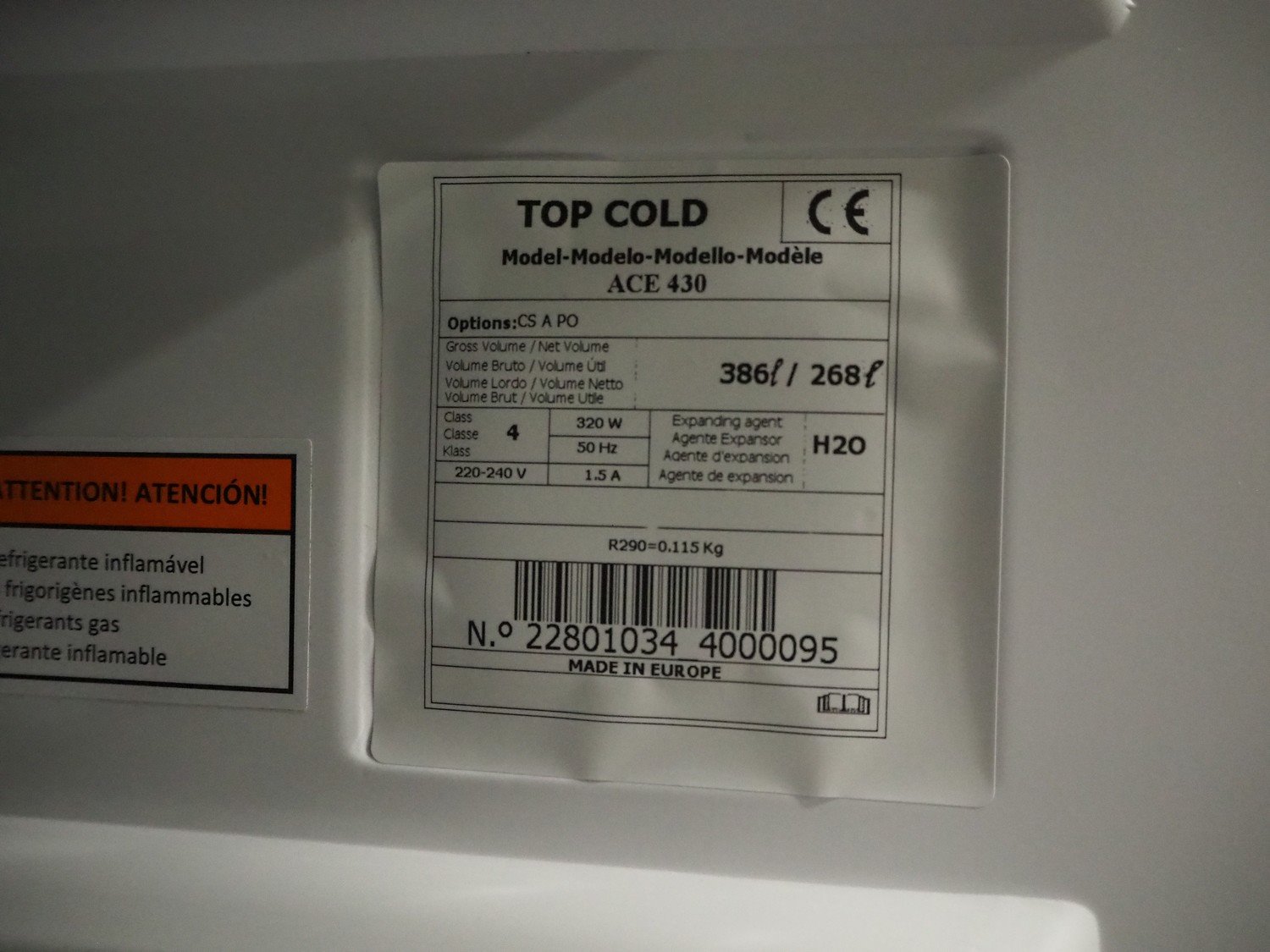 Top Cold freezer, model: ACE 430, number: 22801034 4000095, 220/240 V, 50 Hz, 1.5 A, 320 W, refrigerant: R290/ 0.115 kg, 6 floors, dimensions each floor: 475 mm x 385 mm, total dimensions: 620 mm x 620 mm x 1830 mm. Never used. Kavel locatie: Kaldenkerkerweg 5, 5932 CS Tegelen, Nederland