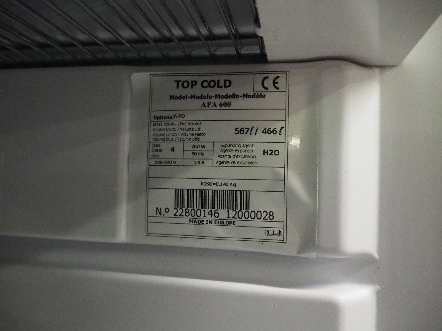 Top Cold freezer, model: APA 600, number: 22800146 12000028, 220/240 V, 50 Hz, 1.5 A, 260 W, refrigerant: R290/ 0.140 kg, 6 floors, dimensions each floor: 630 mm x 500 mm, total dimensions: 750 mm x 720 mm x 1850 mm. Never used. Kavel locatie: Kaldenkerkerweg 5, 5932 CS Tegelen, Nederland