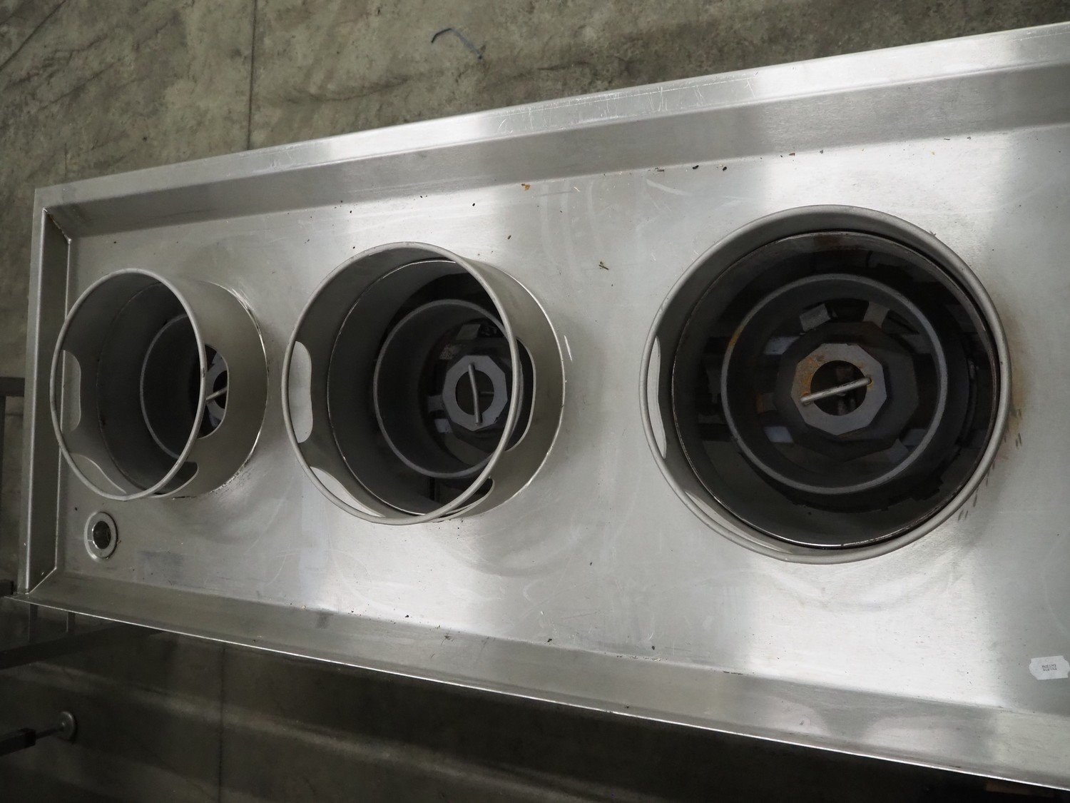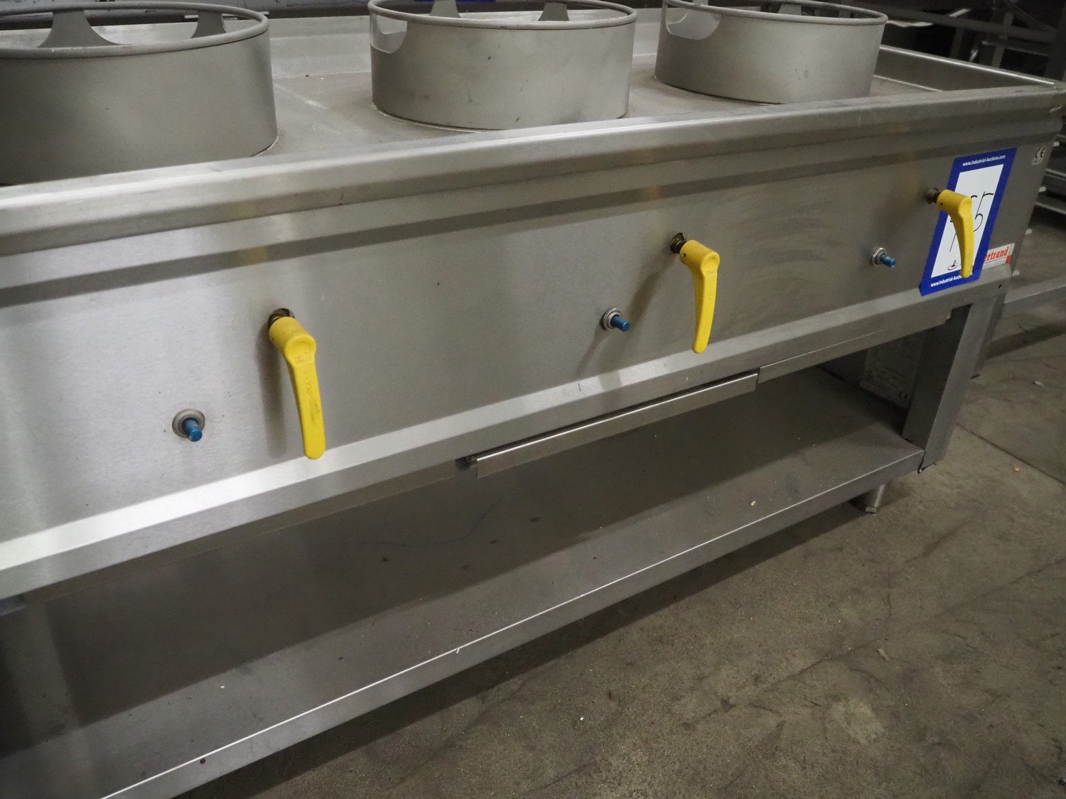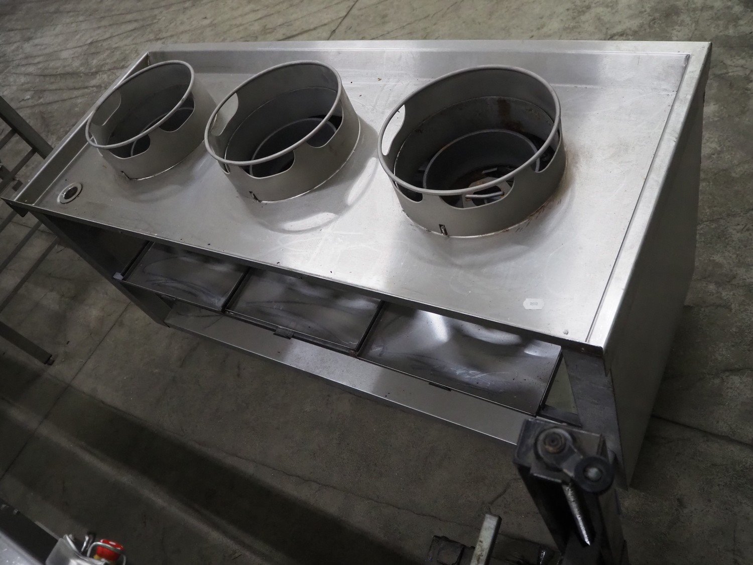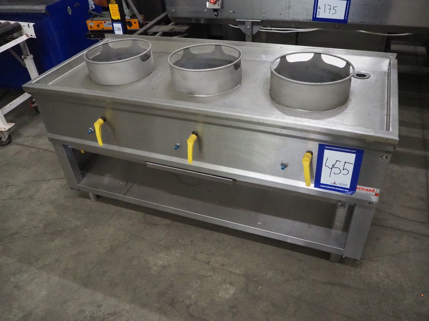 Bertrand 3-pits wok stove, ø stove: (3x) 290 mm, total dimensions: 1500 mm x 680 mm x 800 mm. Kavel locatie: Kaldenkerkerweg 5, 5932 CS Tegelen, Nederland