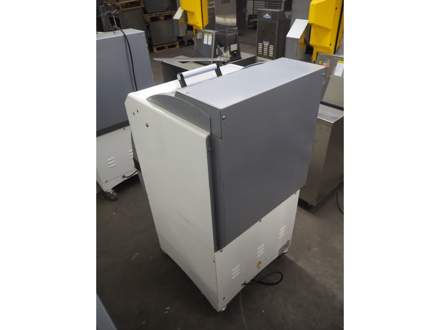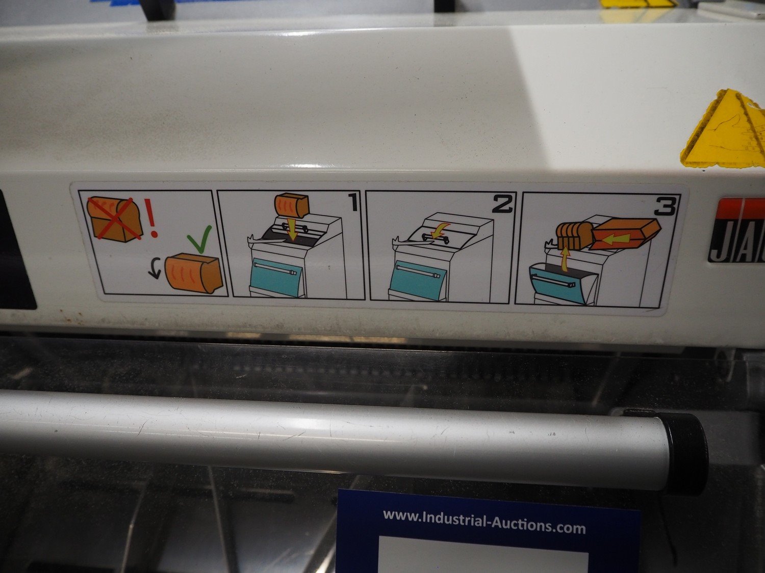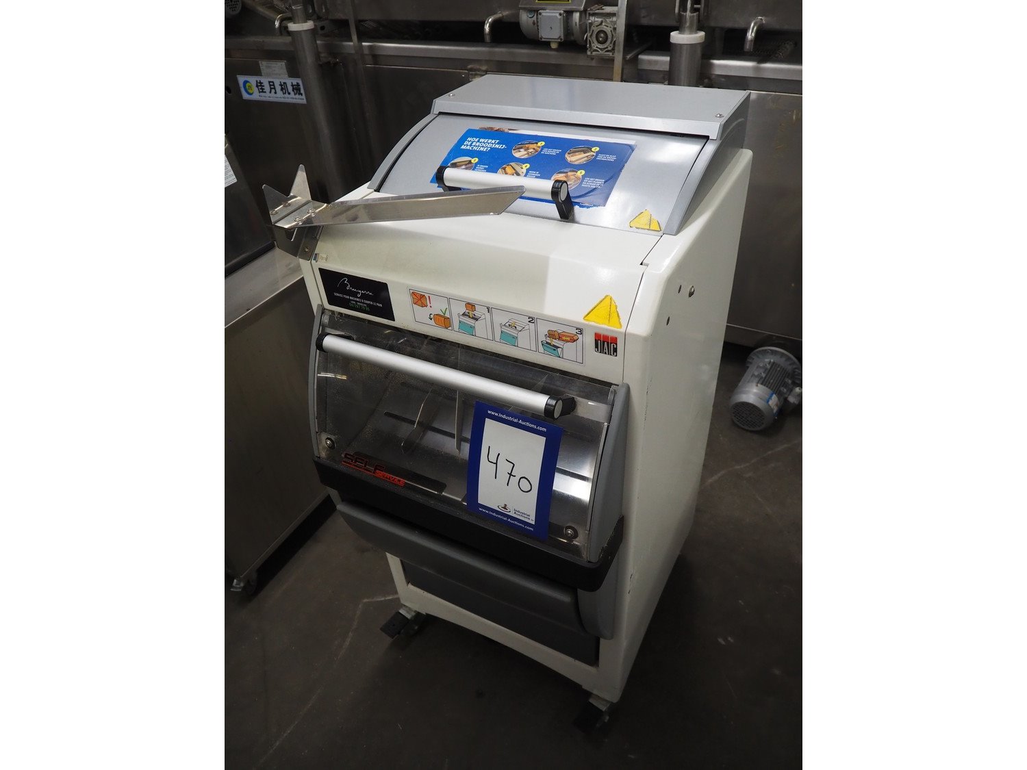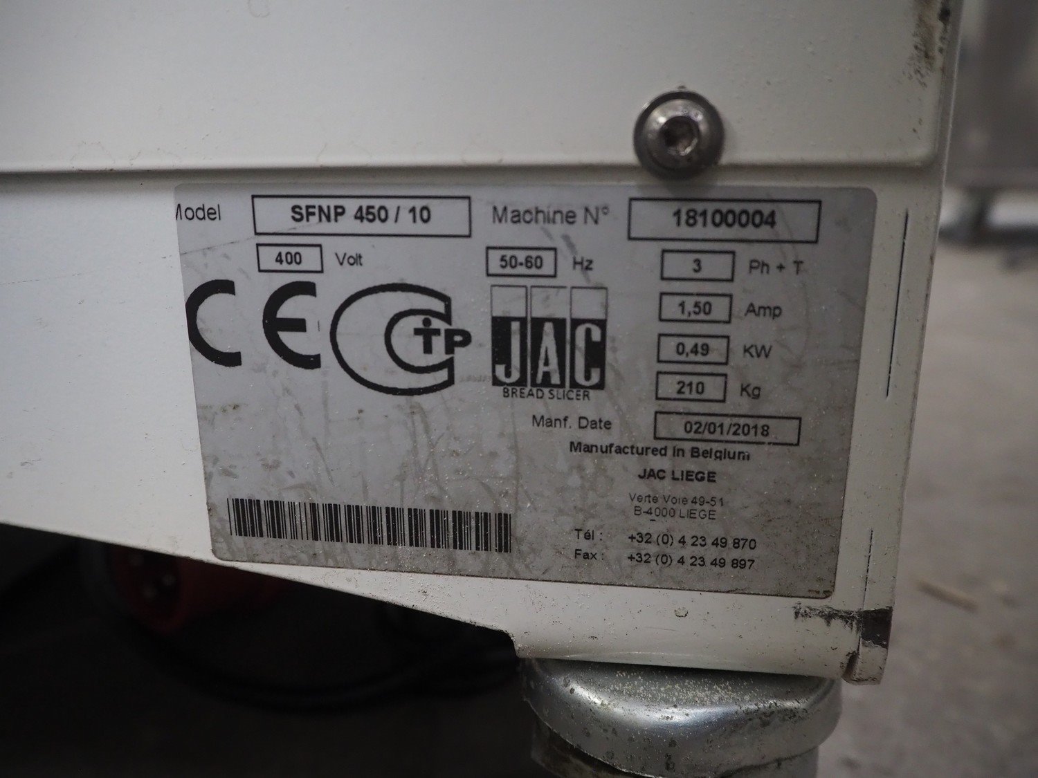 JAC mobile bread slicer, model: SFNP 450/10, machine number: 18100004, year of construction: 02/01/2018, 400 V, 3 Ph, 50/60 Hz, 1.5 A, 0.49 kW, weight: 210 Kg, working width: 415 mm, total dimensions: 740 mm x 600 mm x 1220 mm. Kavel locatie: Kaldenkerkerweg 5, 5932 CS Tegelen, Nederland