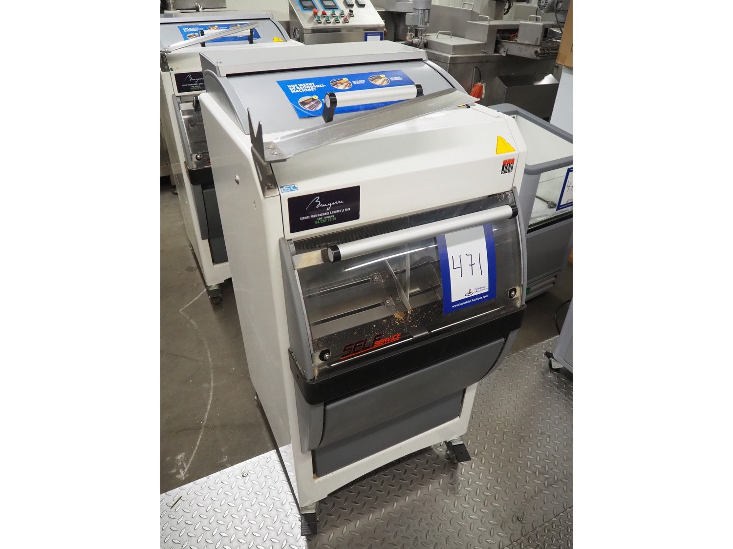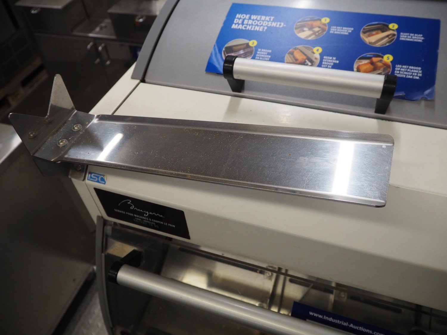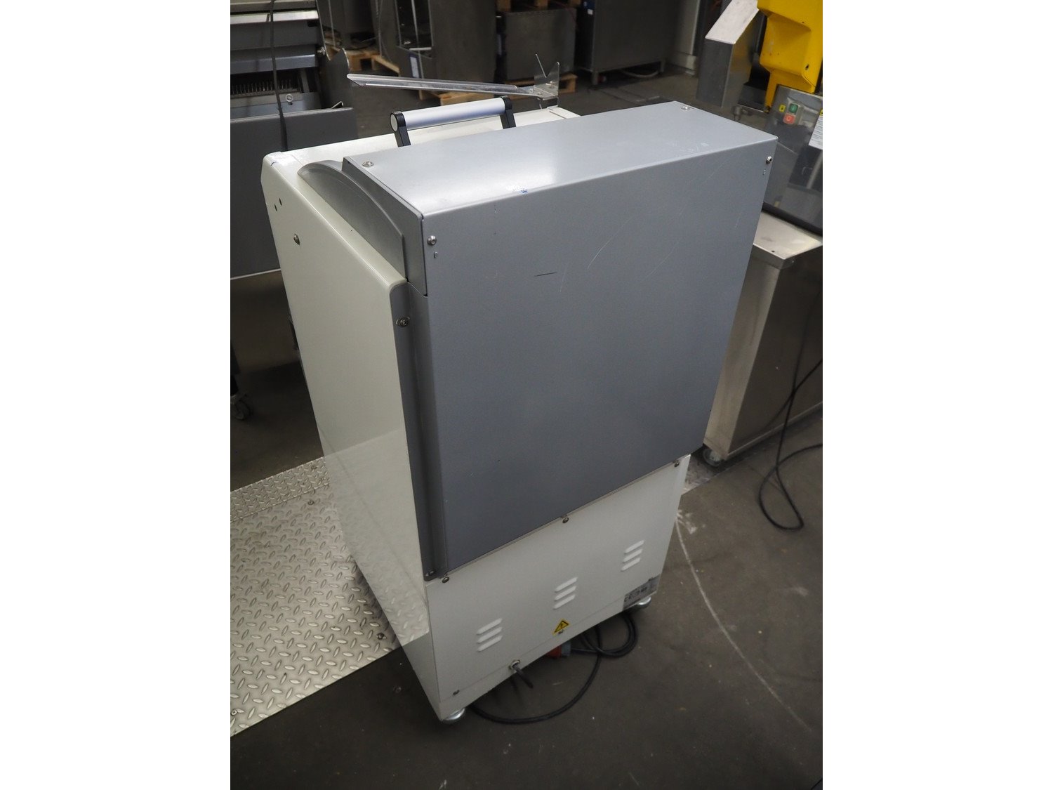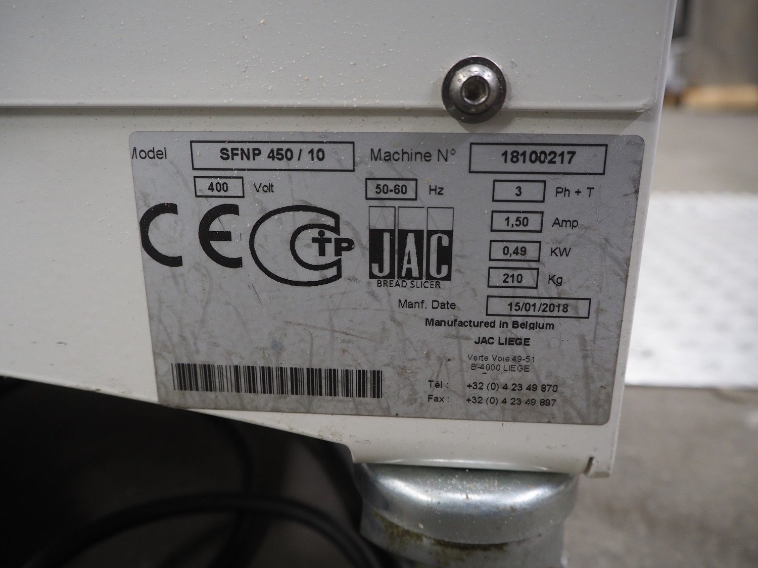 JAC mobile bread slicer, model: SFNP 450/10, machine number: 18100217, year of construction: 15/01/2018, 400 V, 3 Ph, 50/60 Hz, 1.5 A, 0.49 kW, weight: 210 Kg, working width: 415 mm, total dimensions: 740 mm x 600 mm x 1220 mm. Kavel locatie: Kaldenkerkerweg 5, 5932 CS Tegelen, Nederland