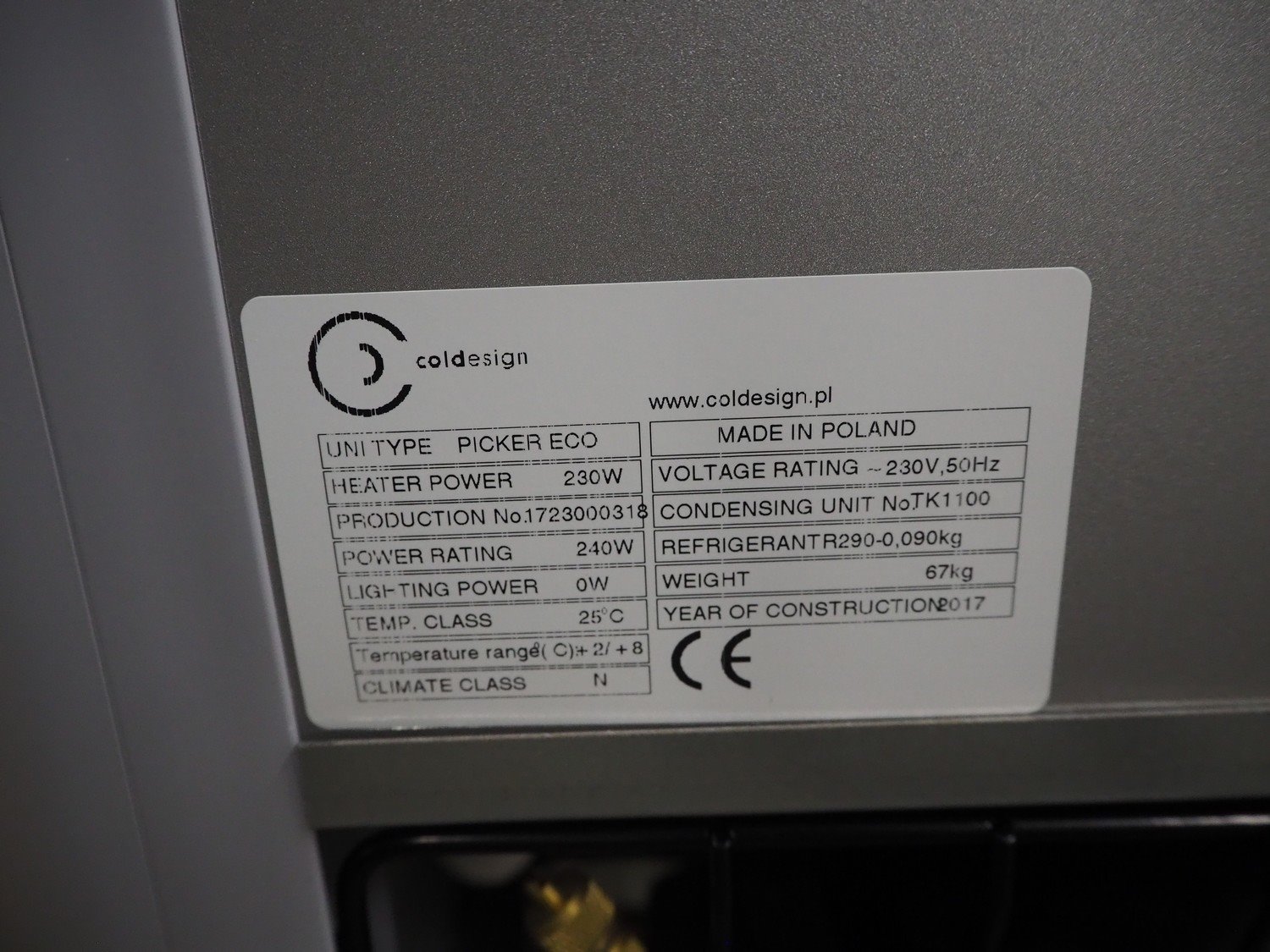 Cold design mobile refrigerated showcase, type: PICKER ECO, production number: 1723000318, year of construction: 2017, 230 V, 50 Hz, 230 W, weight: 67 Kg, dimensions inside: 410 mm x 410 mm x 300 mm, total dimensions: 600 mm x 500 mm x 850 mm. Kavel locatie: Kaldenkerkerweg 5, 5932 CS Tegelen, Nederland