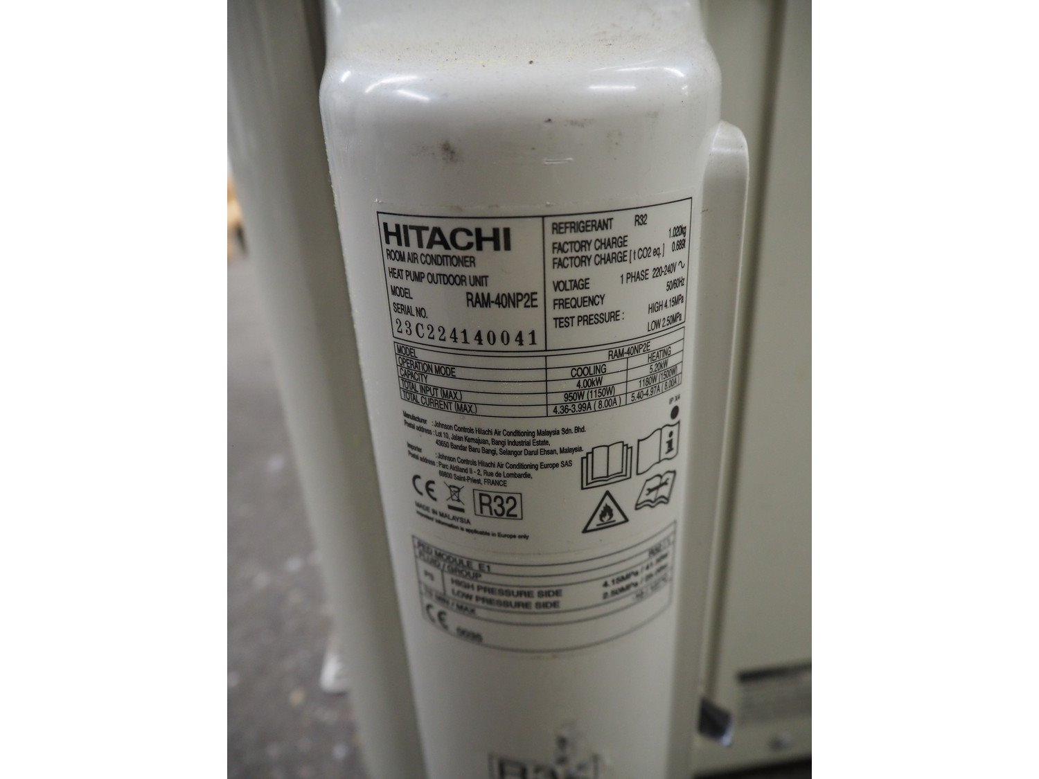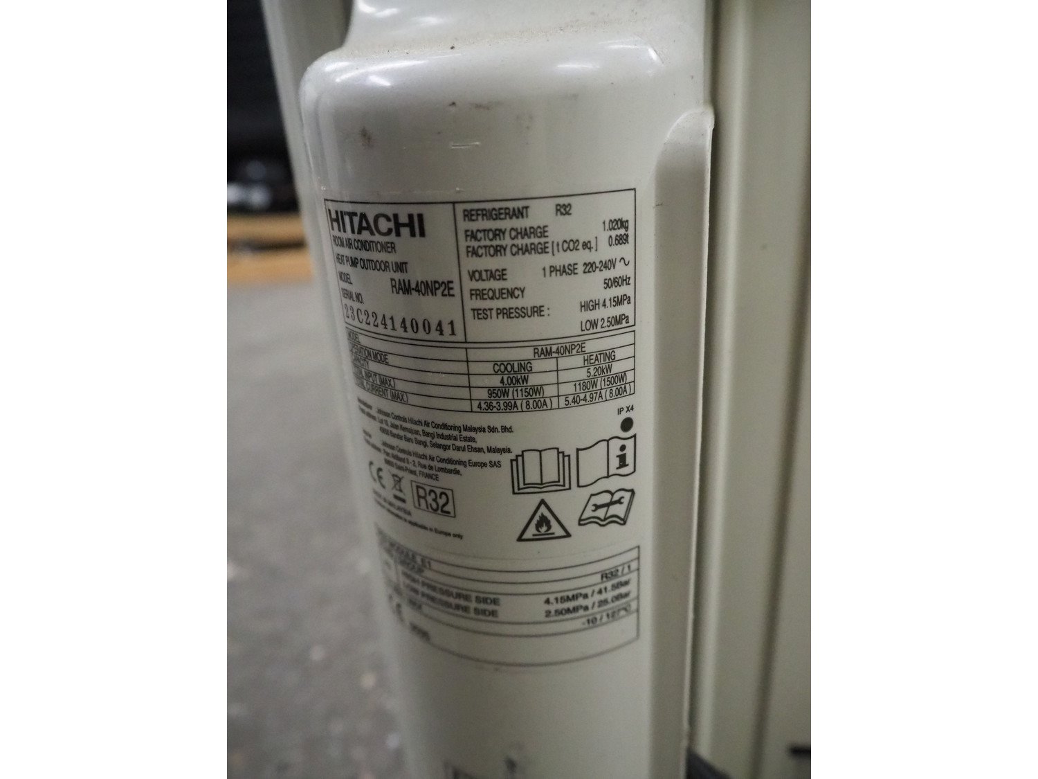 Hitachi air conditioner, model: RAM-40NP2E, serial number: 23C224140041, 220-240 V, 1 Ph, 50/60 Hz, dimensions: 850 mm x 350 mm x 580 mm. Kavel locatie: Kaldenkerkerweg 5, 5932 CS Tegelen, Nederland