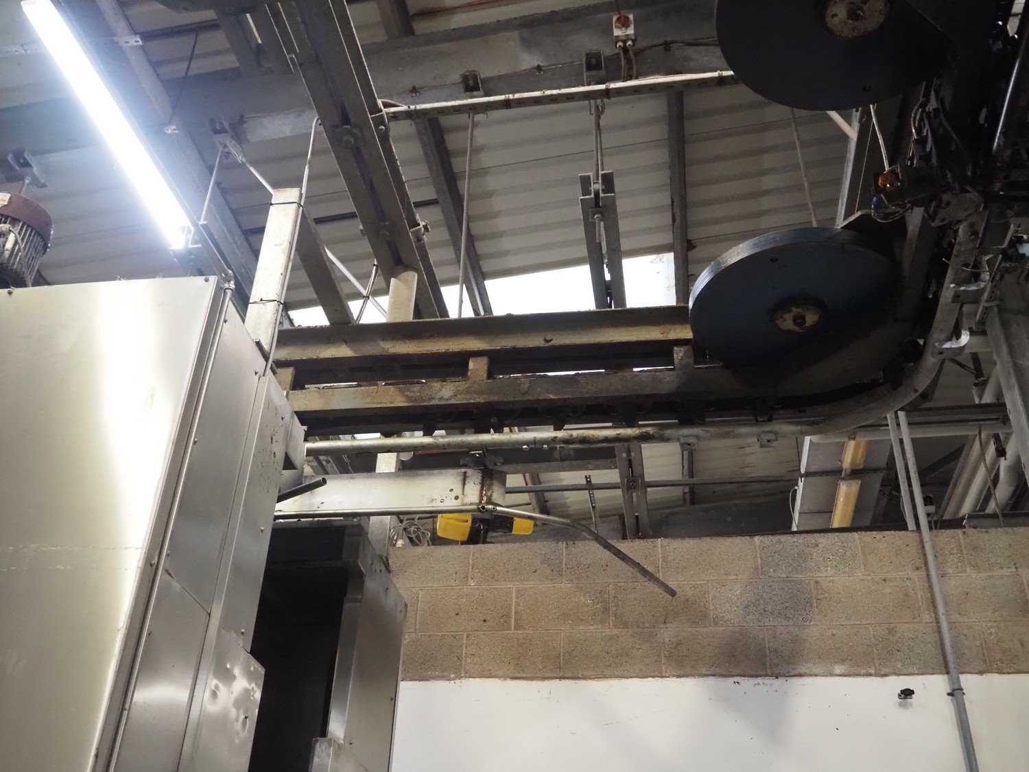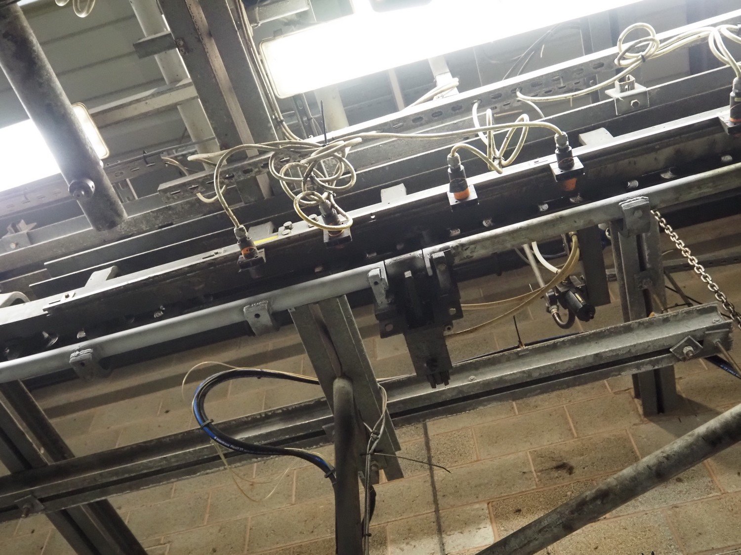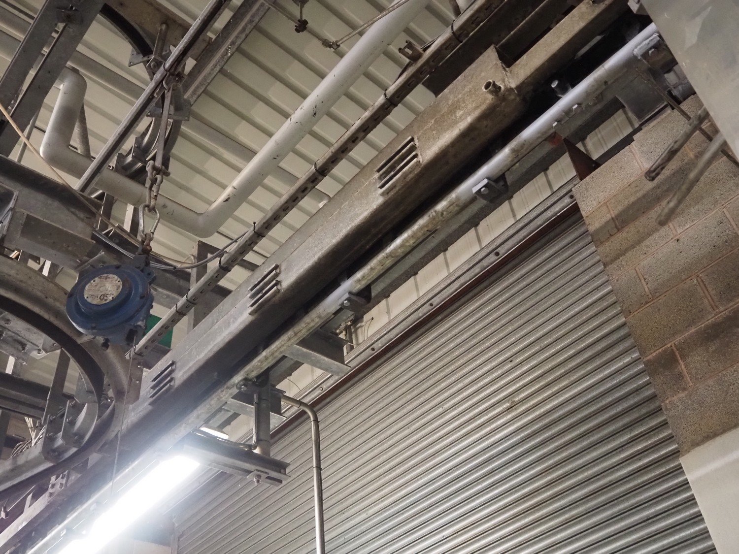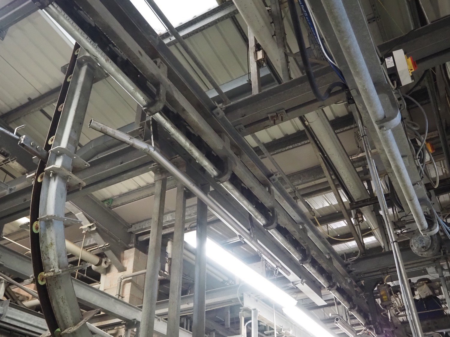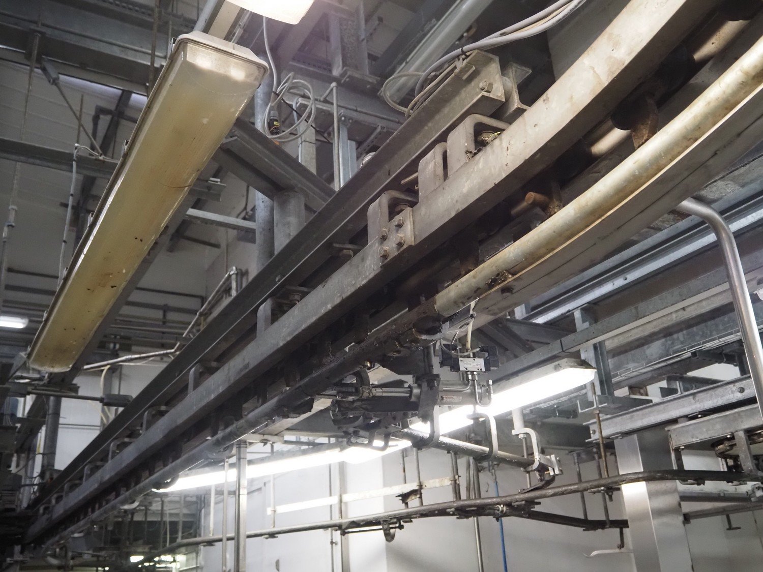 Banss Schlacht- und Fördertechnik GmbH tube rail conveyor, year of construction: 2006, capacity: 240 pigs / 120 sows per hour, tube diameter: 49 mm, approximate length tube rail: 52 meters, approximate length chain conveyor: 100 meters. Kavel locatie: Baulker Lane, NG21 9BG Clipstone, Mansfield, Verenigd Koninkrijk