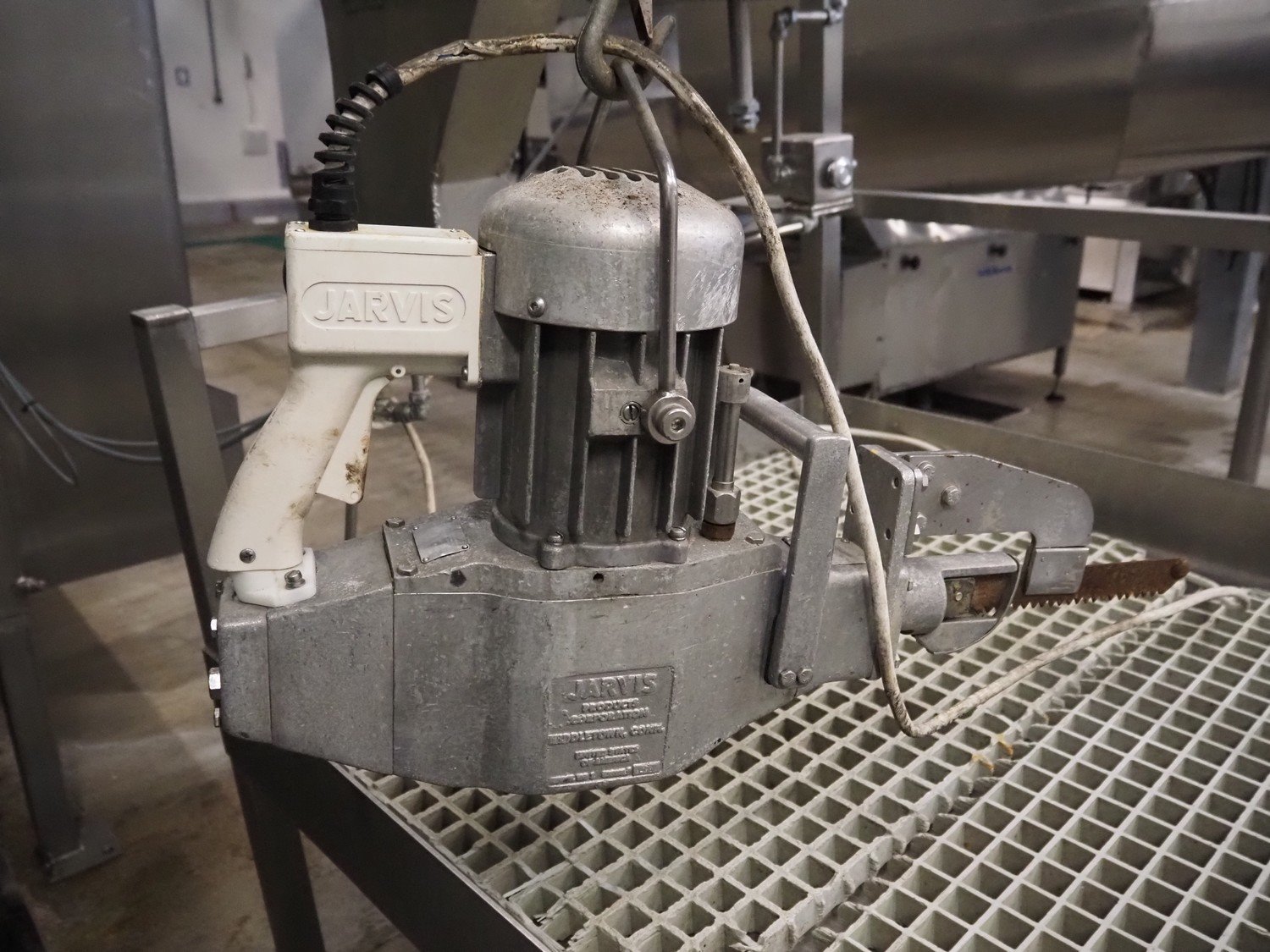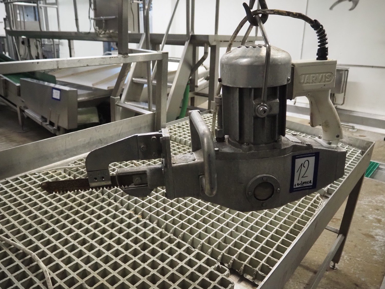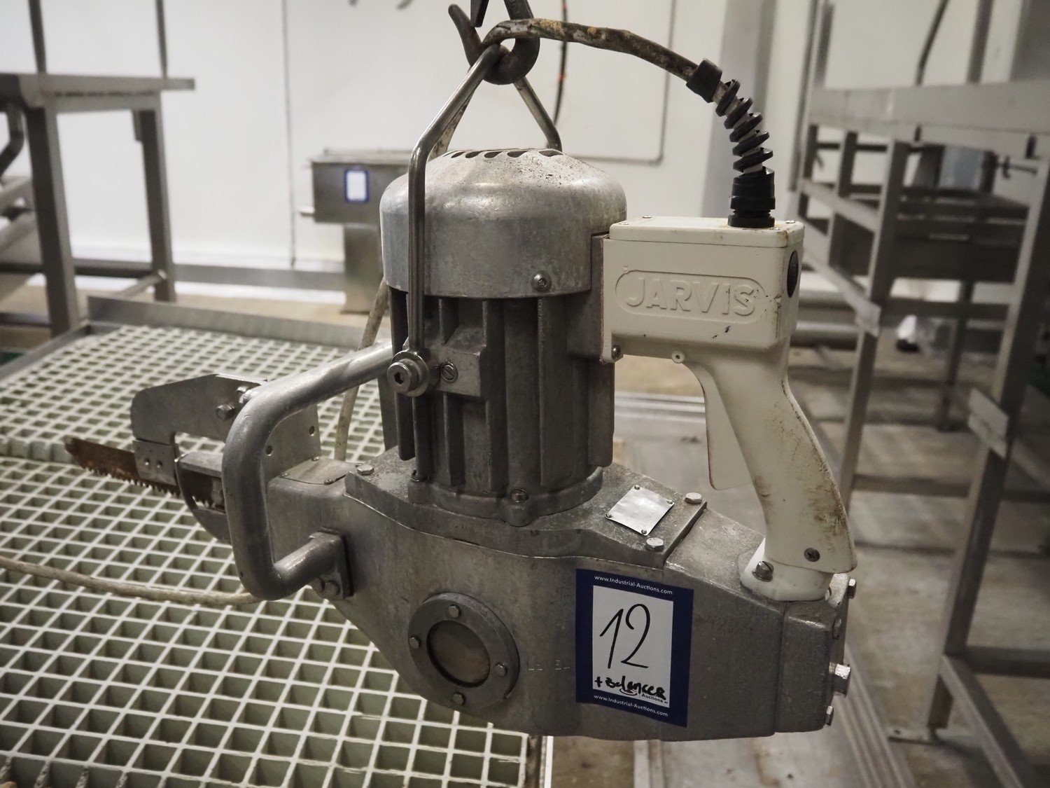 Jarvis brisket saw, model: MG-1E, serial number: 68815, 115 V, 50 Hz, 6.6 A, 950 W, 2800 rpm, saw length: 200 mm, total dimensions: 800 mm x 220 mm x 450 mm. With balancer. Kavel locatie: Baulker Lane, NG21 9BG Clipstone, Mansfield, Verenigd Koninkrijk