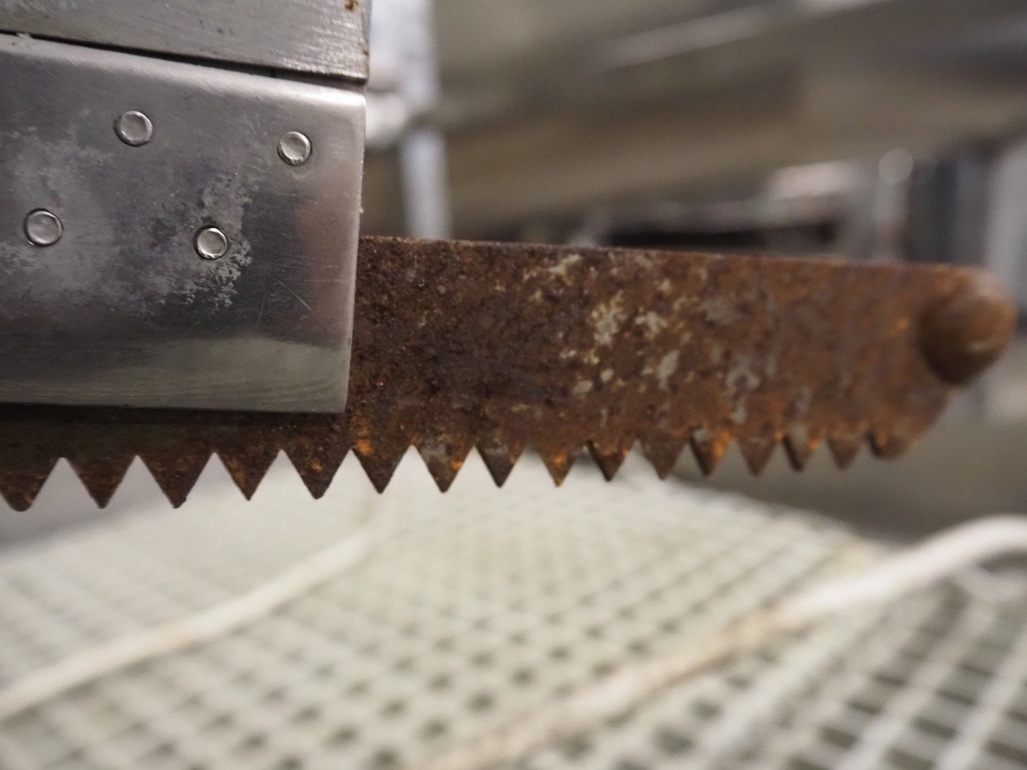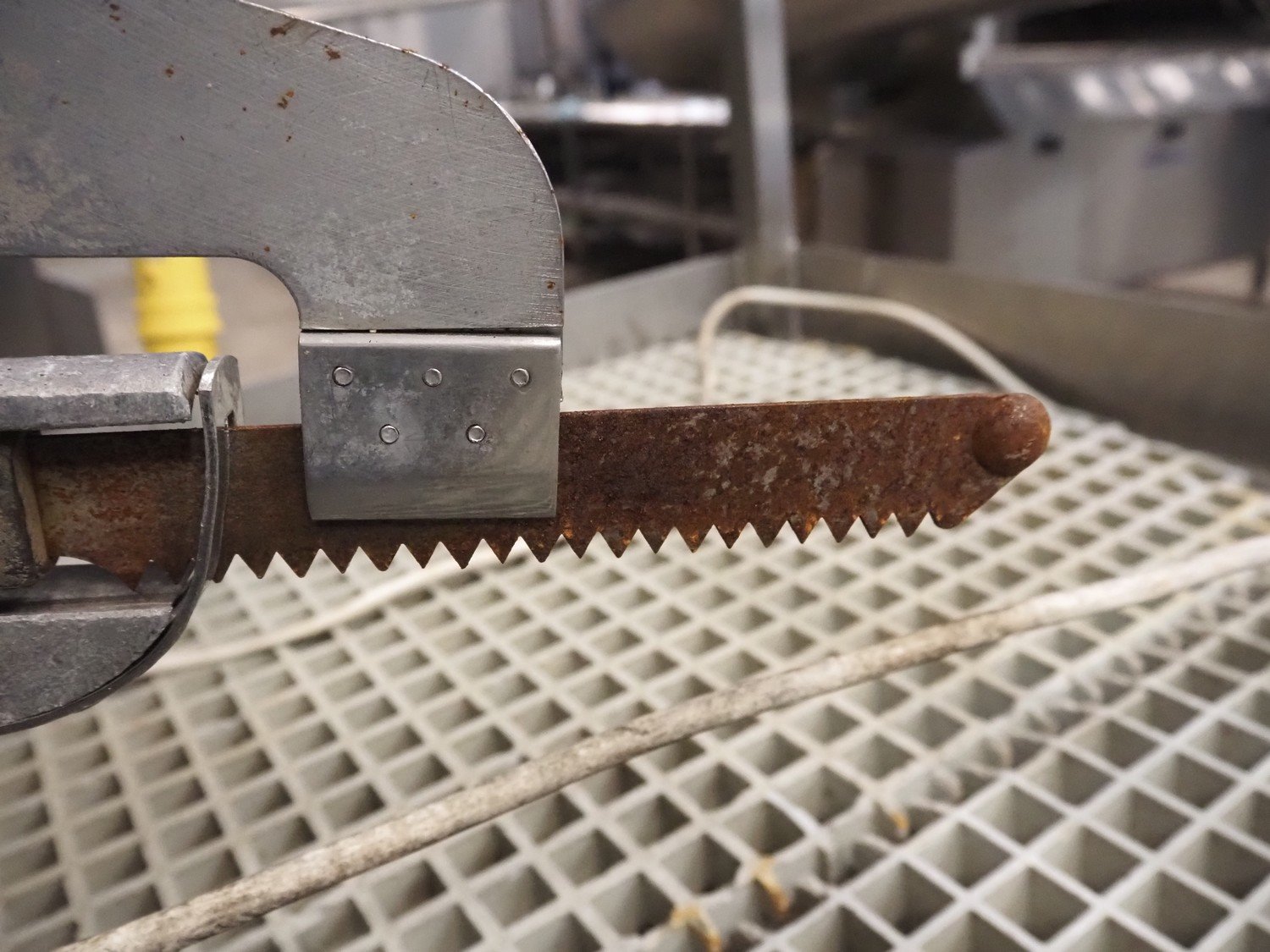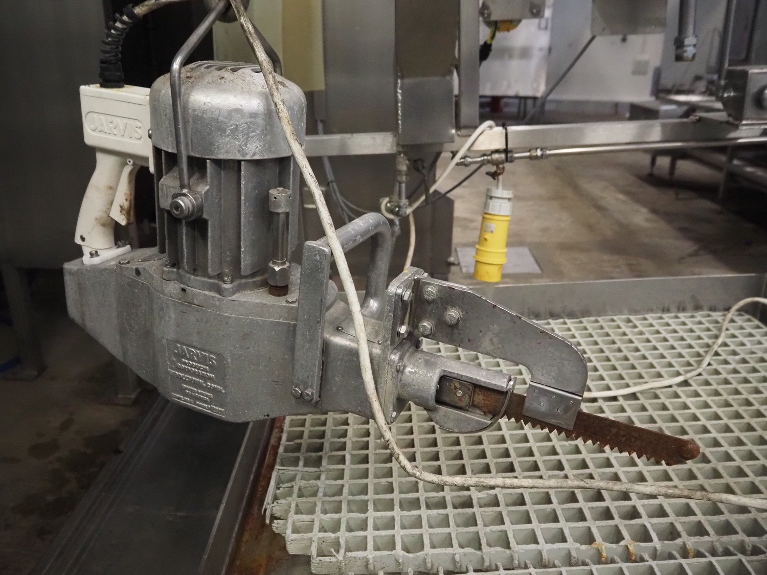 Jarvis brisket saw, model: MG-1E, serial number: 68815, 115 V, 50 Hz, 6.6 A, 950 W, 2800 rpm, saw length: 200 mm, total dimensions: 800 mm x 220 mm x 450 mm. With balancer. Kavel locatie: Baulker Lane, NG21 9BG Clipstone, Mansfield, Verenigd Koninkrijk