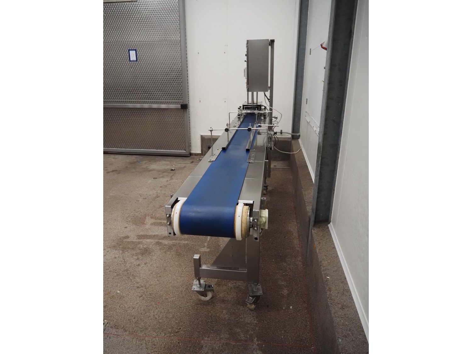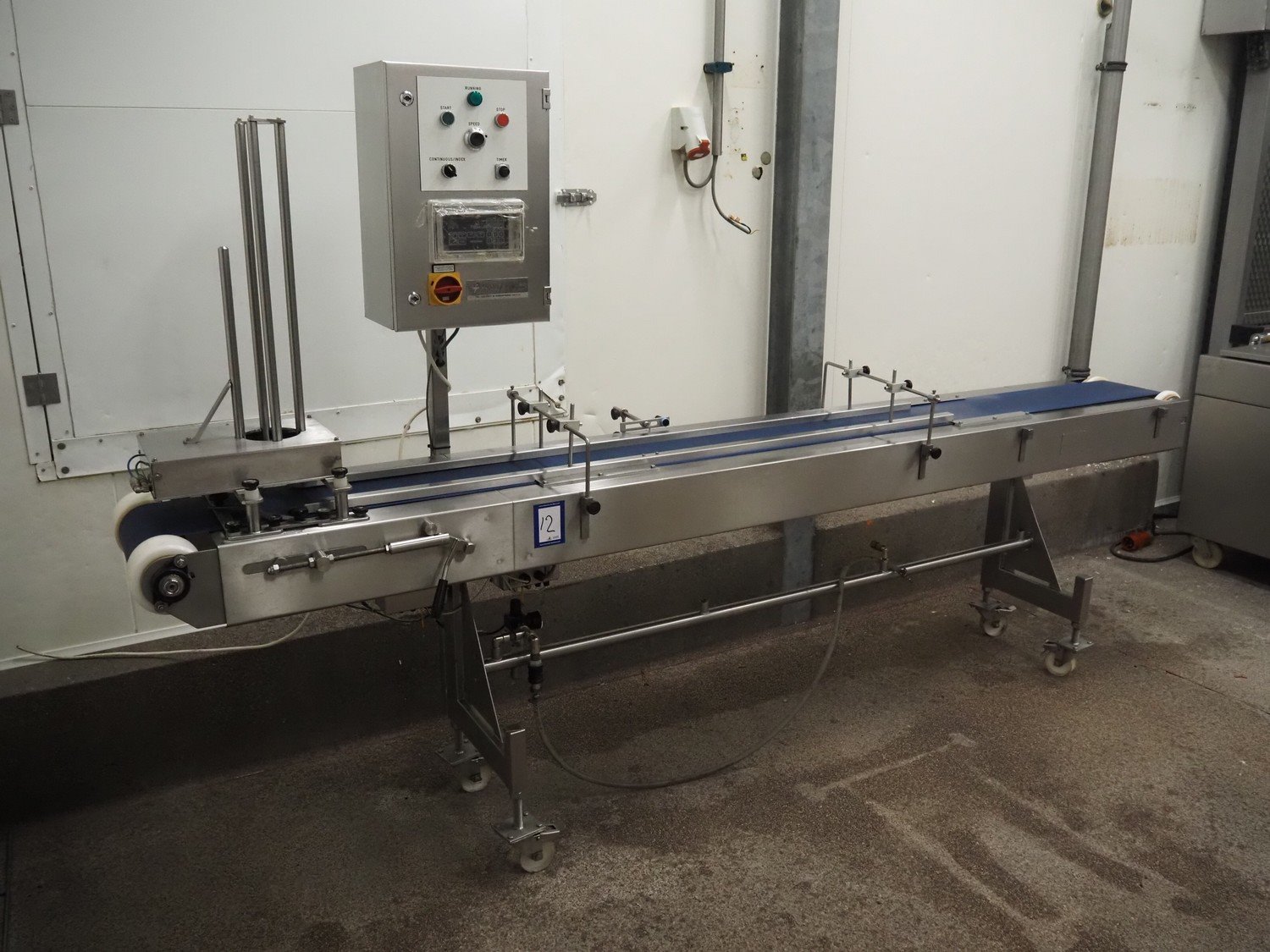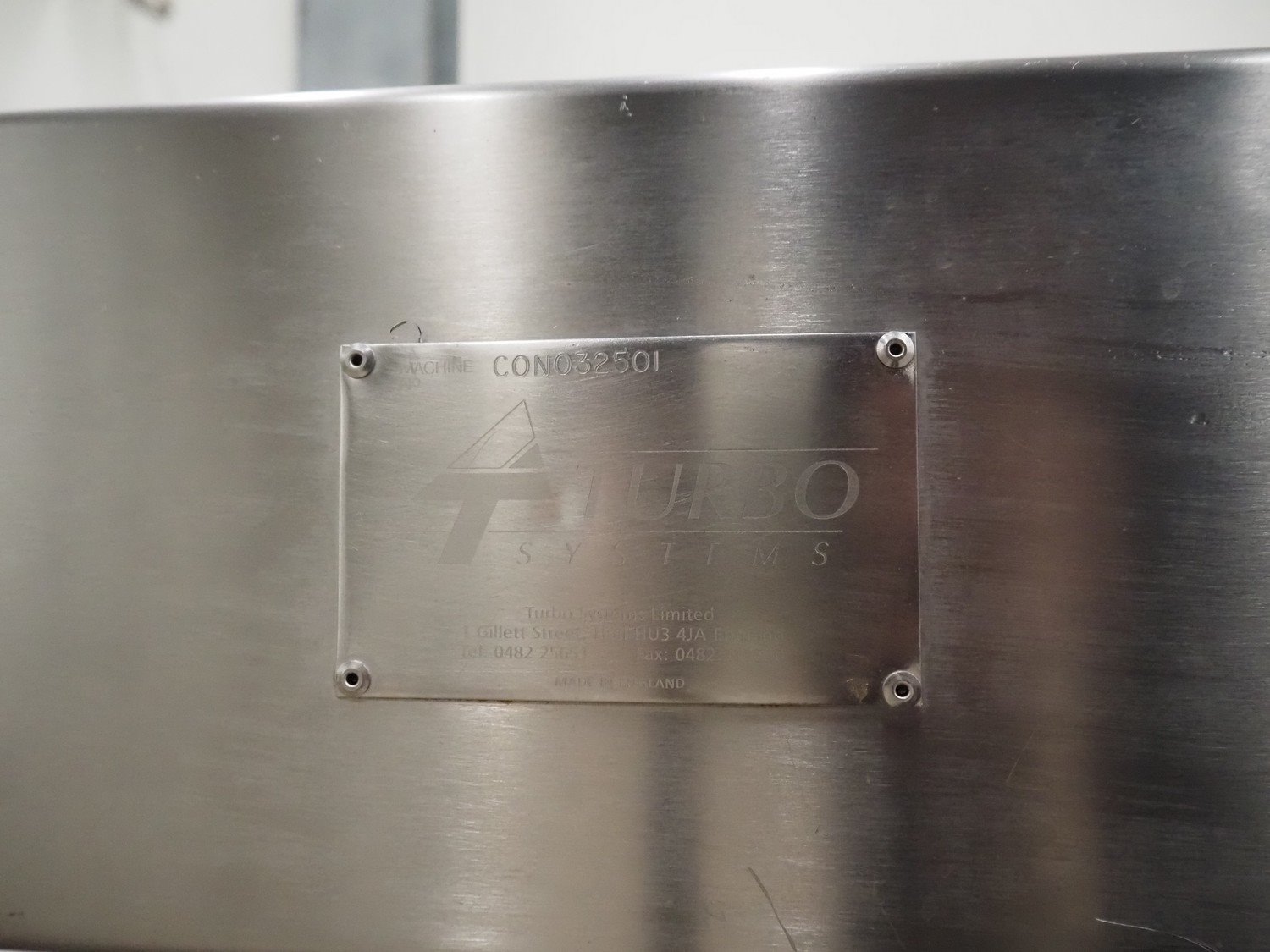 Turbo Systems Limited transport belt with denester, machine number: CONO32501, plastic belt, diameter cups: 115 mm, belt width: 240 mm, total dimensions: 3200 mm x 500 mm x 1800 mm. Kavel locatie: Bosscheweg 8, 5275 HB Den Dungen, Nederland
