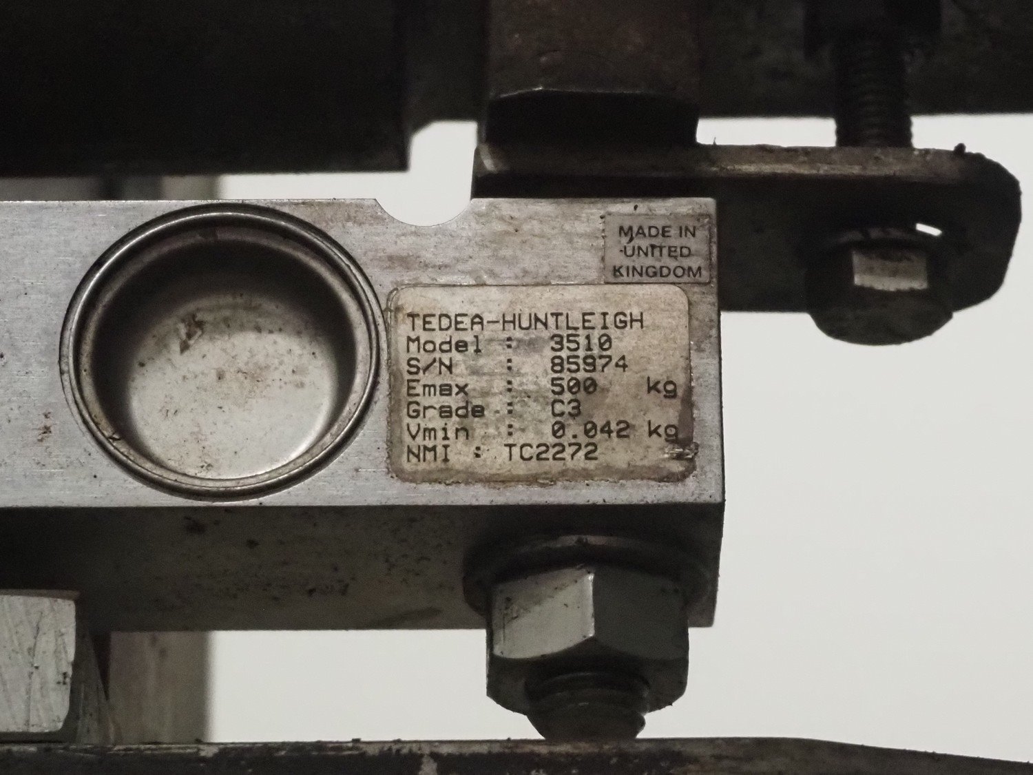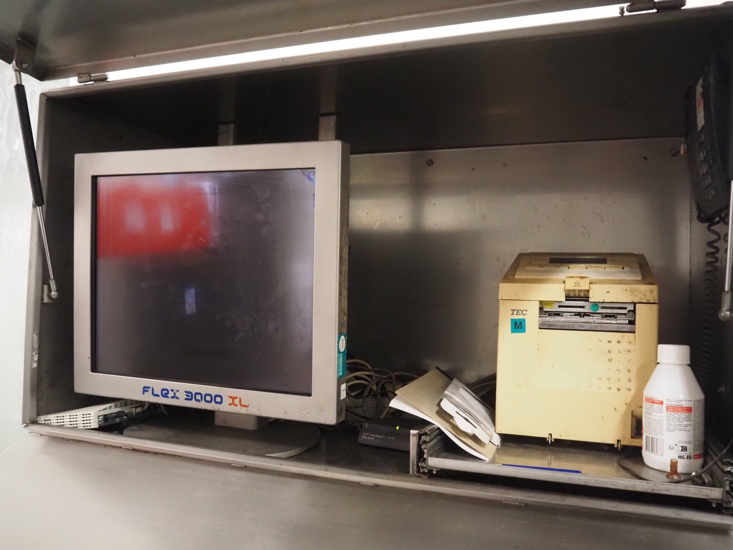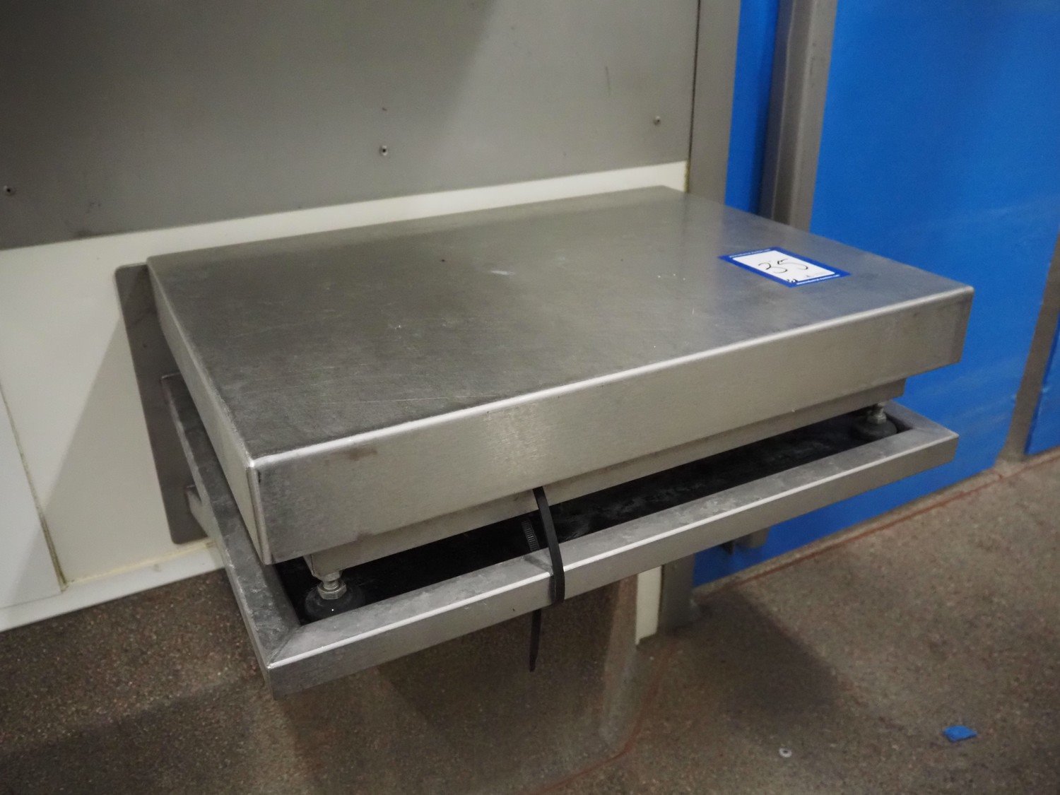 Tedea-Huntleigh tube rail weighing system, model: 3510, serial number': 85974, maximum weight: 500 kg, dimensions: 750 mm x 200 mm x 500 mm, s/s cabinet with indicator and label printer, dimensions: 1000 mm x 500 mm x 600 mm, weighing scale for crates, dimensions: 600 mm x 450 mm x 130 mm. Kavel locatie: Bosscheweg 8, 5275 HB Den Dungen, Nederland