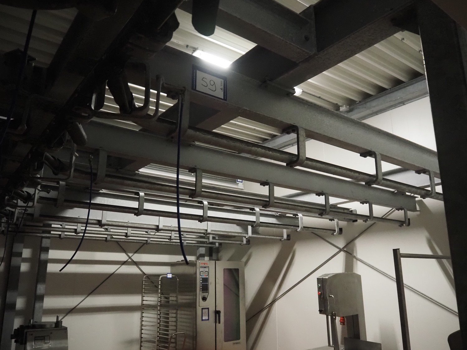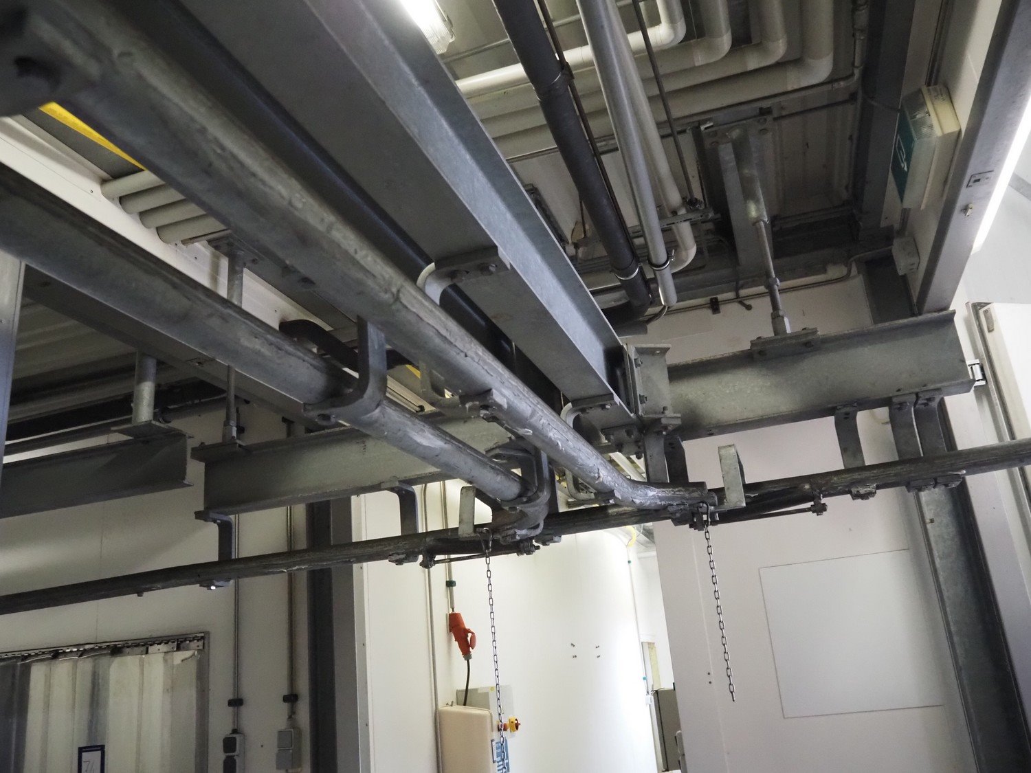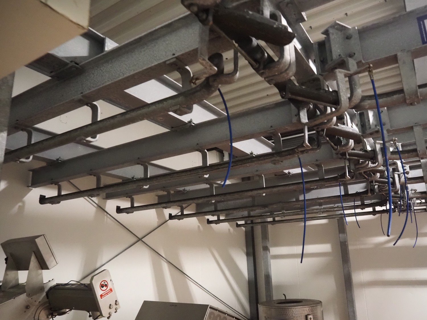 Steel tube rail overhead conveyor with infeed- and outfeed lane, length infeed lane: approximately 16 meter, (2x) 6 lanes, length: (6x) 4000 mm and (6x) 3000 mm, length outfeed lane: approximately 7 meter. Construction beams not included. Kavel locatie: Bosscheweg 8, 5275 HB Den Dungen, Nederland