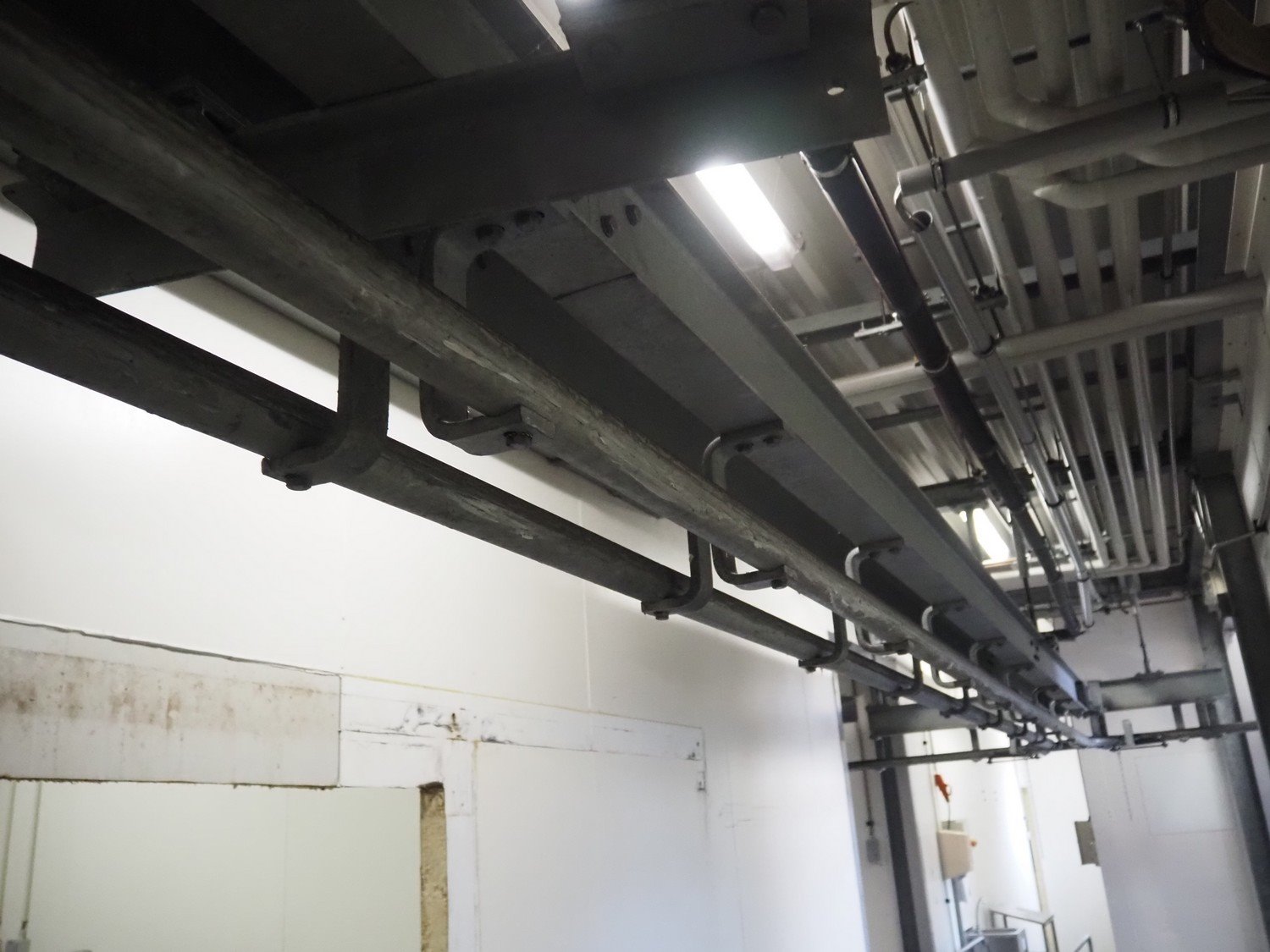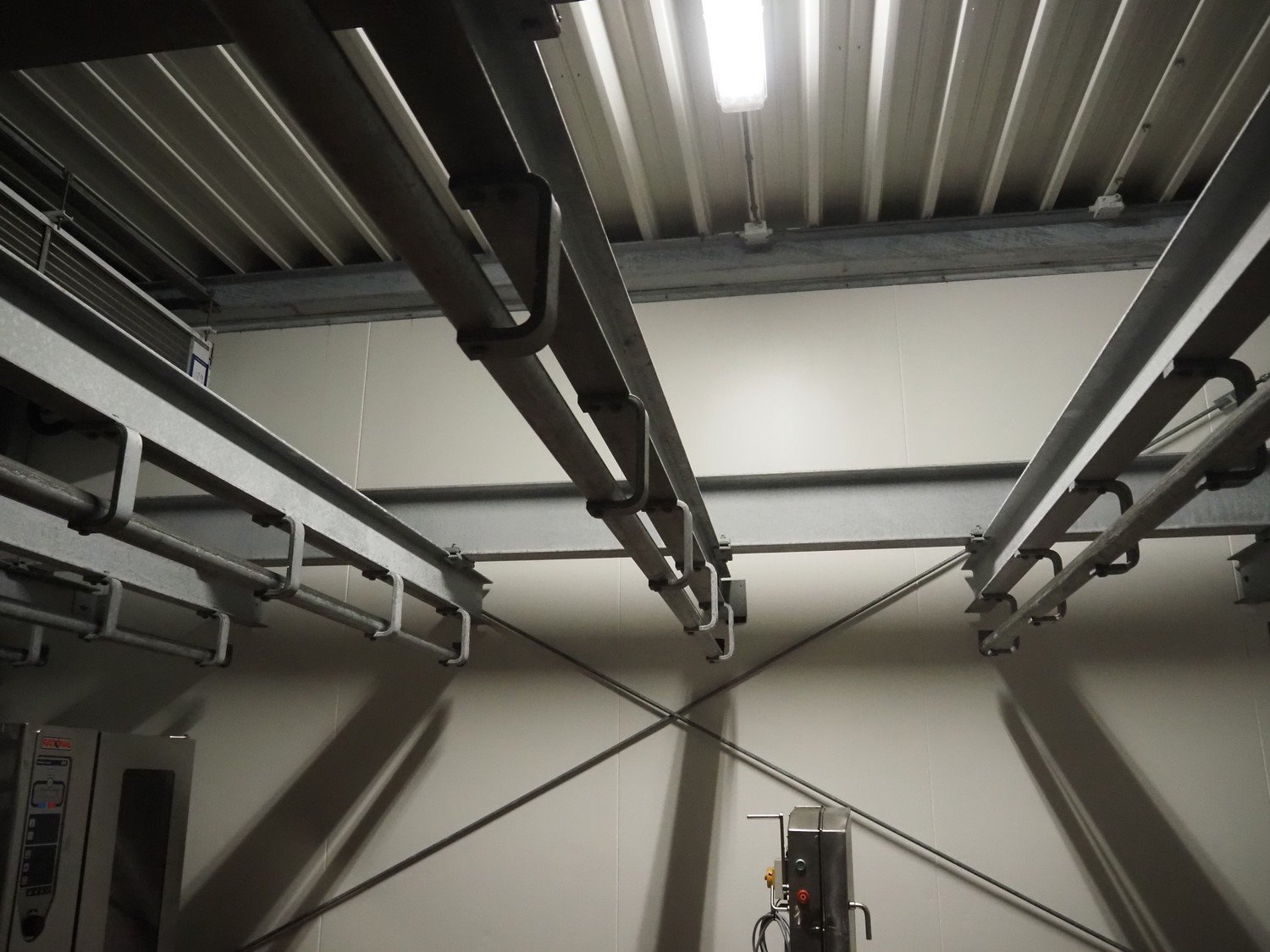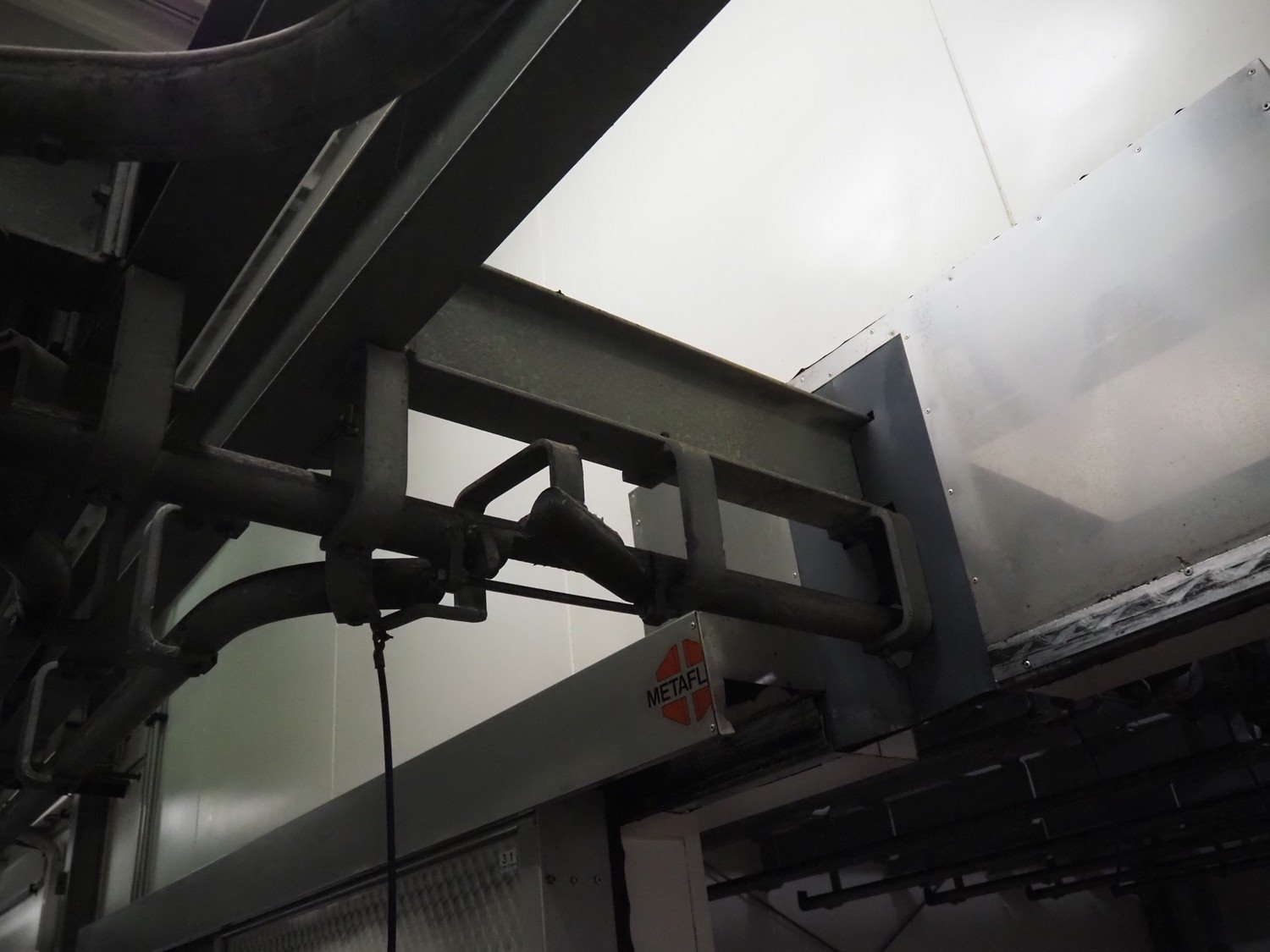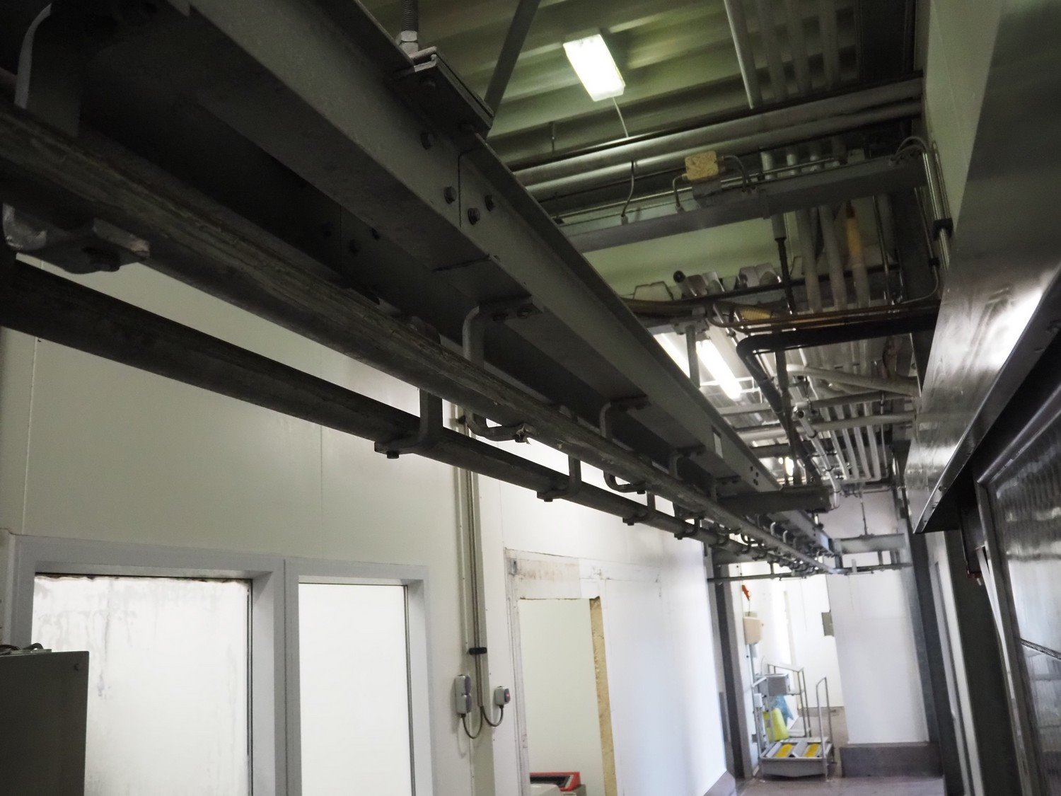 Steel tube rail overhead conveyor with infeed- and outfeed lane, length infeed lane: approximately 16 meter, (2x) 6 lanes, length: (6x) 4000 mm and (6x) 3000 mm, length outfeed lane: approximately 7 meter. Construction beams not included. Kavel locatie: Bosscheweg 8, 5275 HB Den Dungen, Nederland
