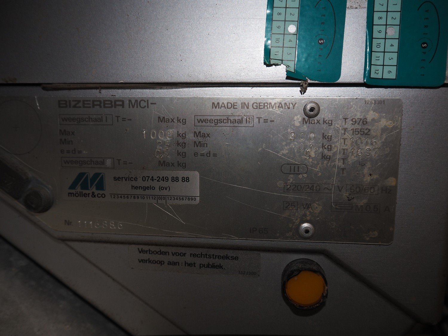 Bizerba weighing scale with indicator, type: MCI, number: 1116886, 220/240 V, 50/60 Hz, 0.5 A, maximum weight: 300/1000 kg, minimum weight: 0.1/25 kg, e=d= 0.5dimensions scale: 280 mm x 300 mm x 240 mm, dimensions indicator: 300 mm x 300 mm x 200 mm. Kavel locatie: Bosscheweg 8, 5275 HB Den Dungen, Nederland