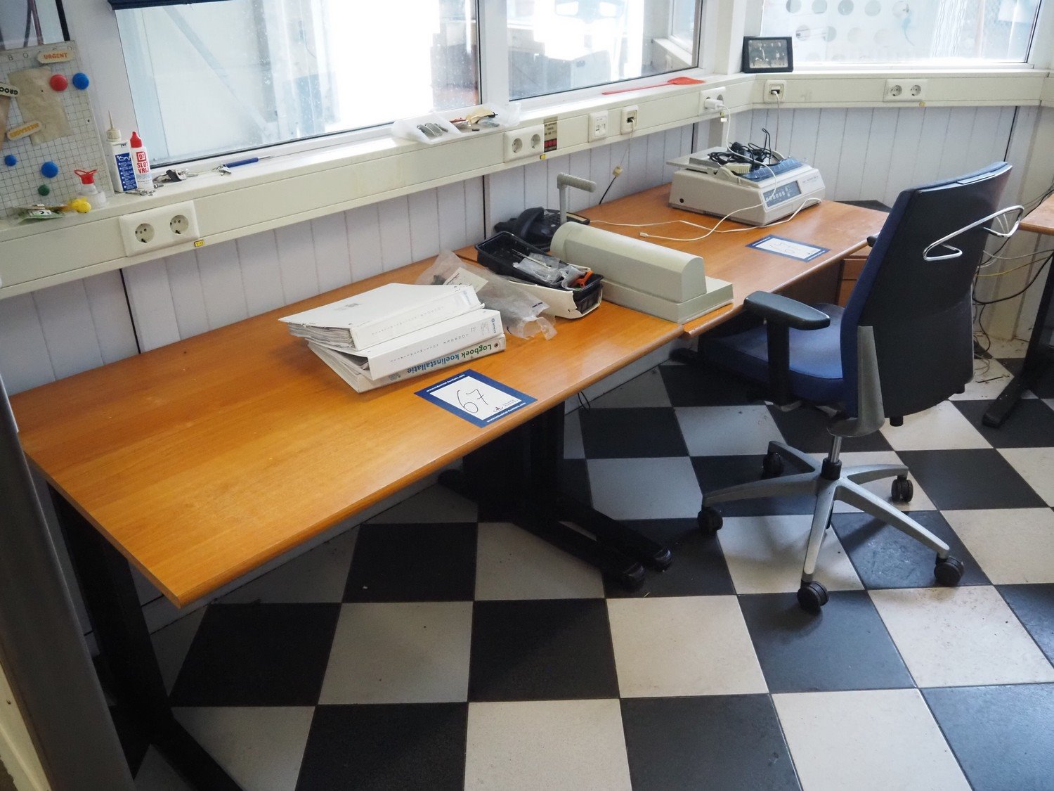 Office inventory consisting of: 3 wooden office tables, dimensions: (3x) 1200 mm x 800 mm x 700 mm, 2 steel drawers, dimensions: (2x) 450 mm x 600 mm x 1000 mm, wooden drawers, dimensions: 440 mm x 600 mm x 550 mm, office chair. Kavel locatie: Bosscheweg 8, 5275 HB Den Dungen, Nederland