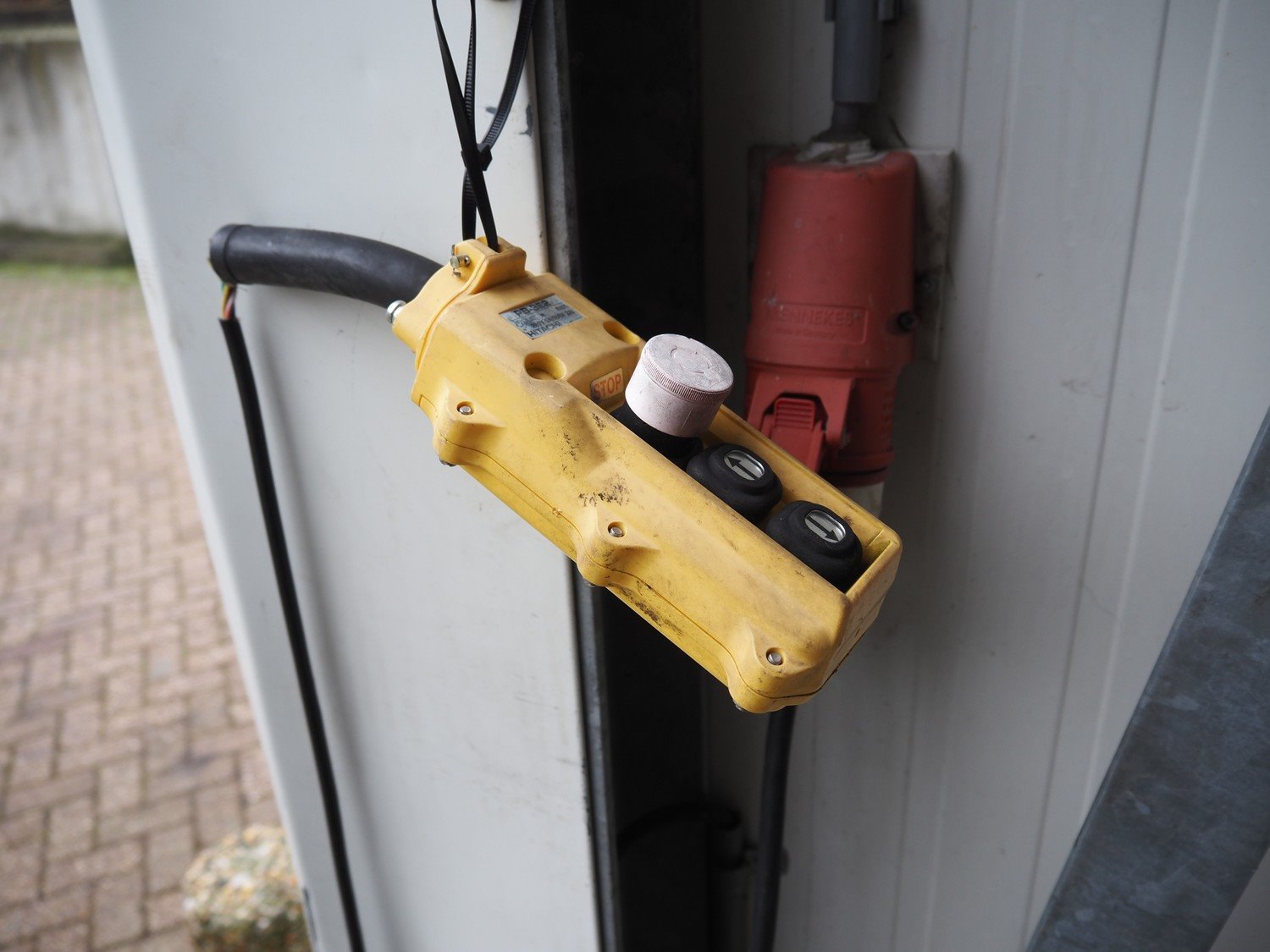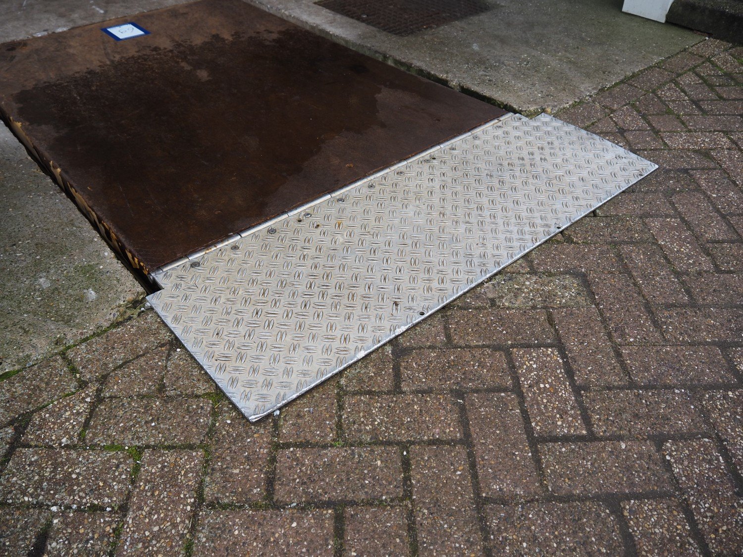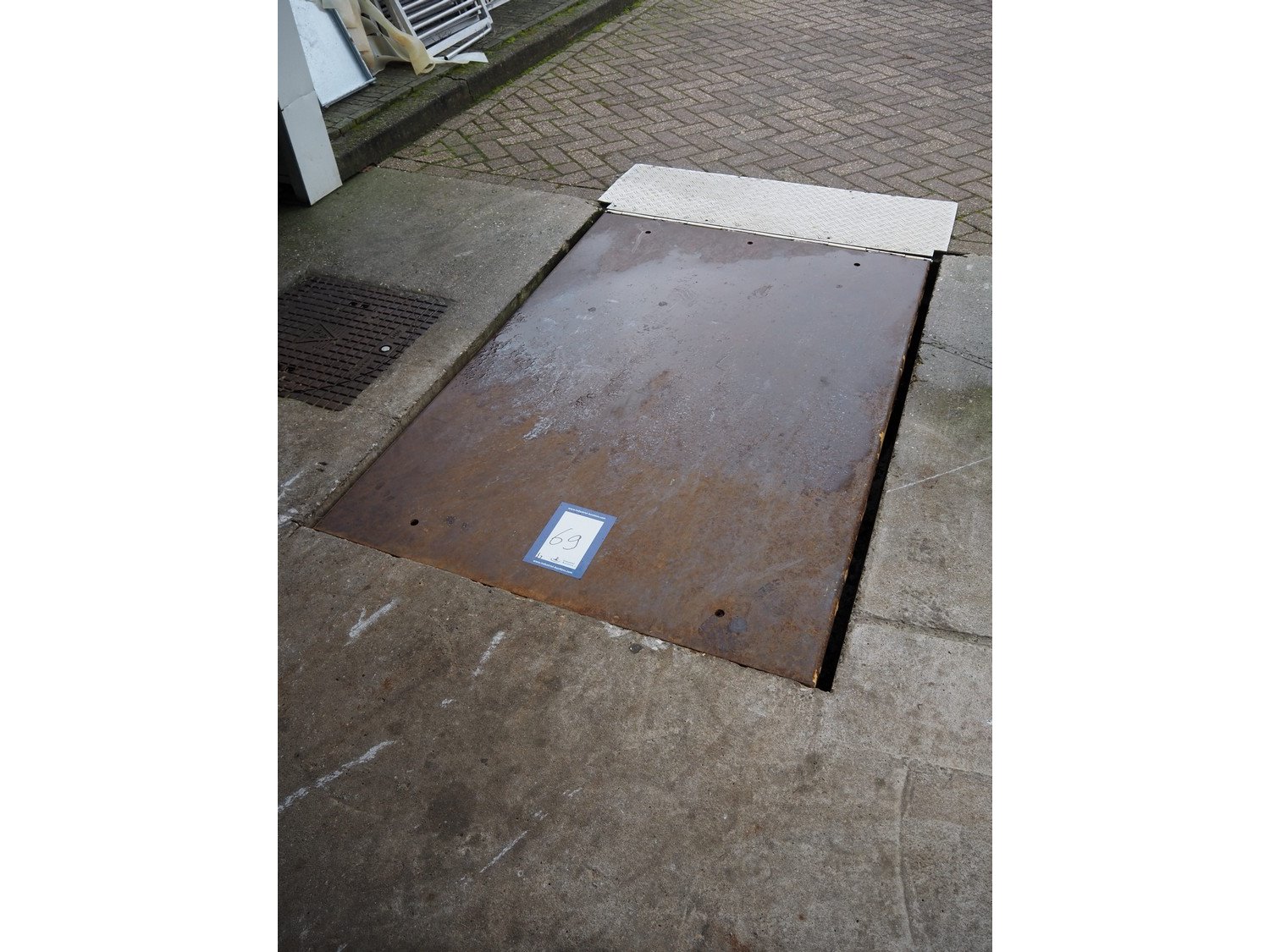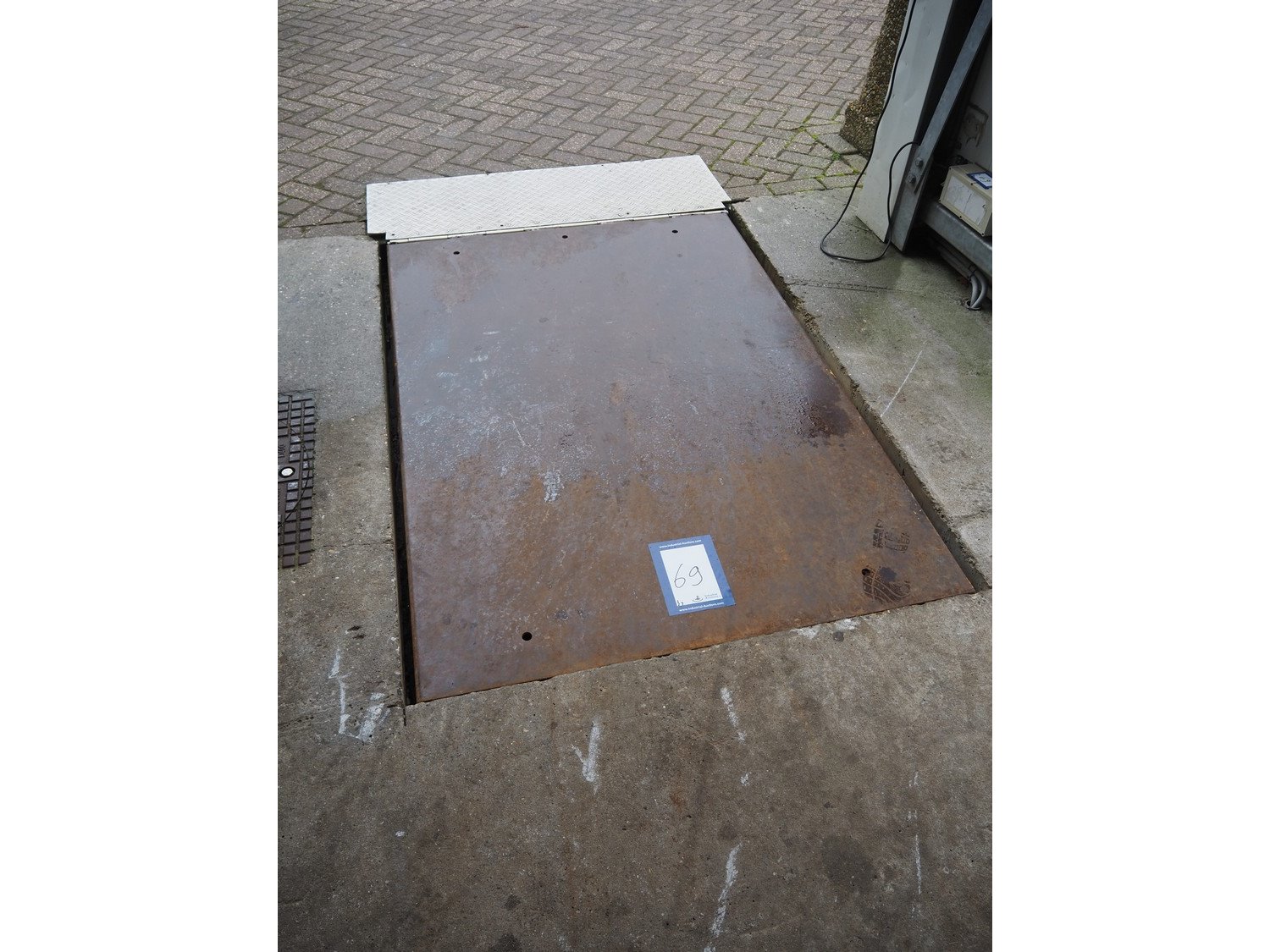 Steel electric driven loading ramp with Hitachi control panel, dimensions loading ramp: 2200 mm x 1200 mm. Kavel locatie: Bosscheweg 8, 5275 HB Den Dungen, Nederland