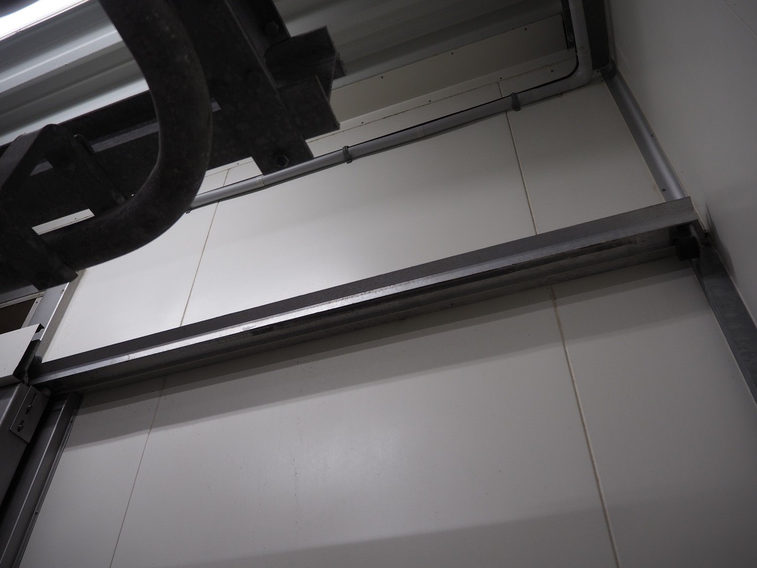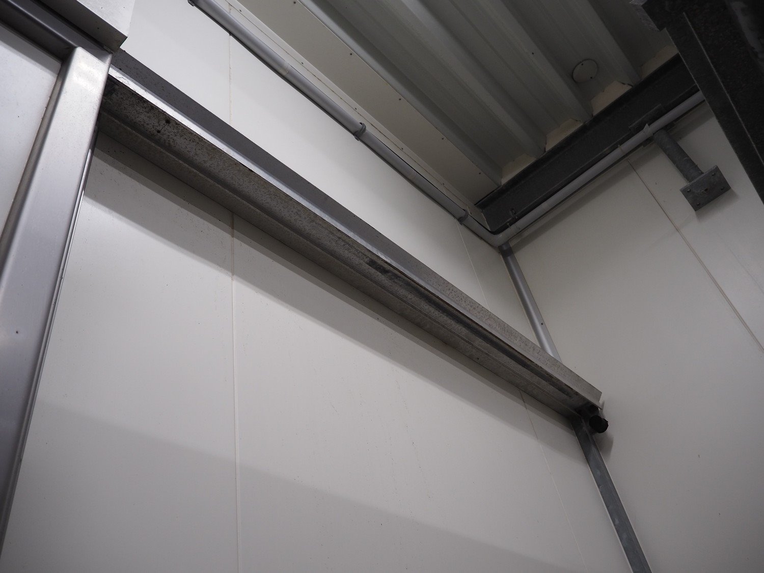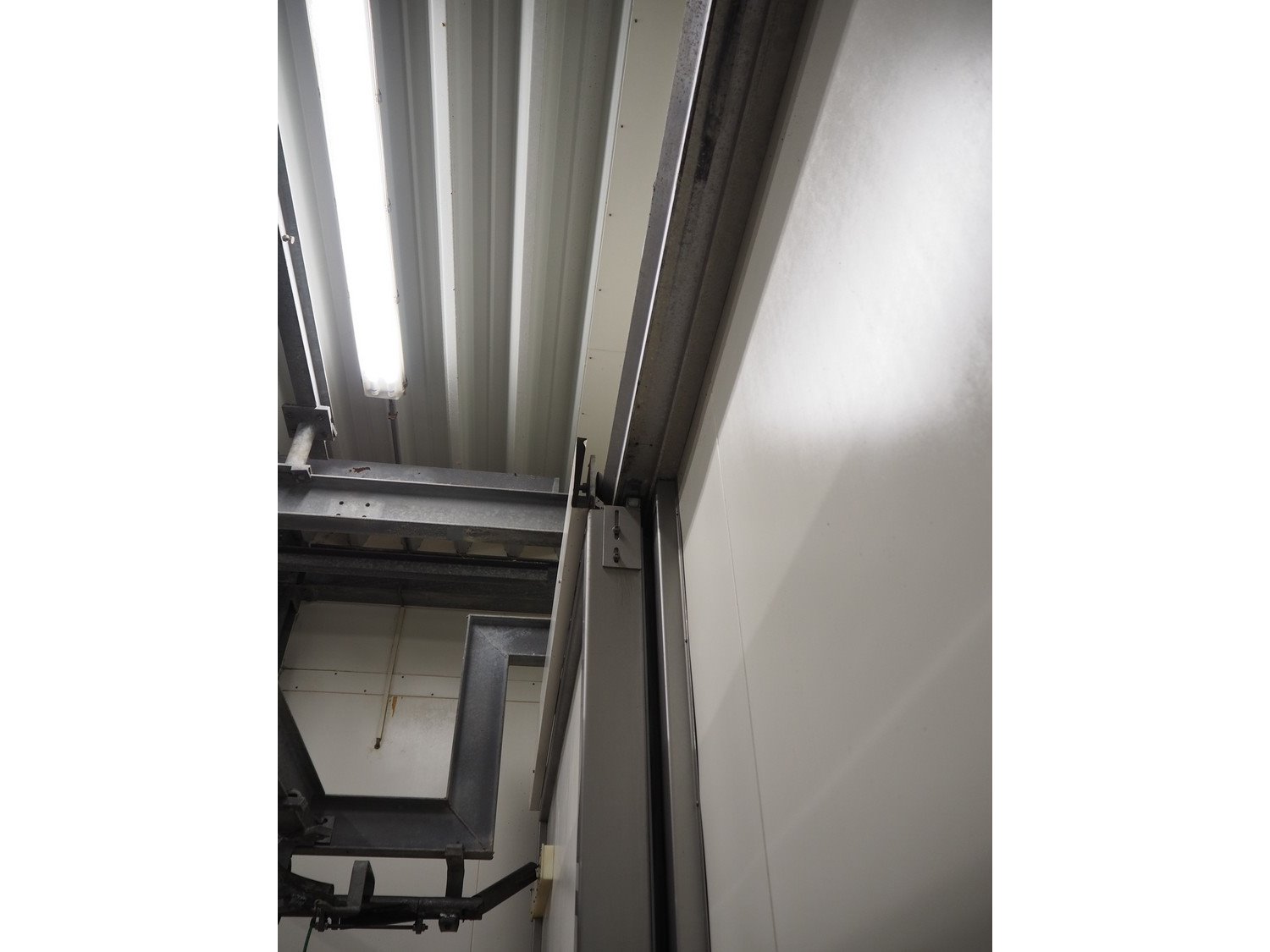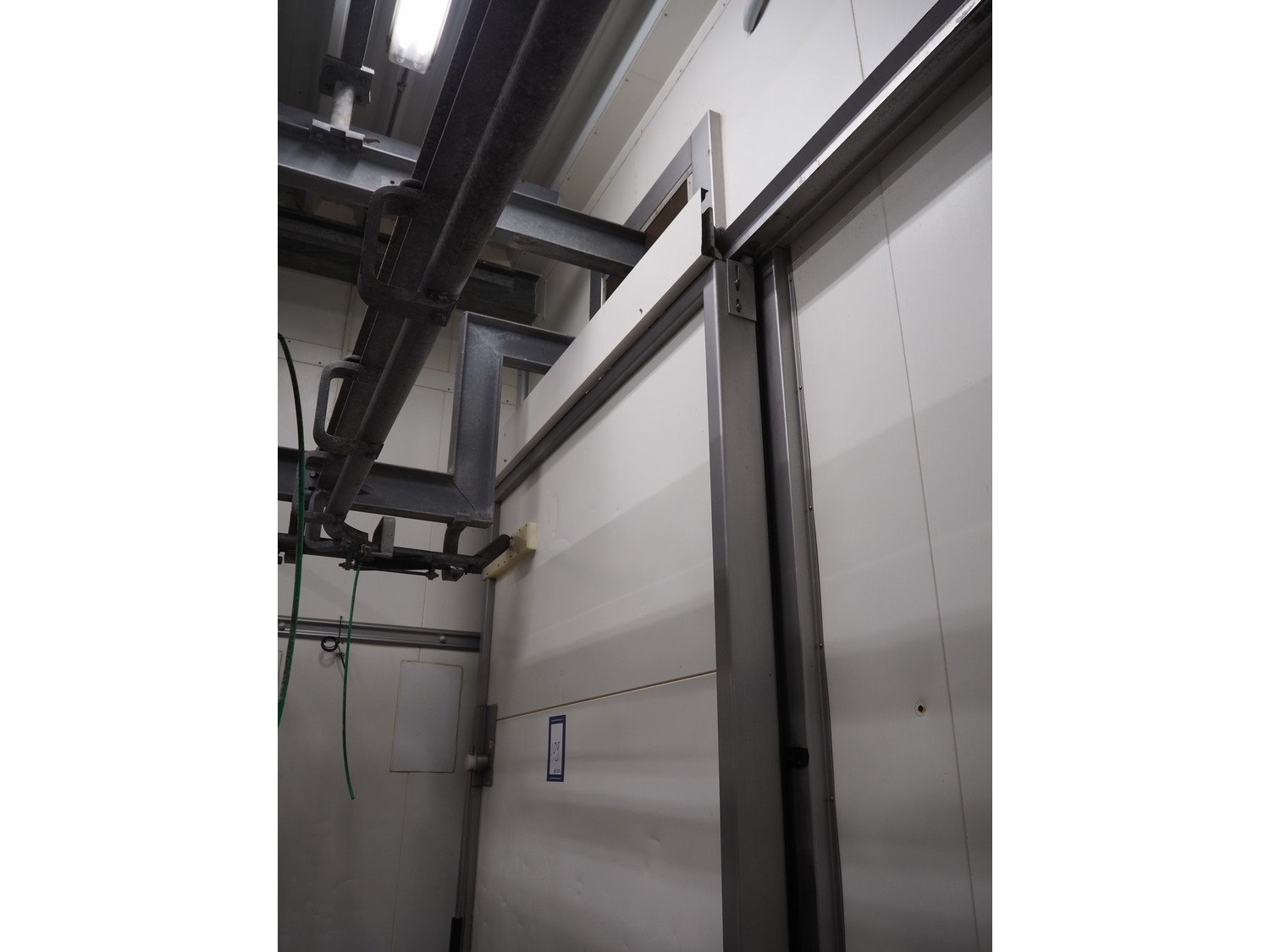 S/s refrigeration sliding door, dimensions door: 1900 mm x 3000 mm, thickness: 115 mm, rail length: 3850 mm. Kavel locatie: Bosscheweg 8, 5275 HB Den Dungen, Nederland
