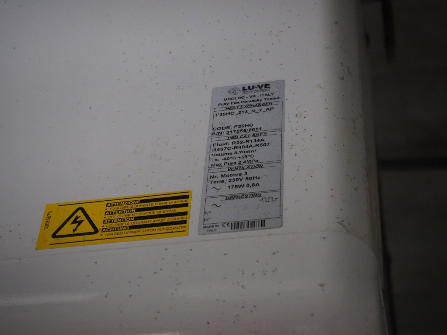 LU-VE evaporator, type: F35HC_213_N_7_AP, serial number: 317256/2011, 230 V, 50 Hz, 175 W, 0.8 A, refrigerant: R22/R134a/R407c/R404a/R507, dimensions: 2000 mm x 400 mm x 500 mm. Kavel locatie: Bosscheweg 8, 5275 HB Den Dungen, Nederland