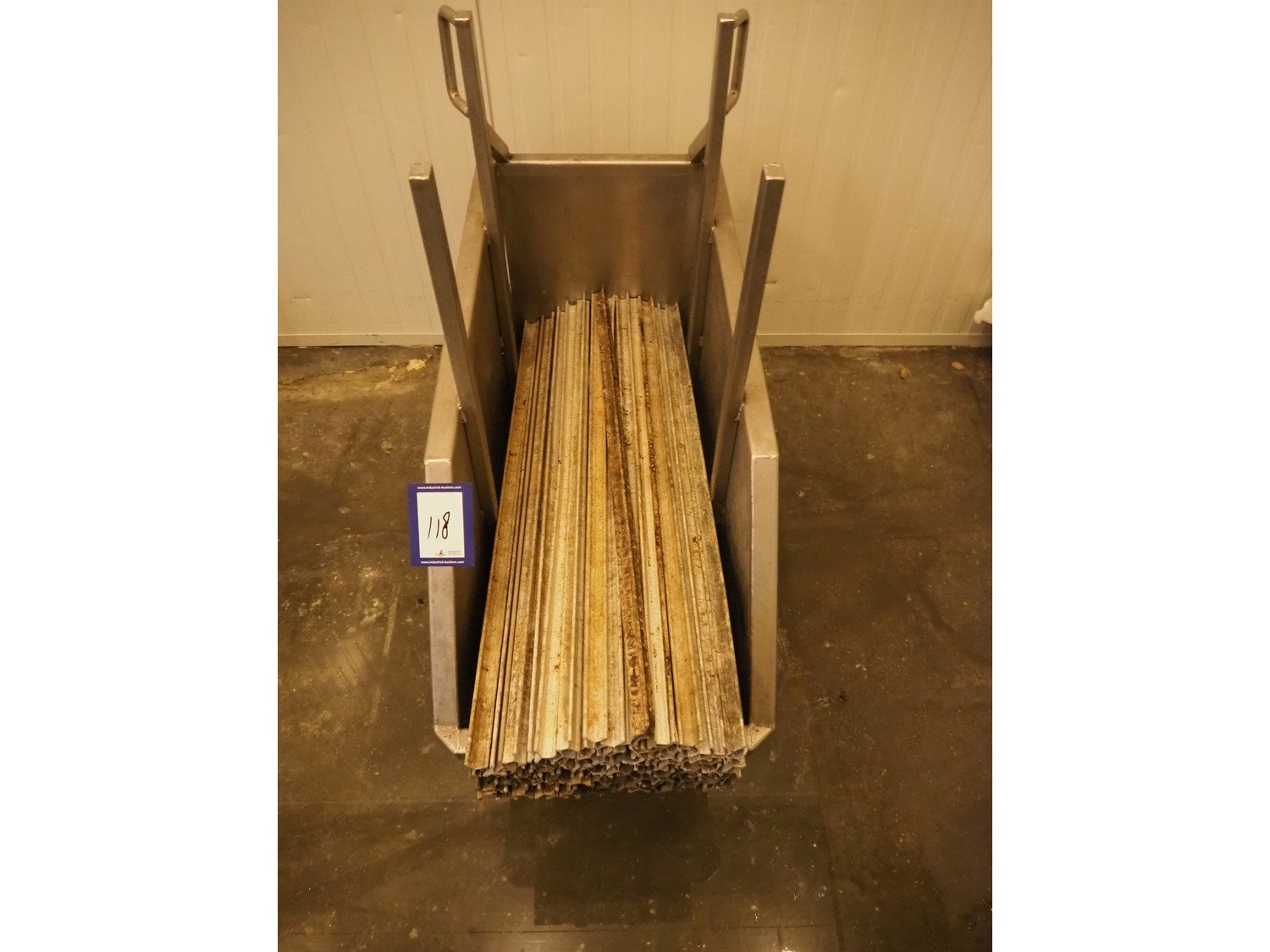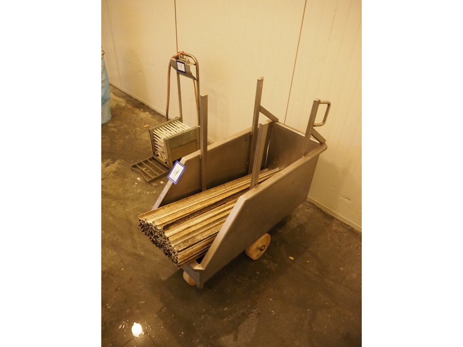 S/s trolley with large amount of Y-shaped smoke sticks, length each smoke stick: 1000 mm, total dimensions: 1000 mm x 420 mm x 900 mm. Kavel locatie: Bosscheweg 8, 5275 HB Den Dungen, Nederland