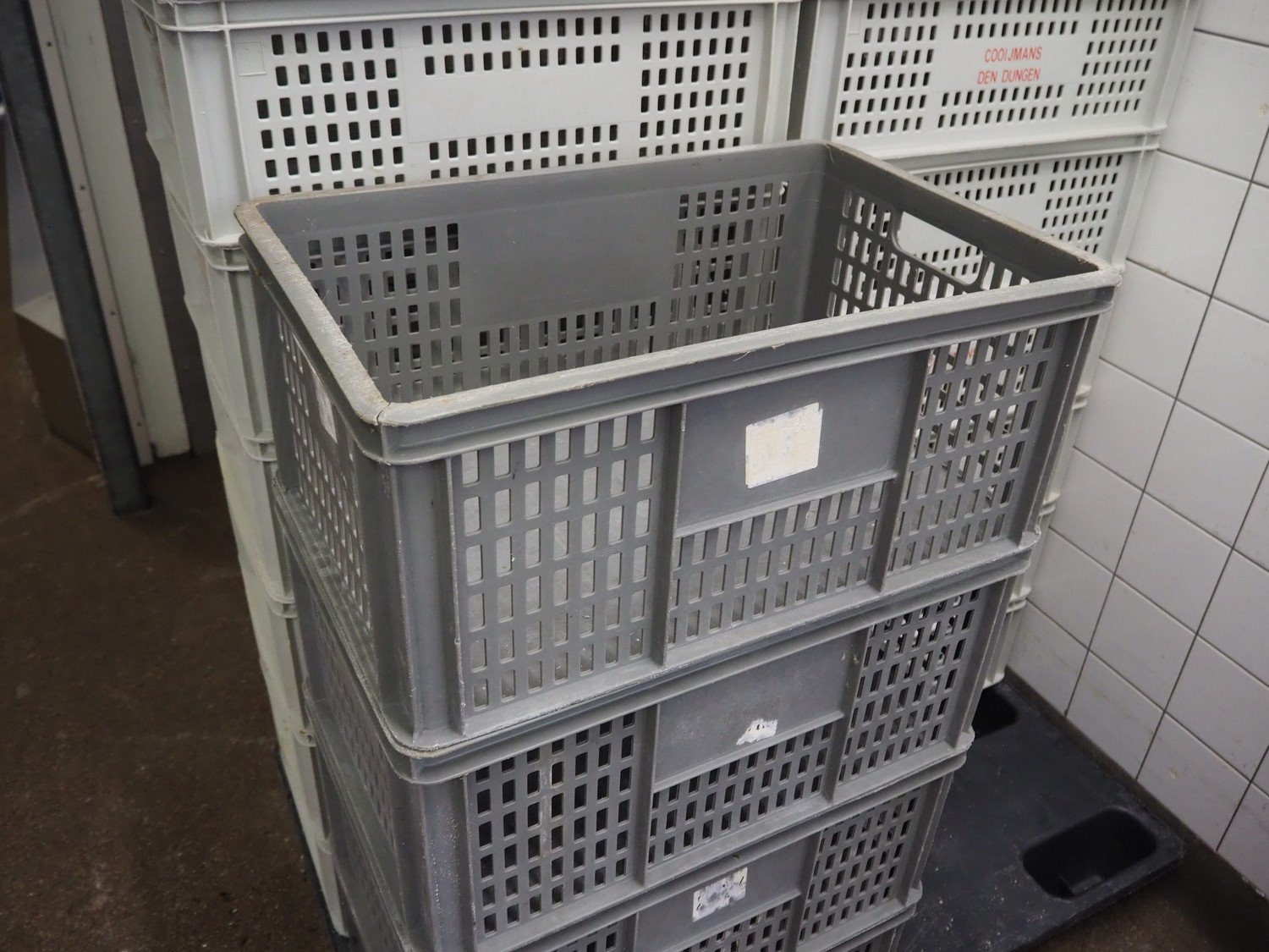 23 plastic crates, dimensions: (19x) 600 mm x 400 mm x 190 mm, dimensions: (4x) 600 mm x 400 mm x 250 mm. Kavel locatie: Bosscheweg 8, 5275 HB Den Dungen, Nederland