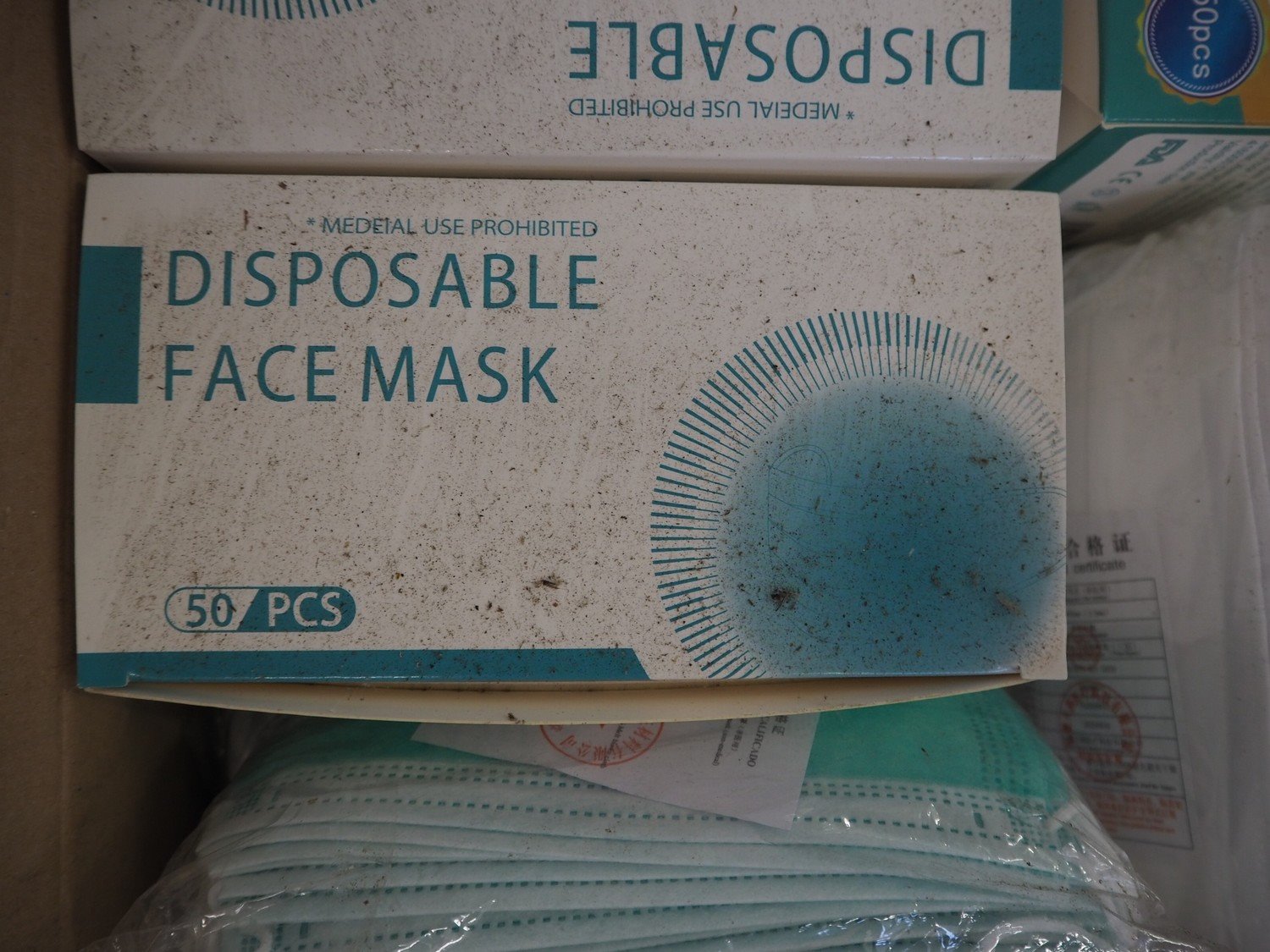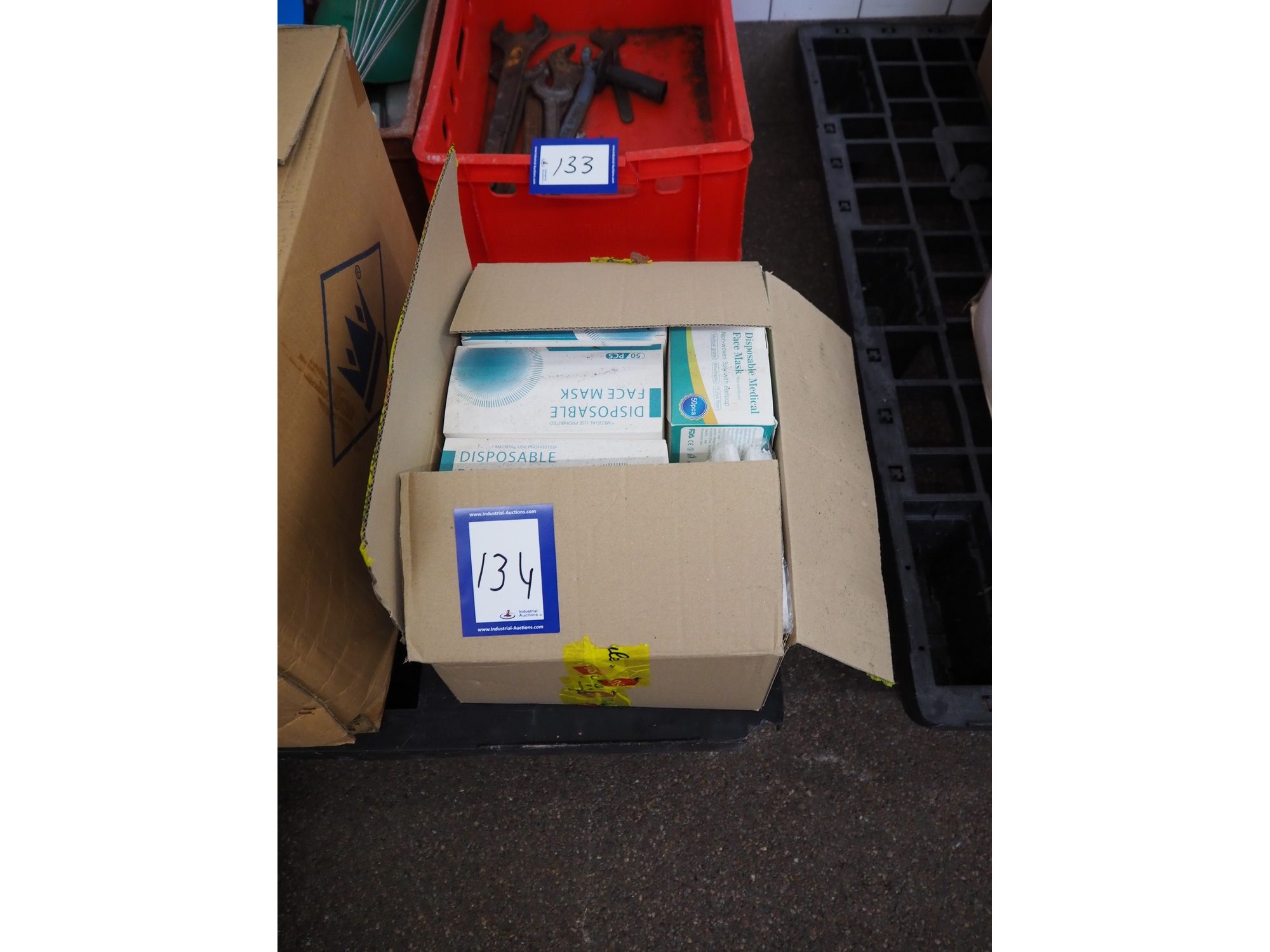 Box with large amount of disposable face masks. Kavel locatie: Bosscheweg 8, 5275 HB Den Dungen, Nederland