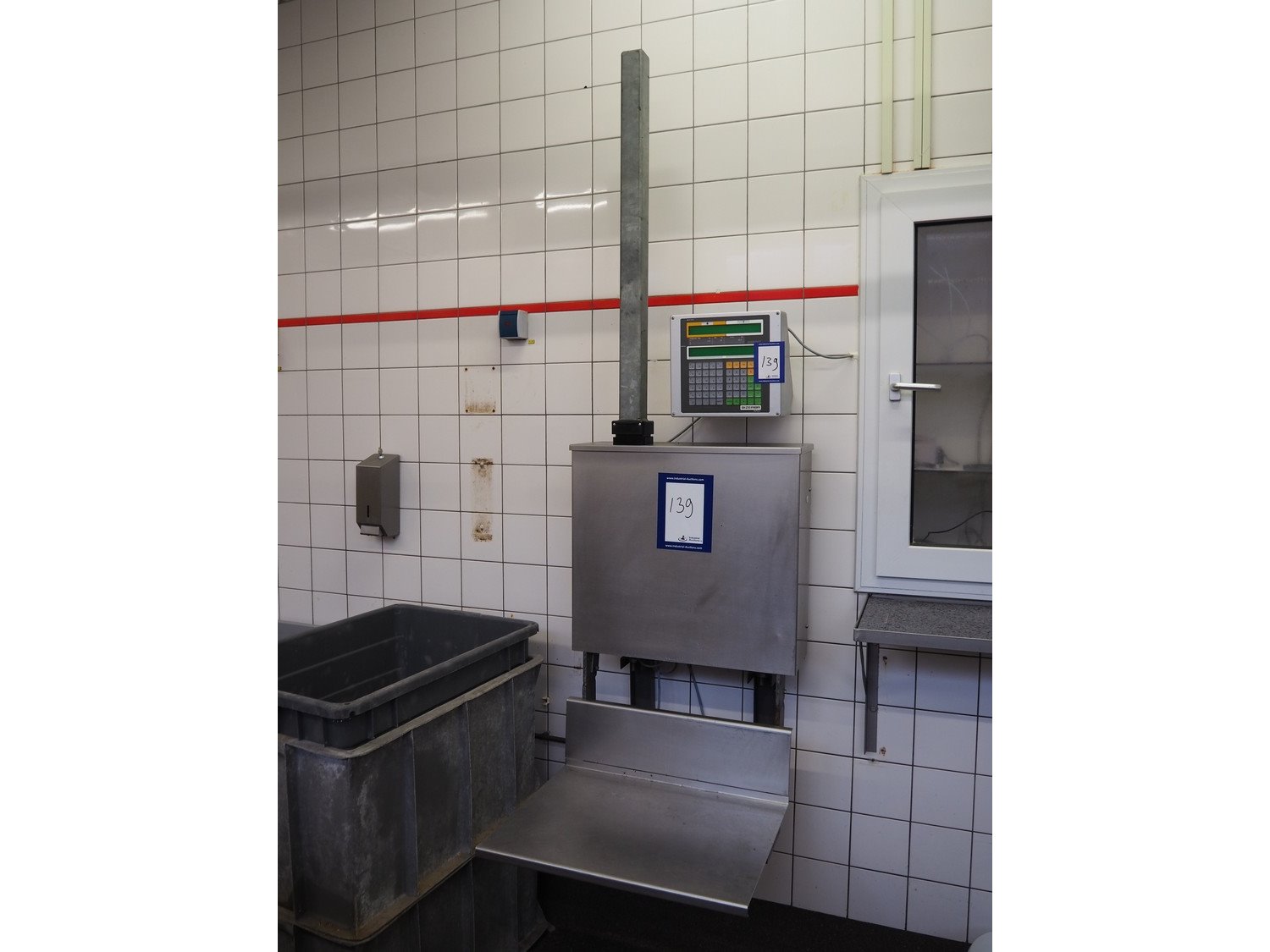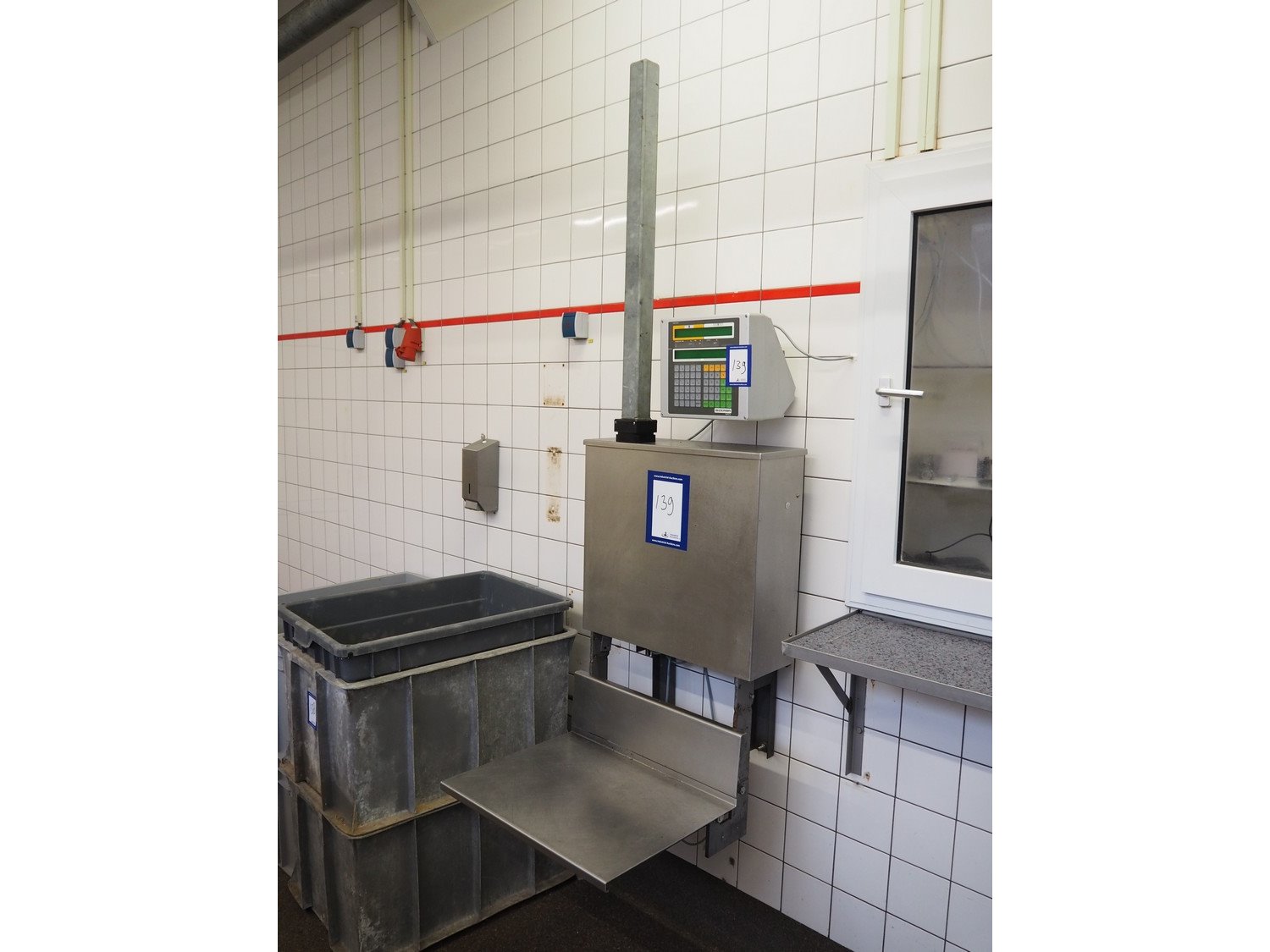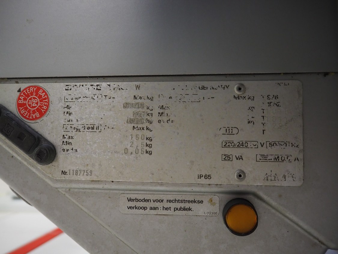 Bizerba weighing scale with indicator, number: 1187759, maximum weight: 150 kg, minimum weight: 2.5 kg, e=d=0.05 kg, dimensions weighing scale: 750 mm x 600 mm x 1000 mm, indicator: 280 mm x 240 mm x 260 mm. Kavel locatie: Bosscheweg 8, 5275 HB Den Dungen, Nederland